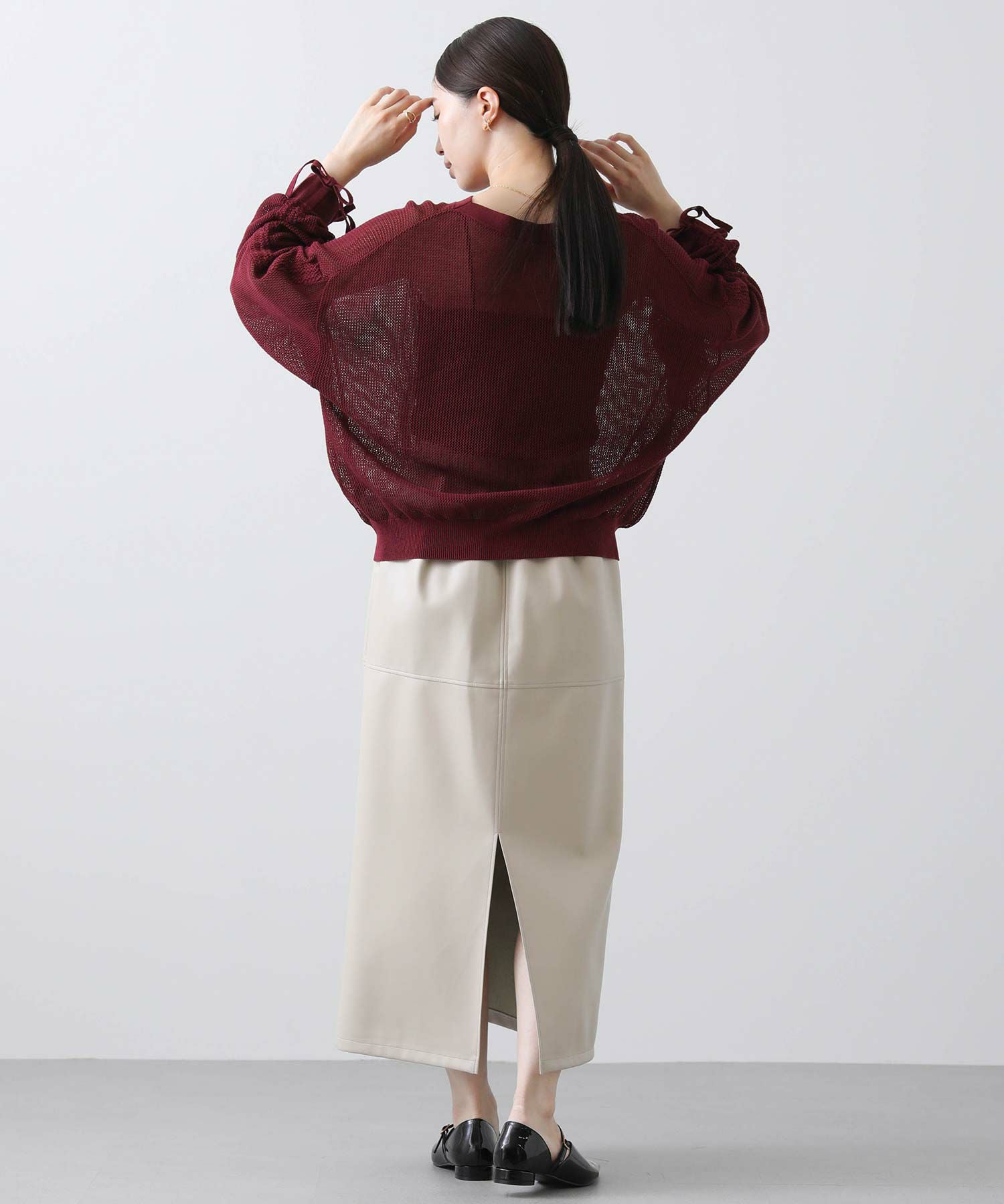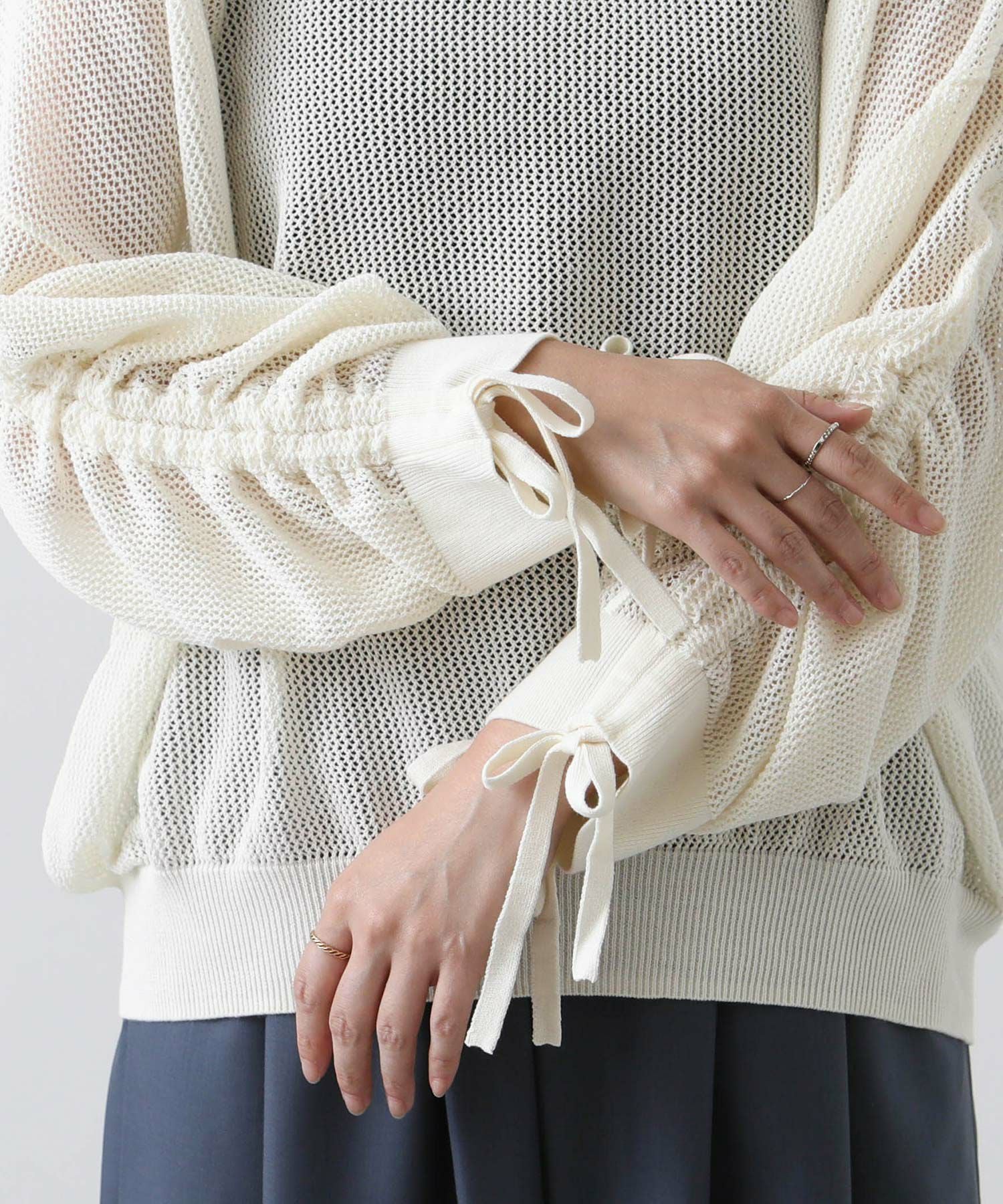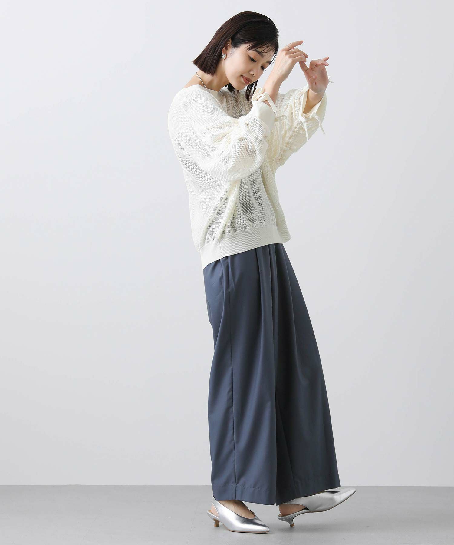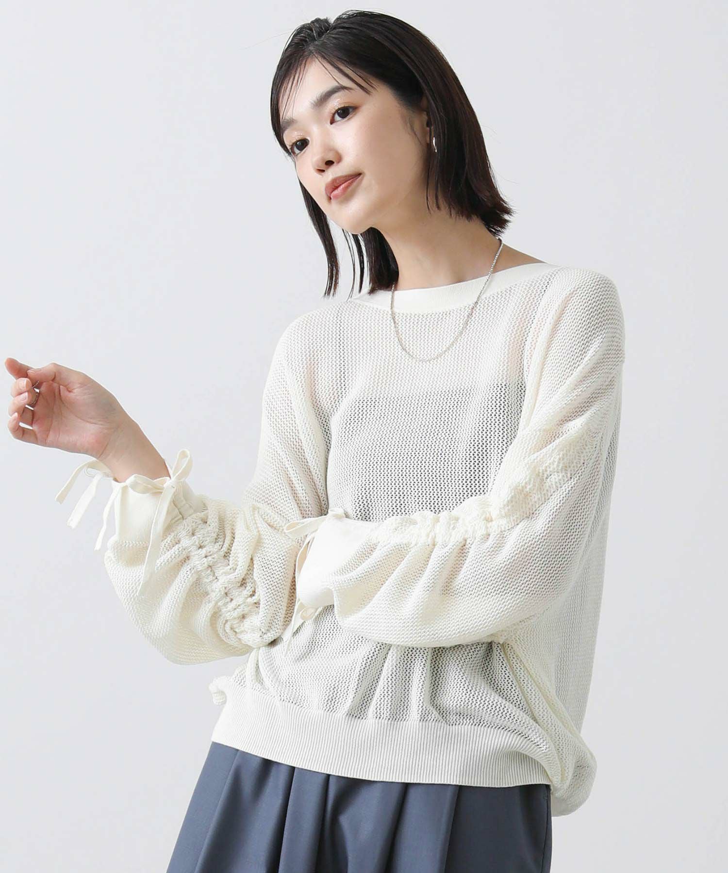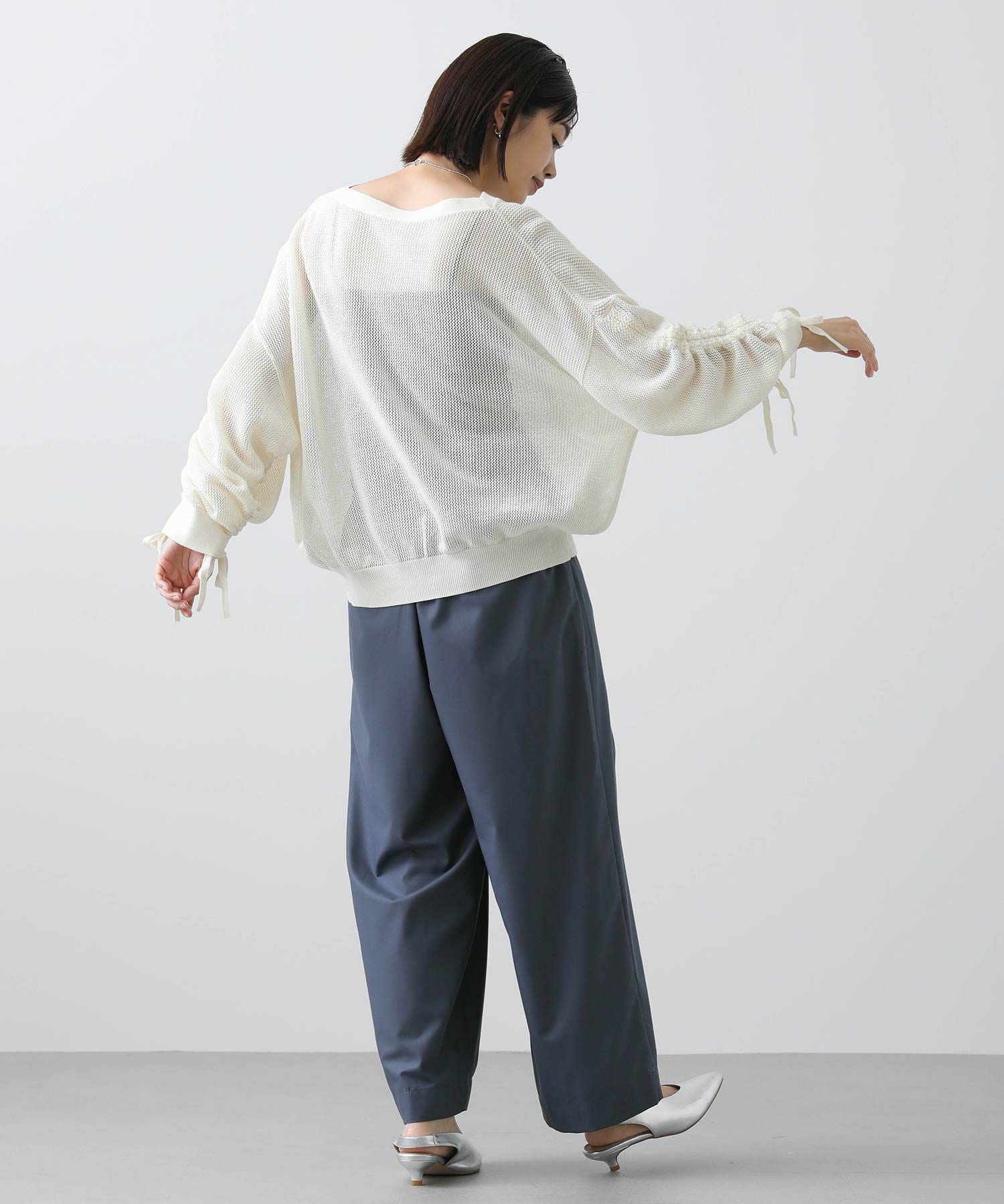 ワイドシルエットのメッシュ編みニット。