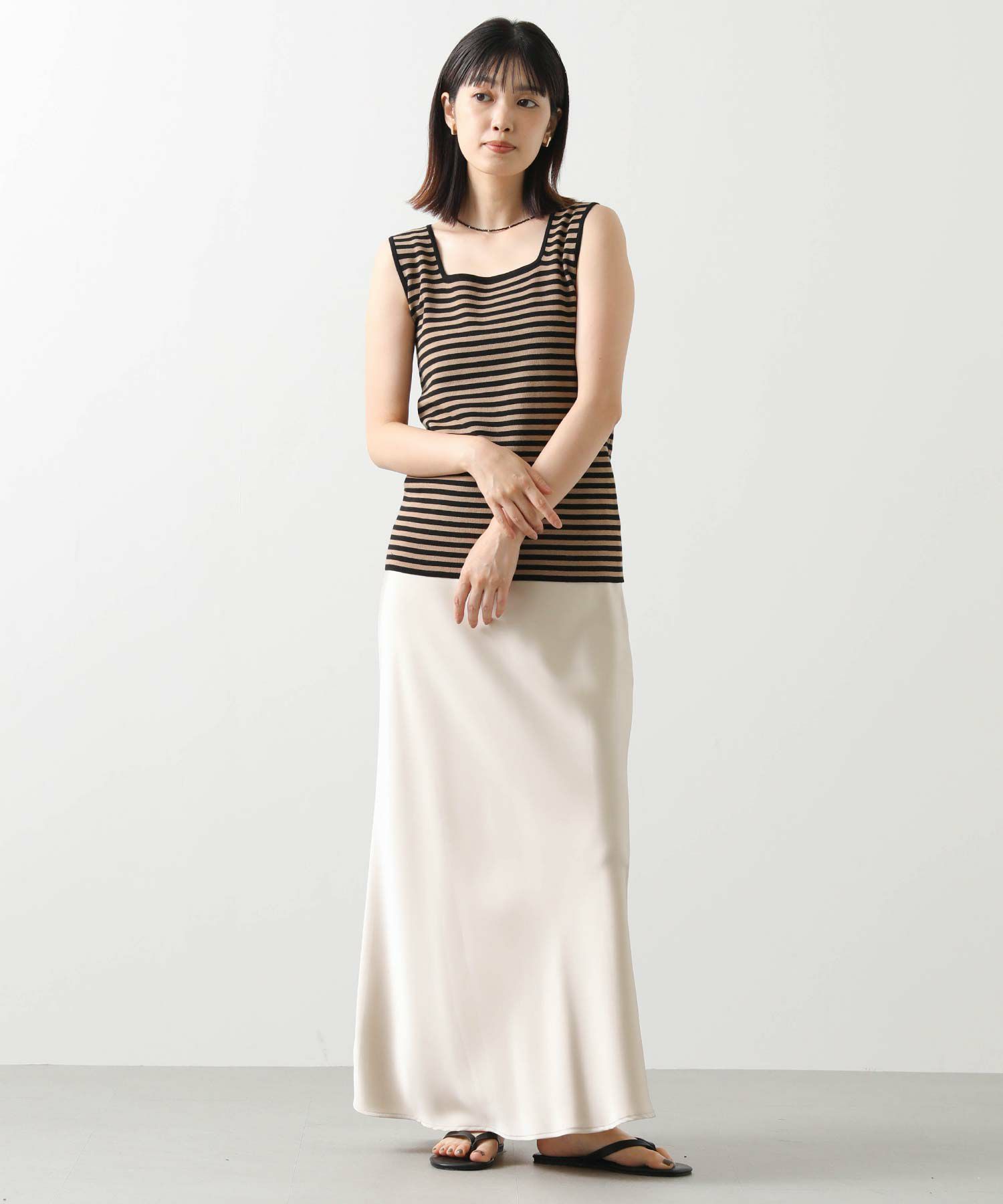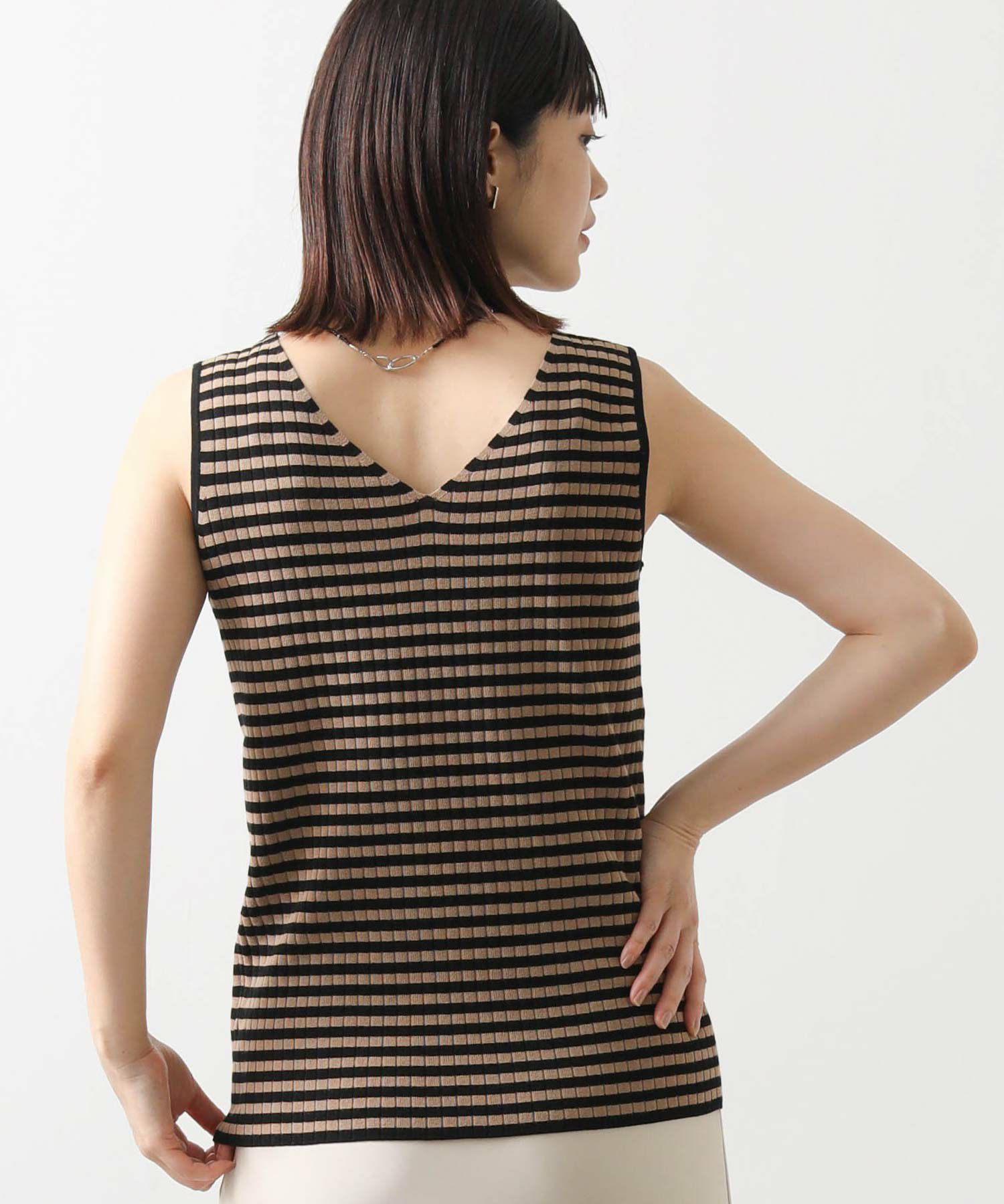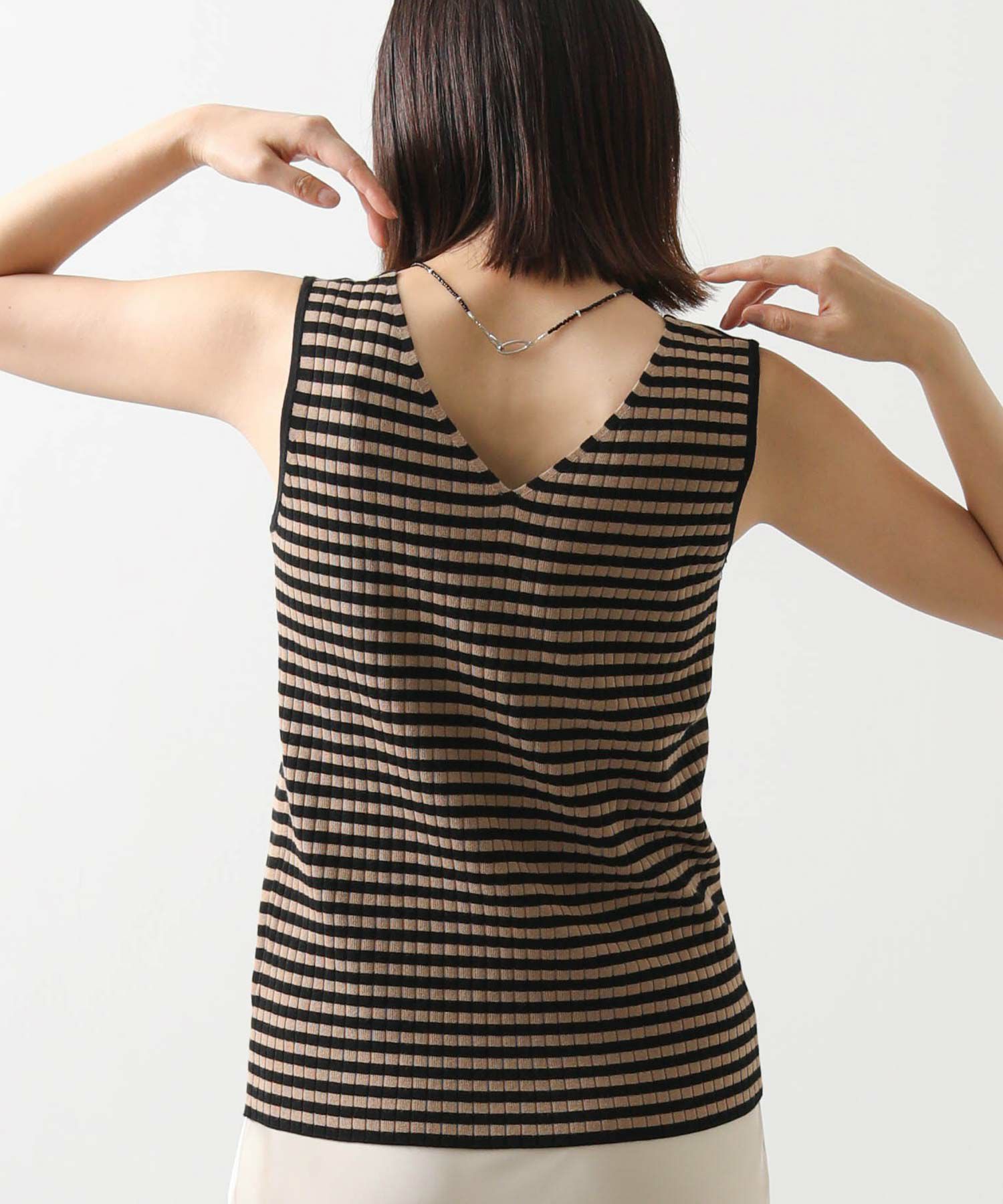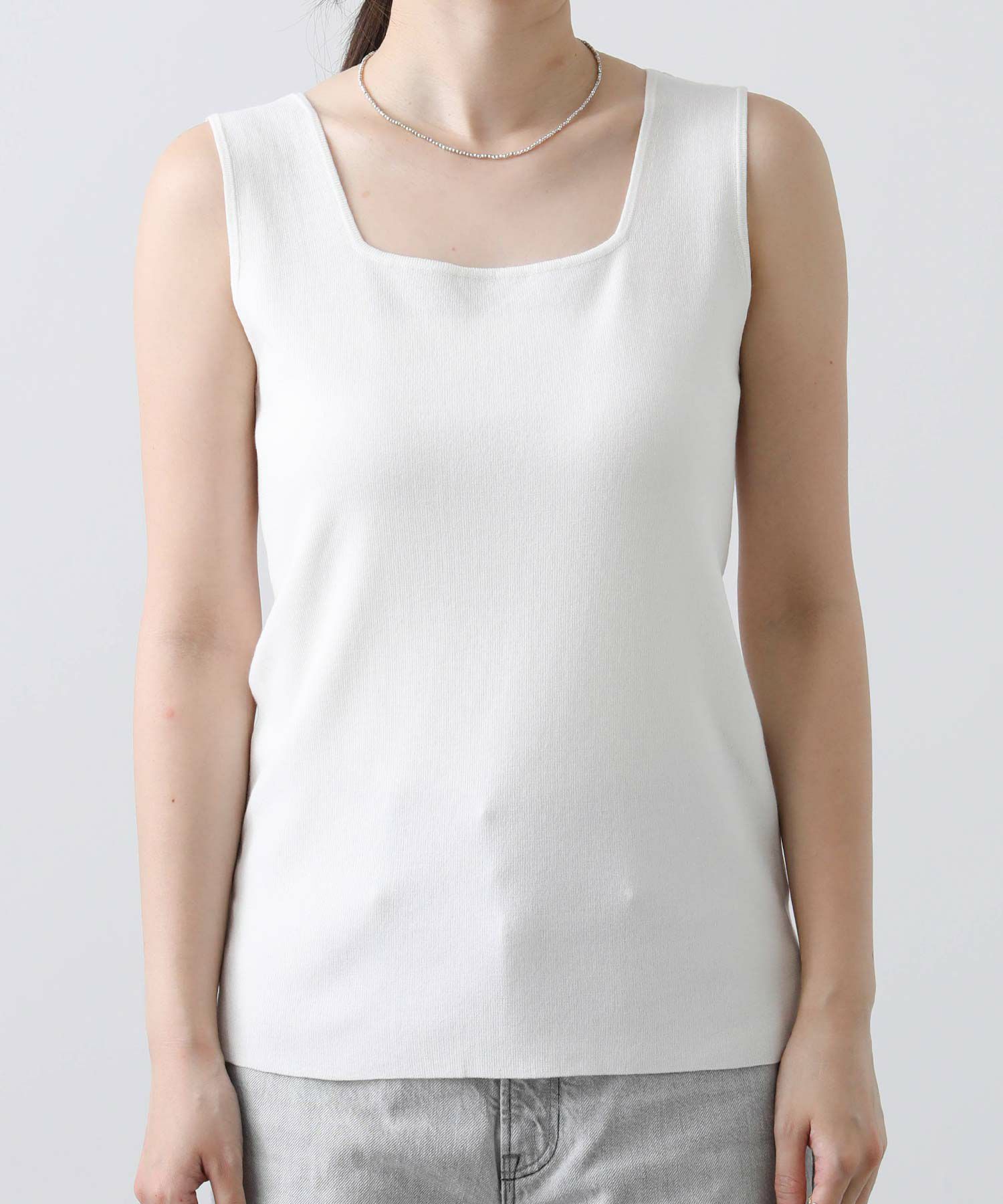 デコルテがキレイに見えるスクエアネックと、顔周りがスッキリ見えるVネックの、前後2WAYで楽しめるニットタンク。