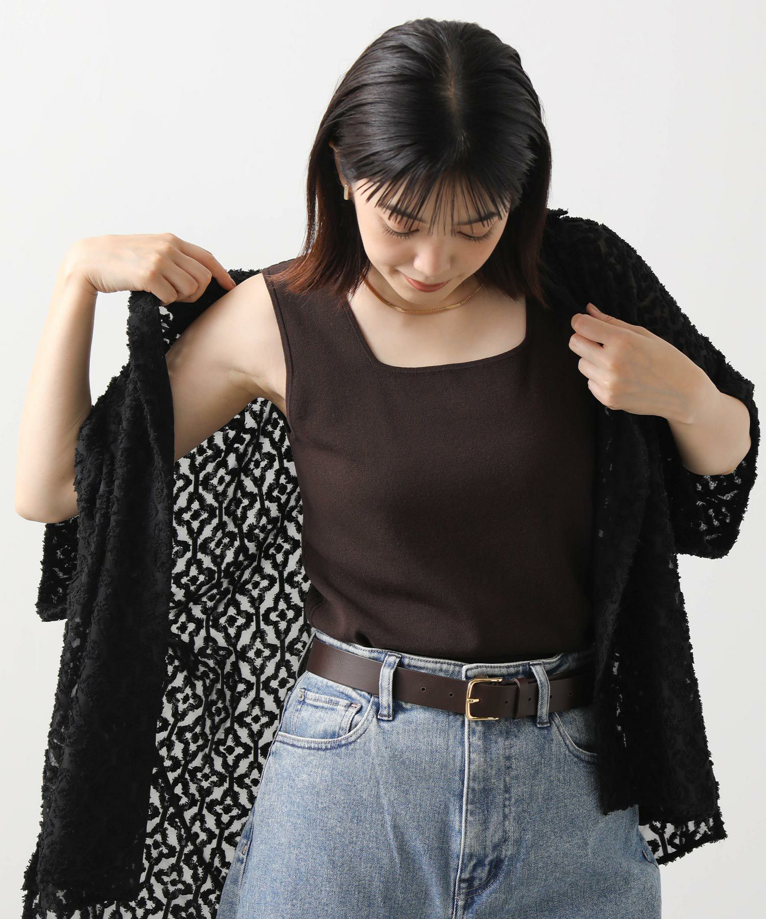 きれいめにもカジュアルにも合わせやすい、デイリーコーデに大活躍する1枚。キャミワンピやシャツのインナーに合わせるのもオススメな“見せたい”インナーです。