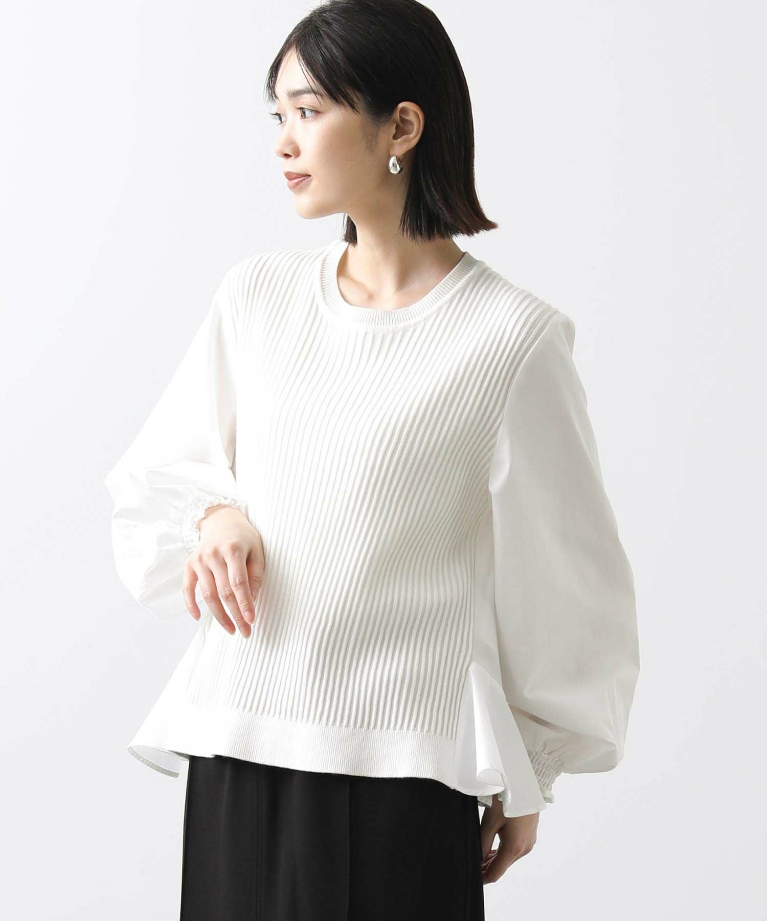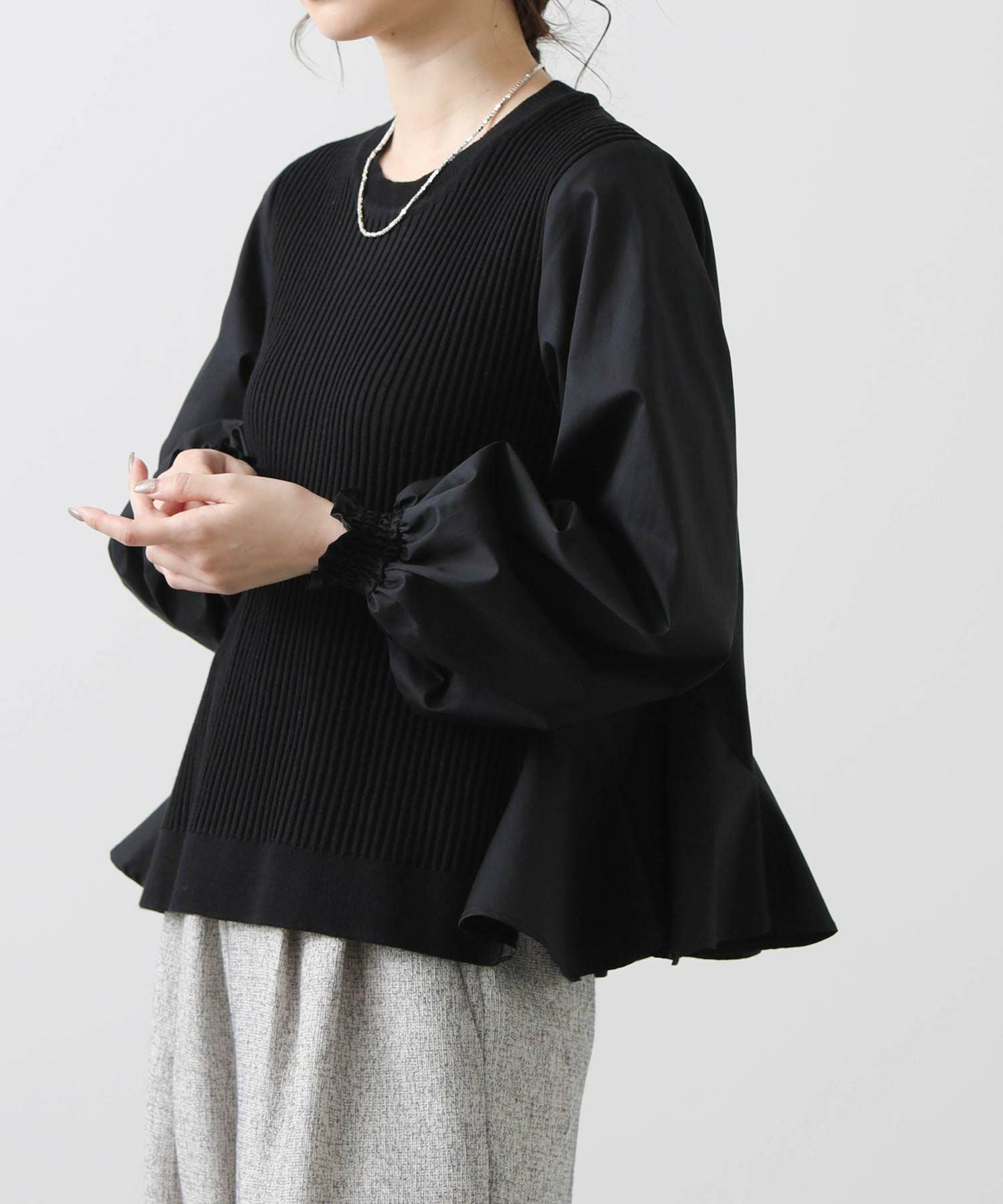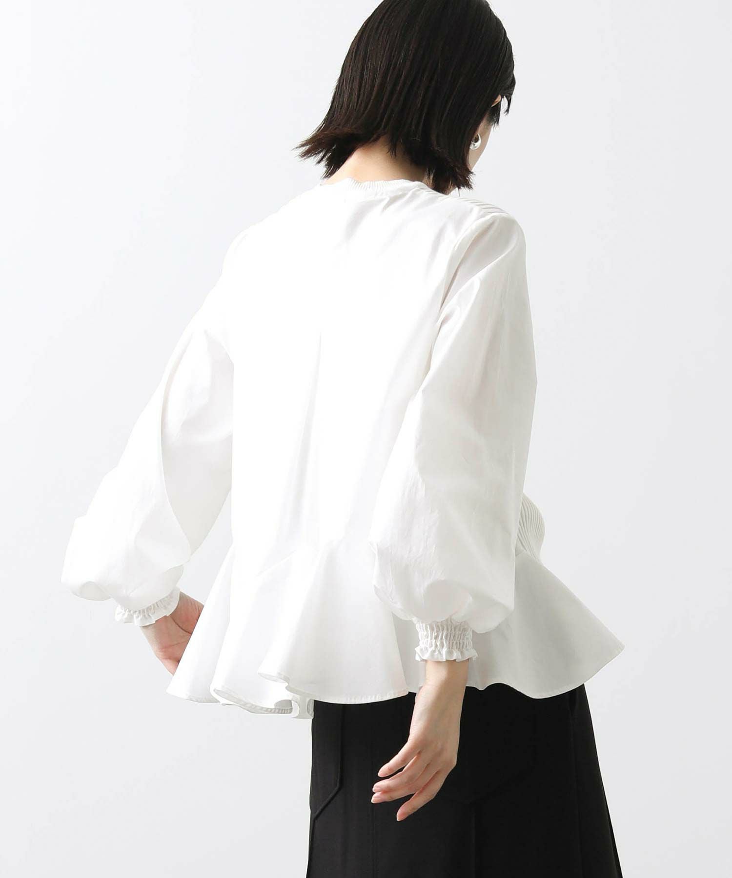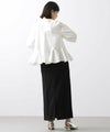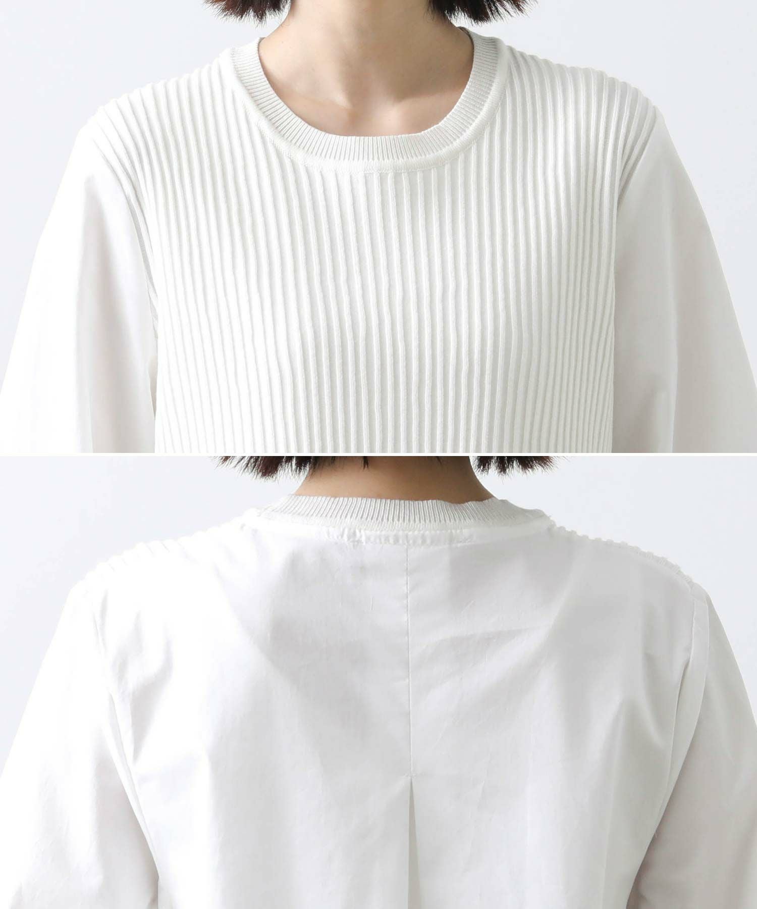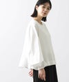 前見頃とネック部分は柔らかなニット素材、後身頃とお袖はハリ感のあるタイプライター素材を使用。背中の構築的なタックからなる、ふんわりとしたシルエットが女性らしい一枚です。