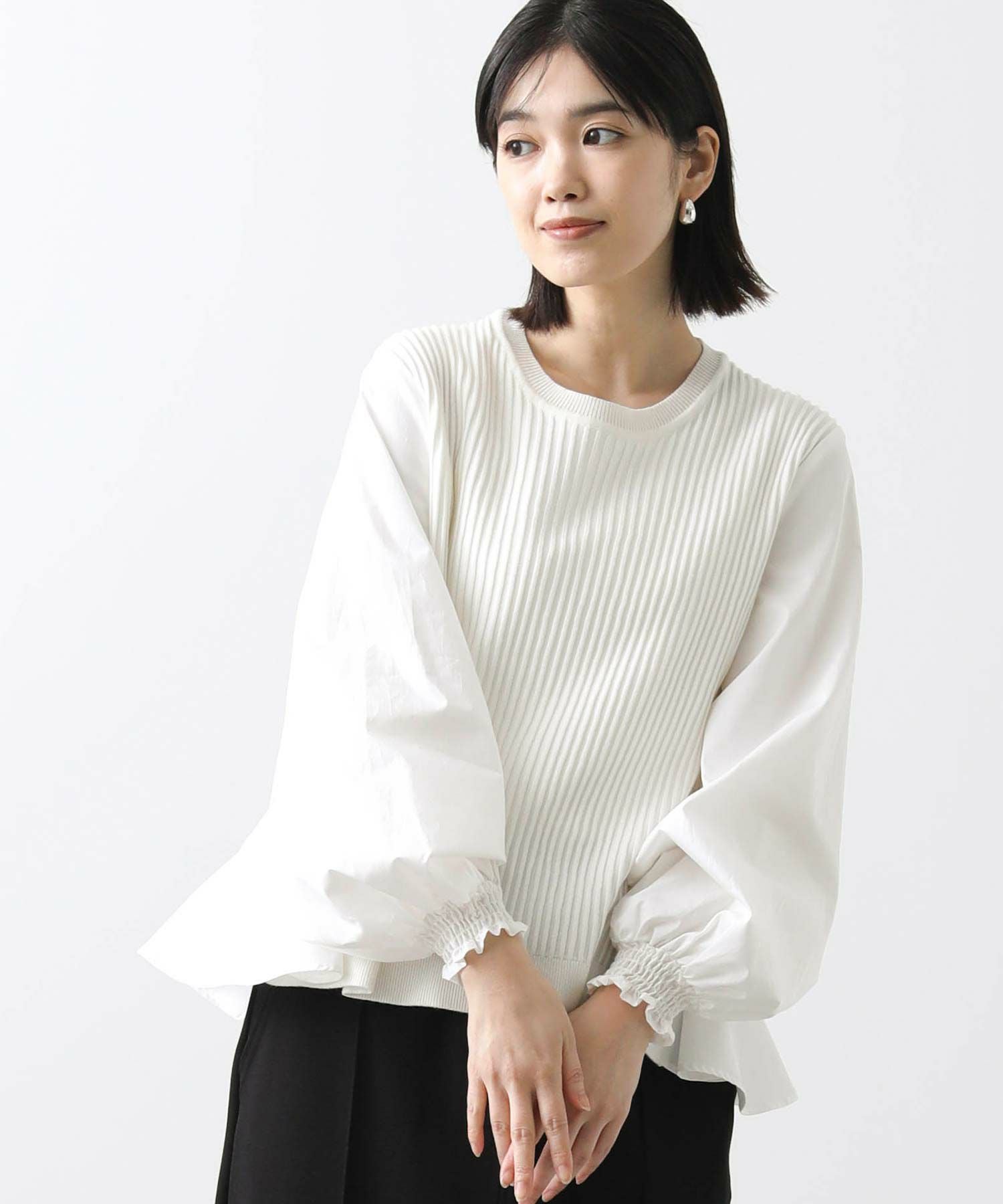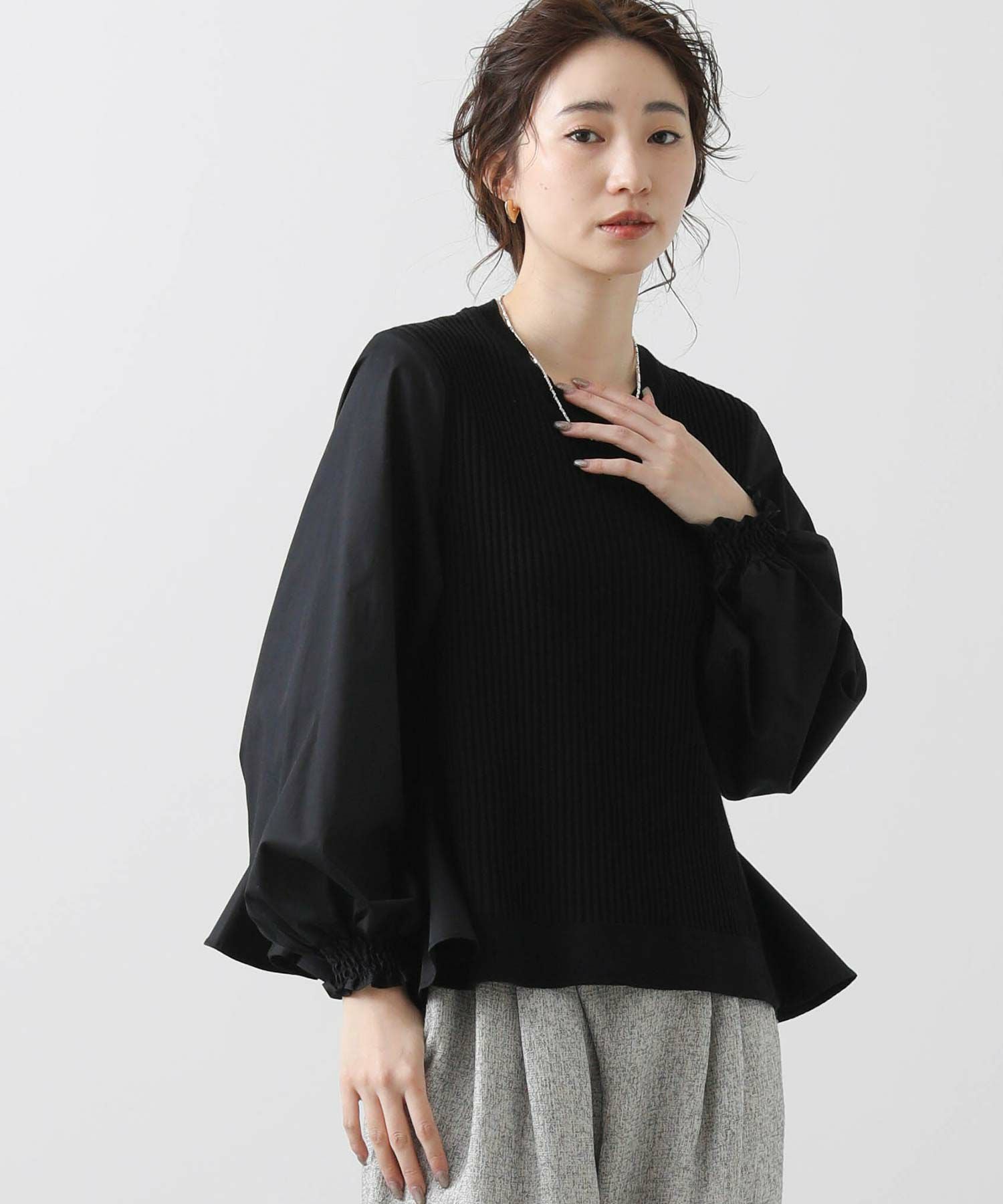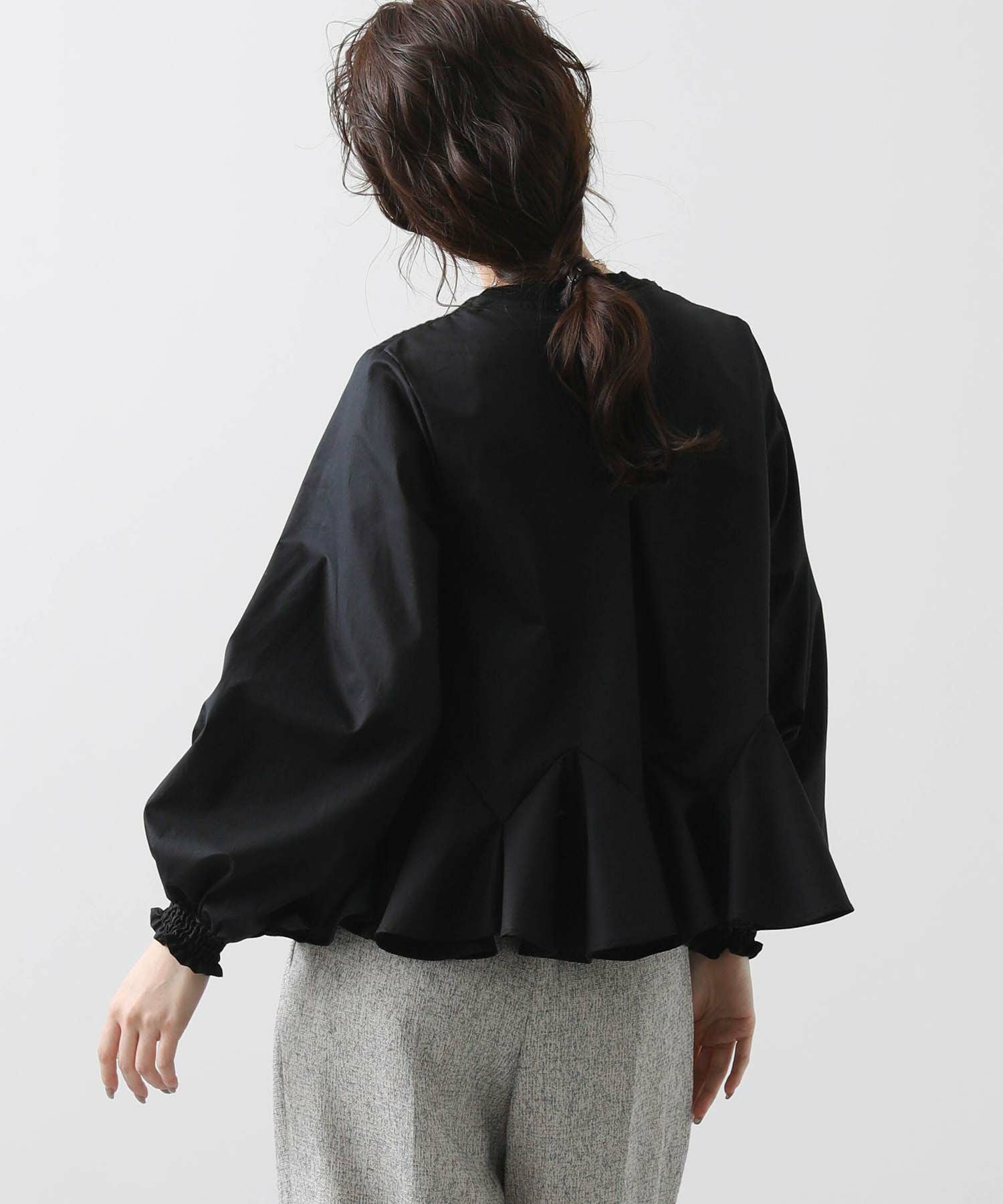 前見頃とネック部分は柔らかなニット素材、後身頃とお袖はハリ感のあるタイプライター素材を使用。背中の構築的なタックからなる、ふんわりとしたシルエットが女性らしい一枚です。