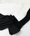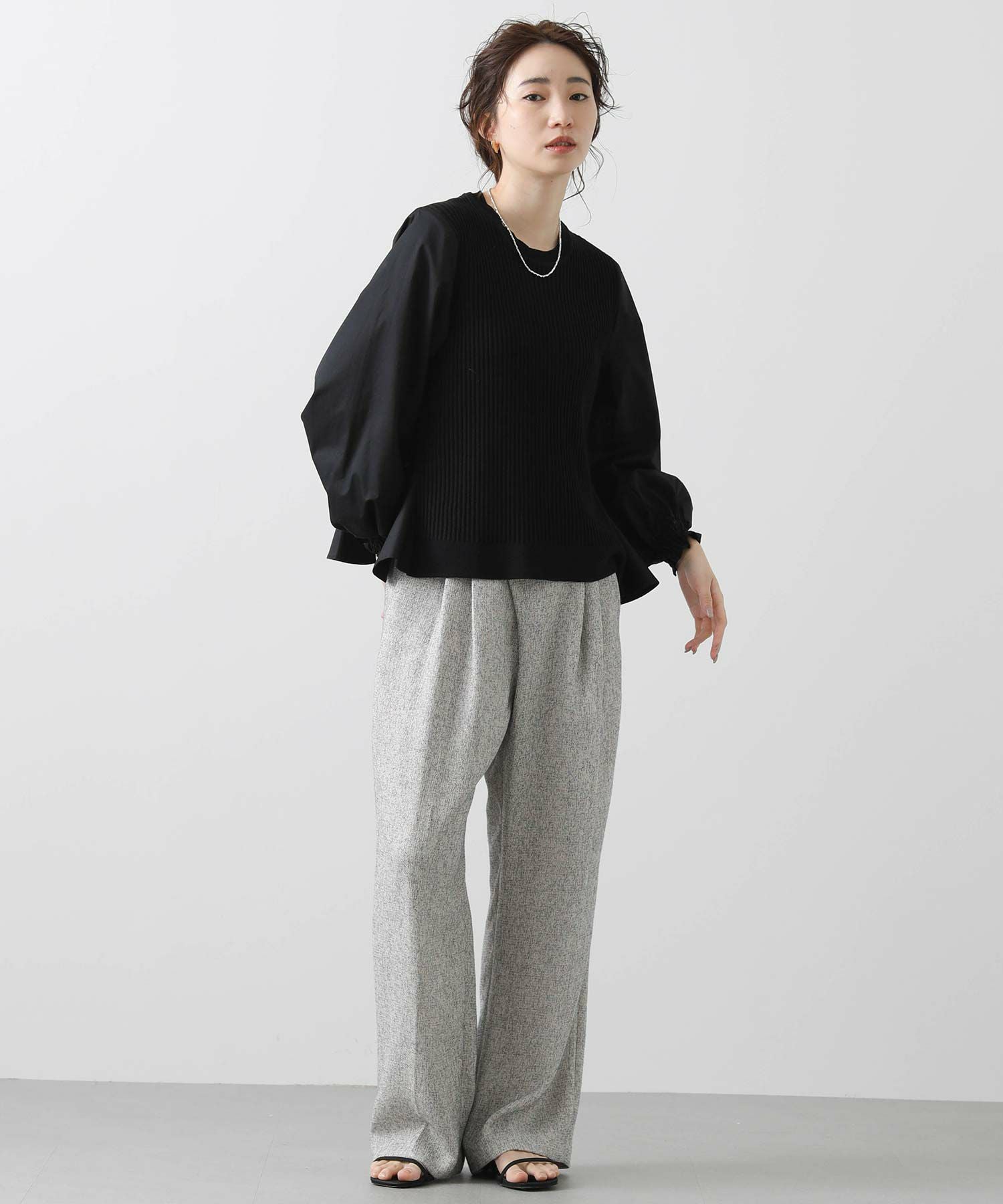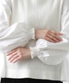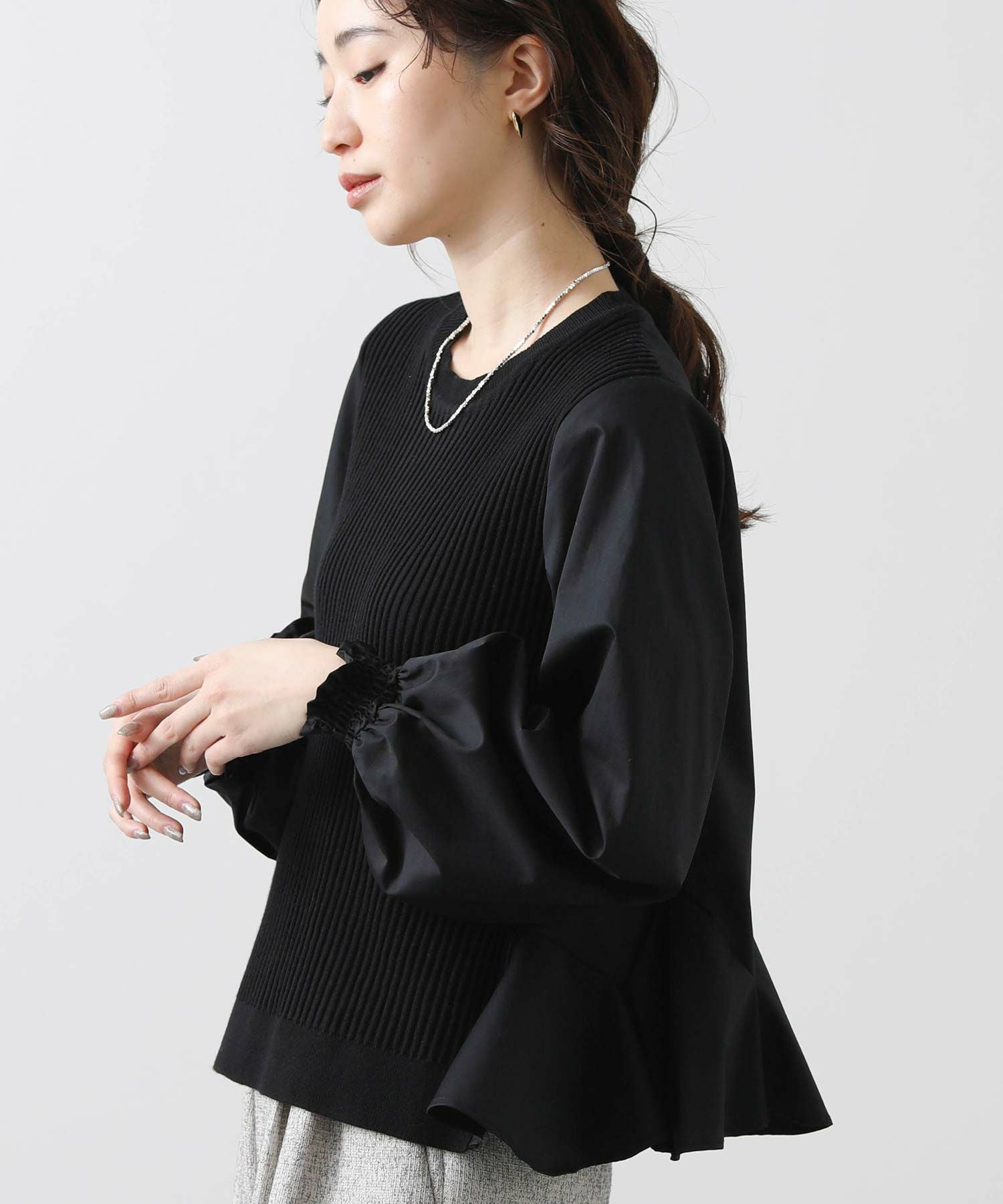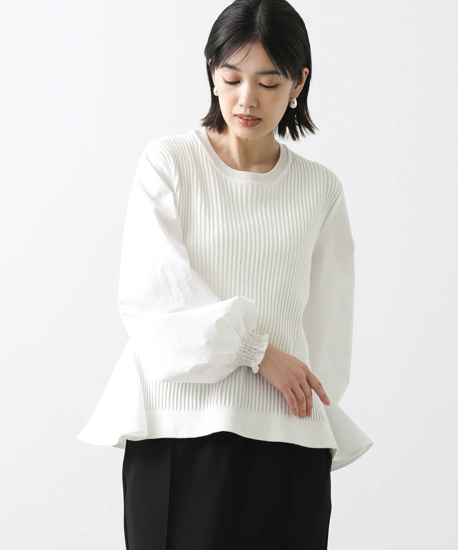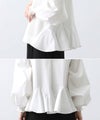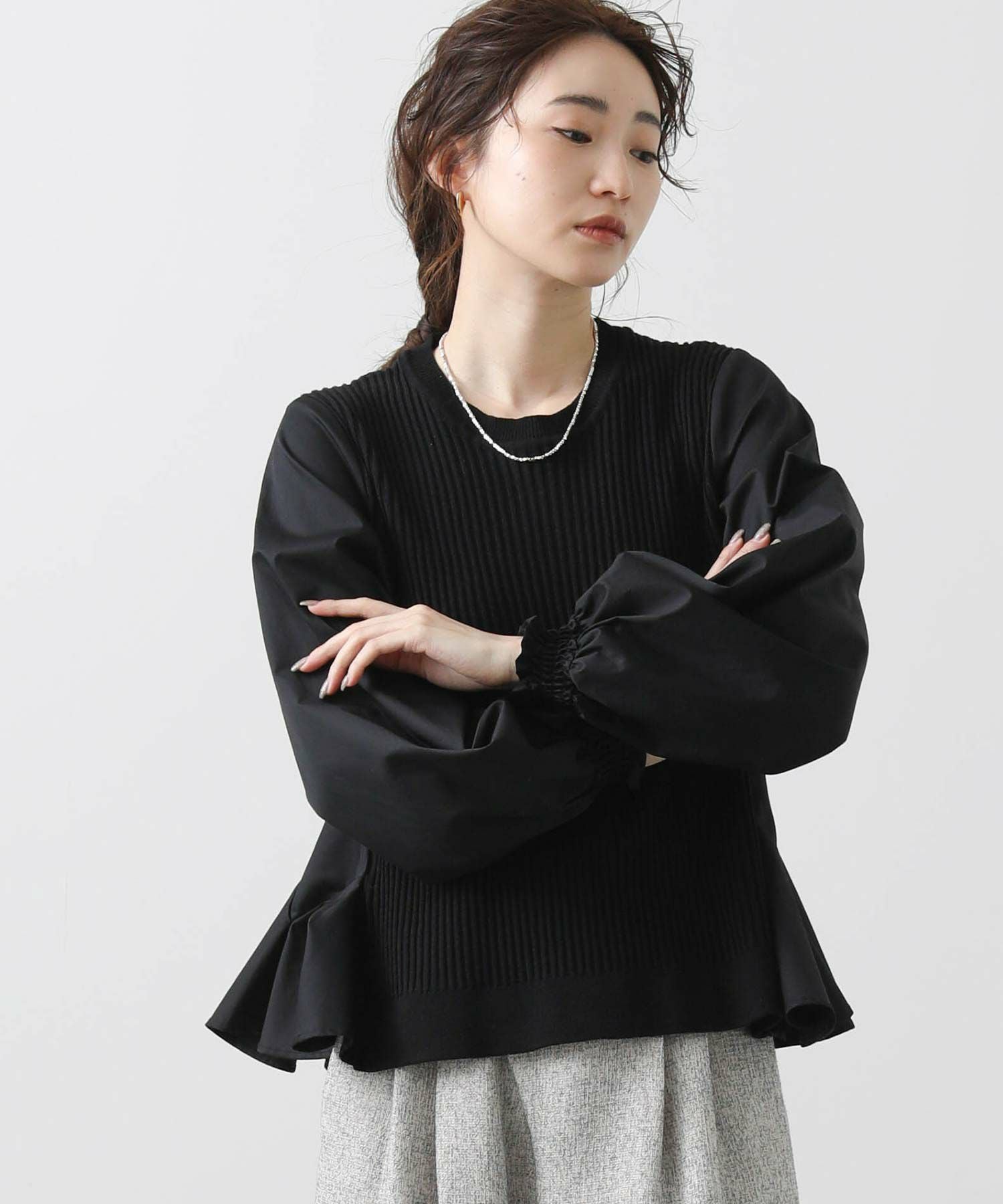 前見頃とネック部分は柔らかなニット素材、後身頃とお袖はハリ感のあるタイプライター素材を使用。背中の構築的なタックからなる、ふんわりとしたシルエットが女性らしい一枚です。