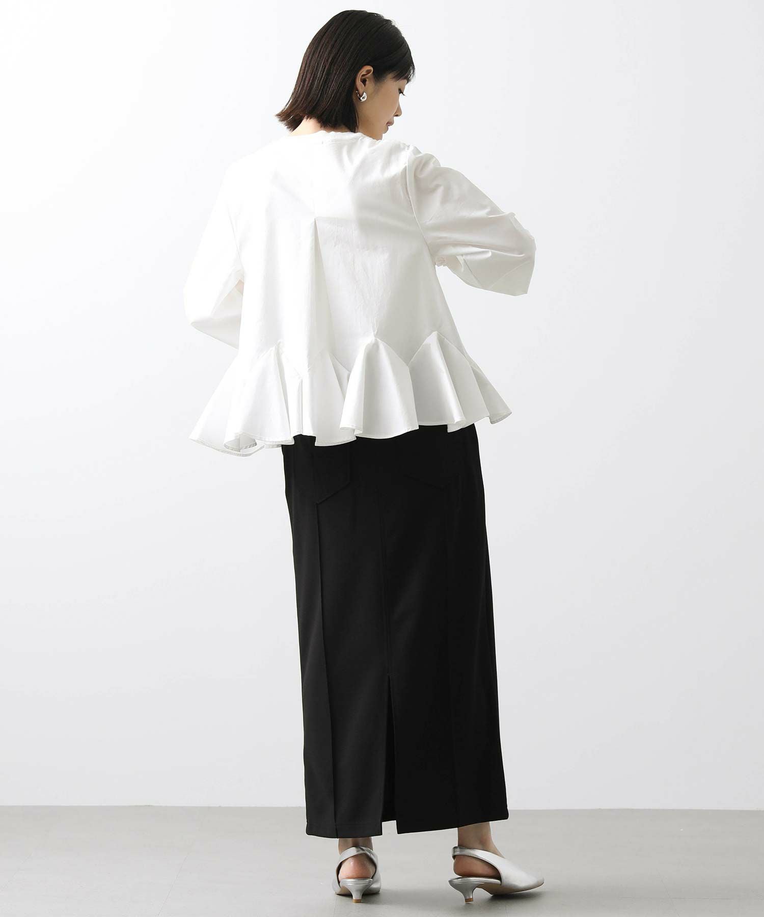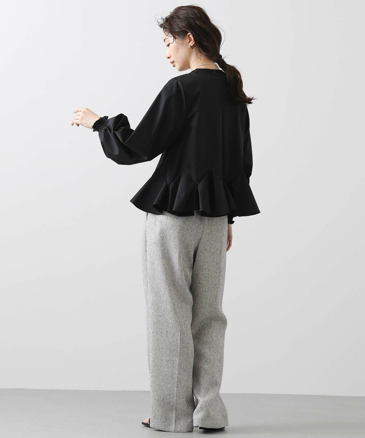 今回は後身頃裾にラッフルパーツを施しました。裾にボリュームがあるため、定番のシルエットよりも後ろ丈を短く仕上げバランスの良い仕上がりに。
