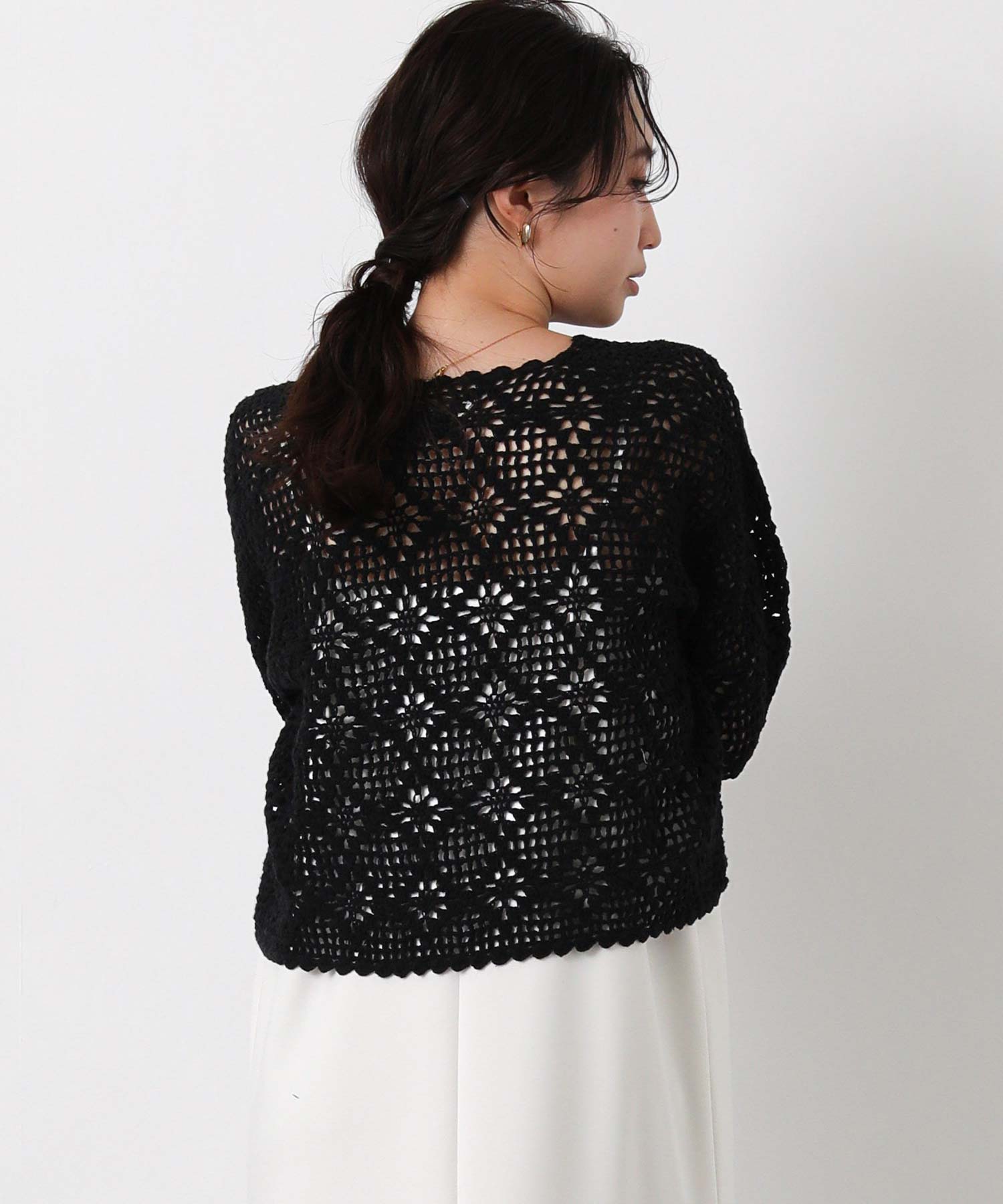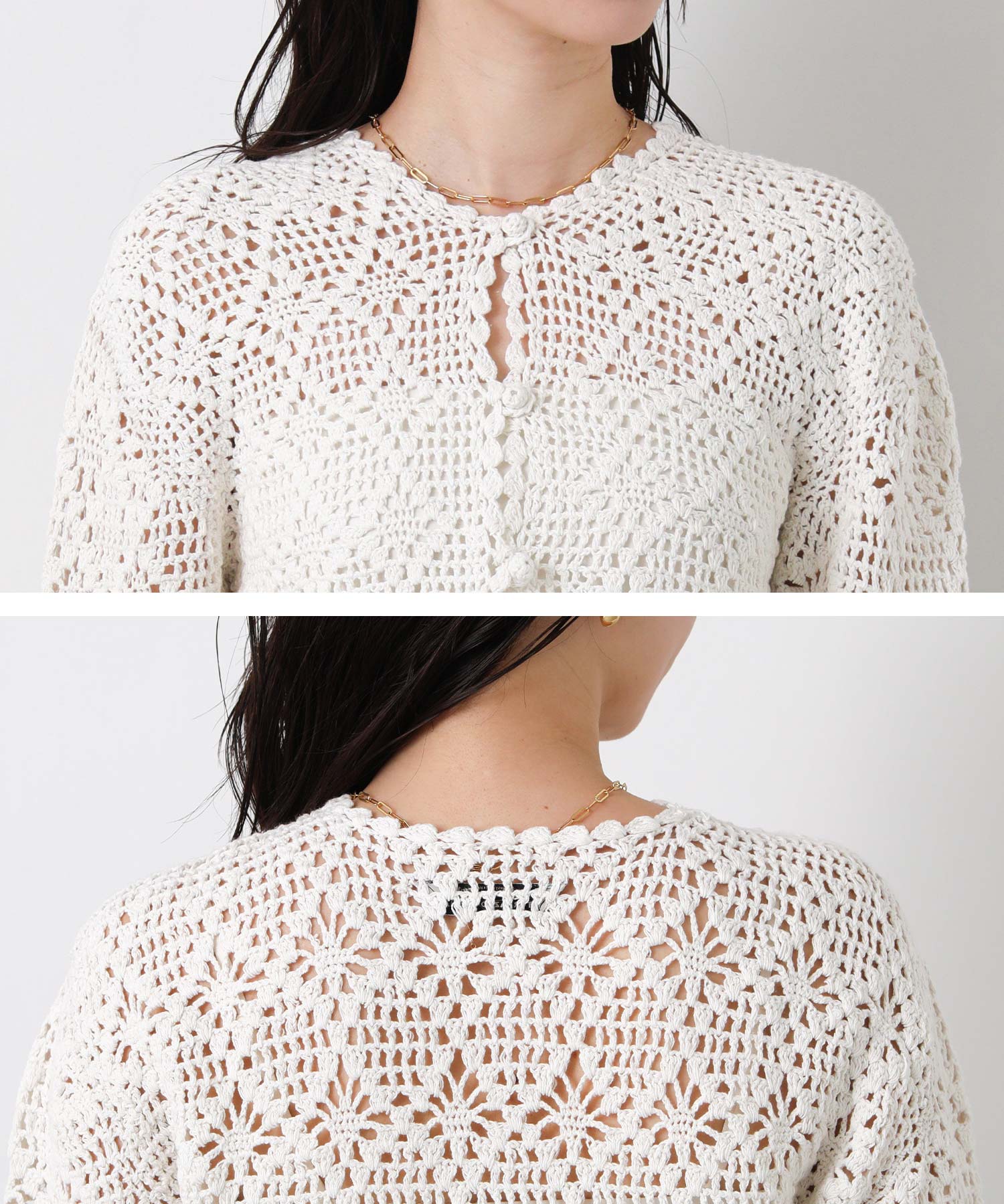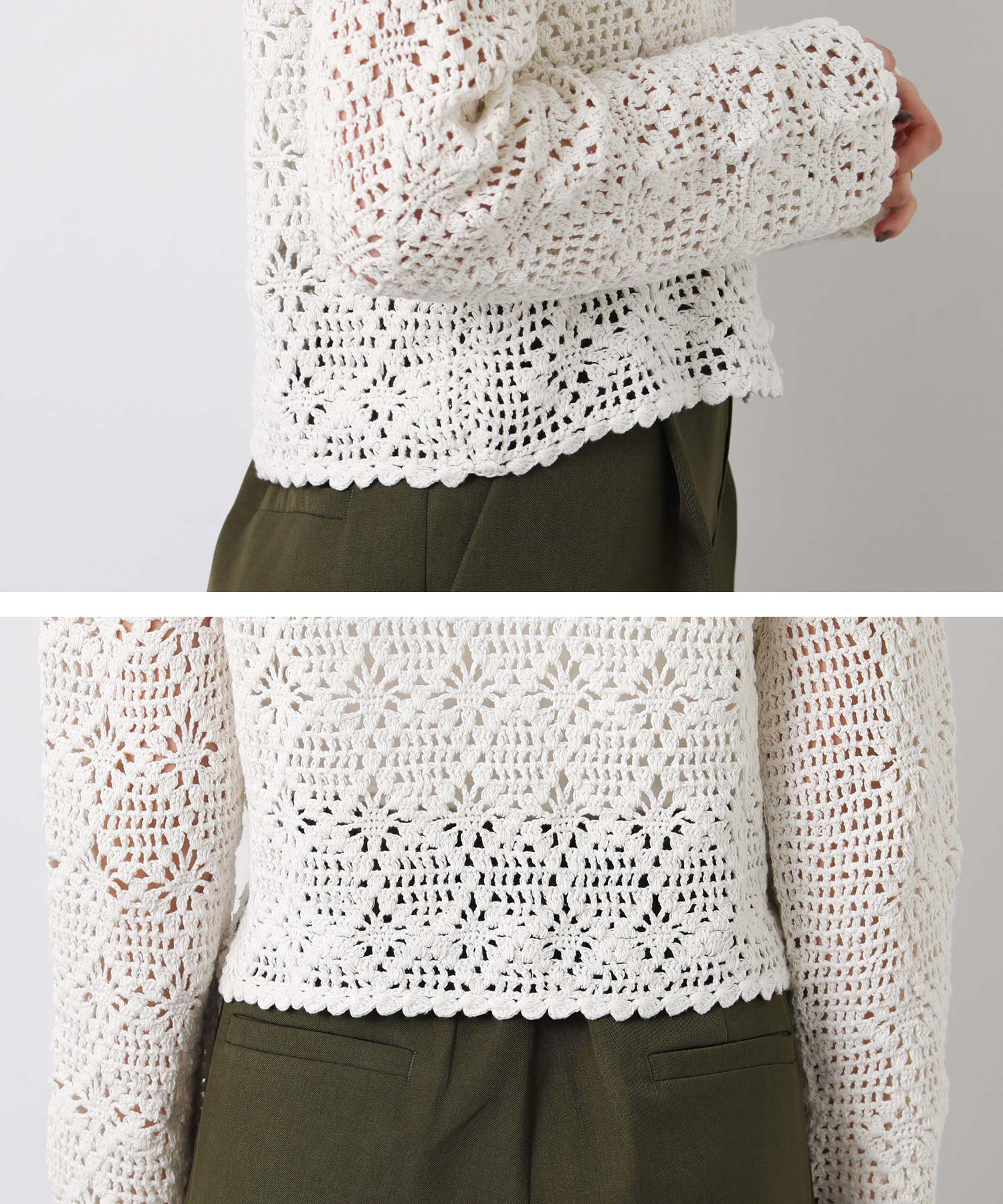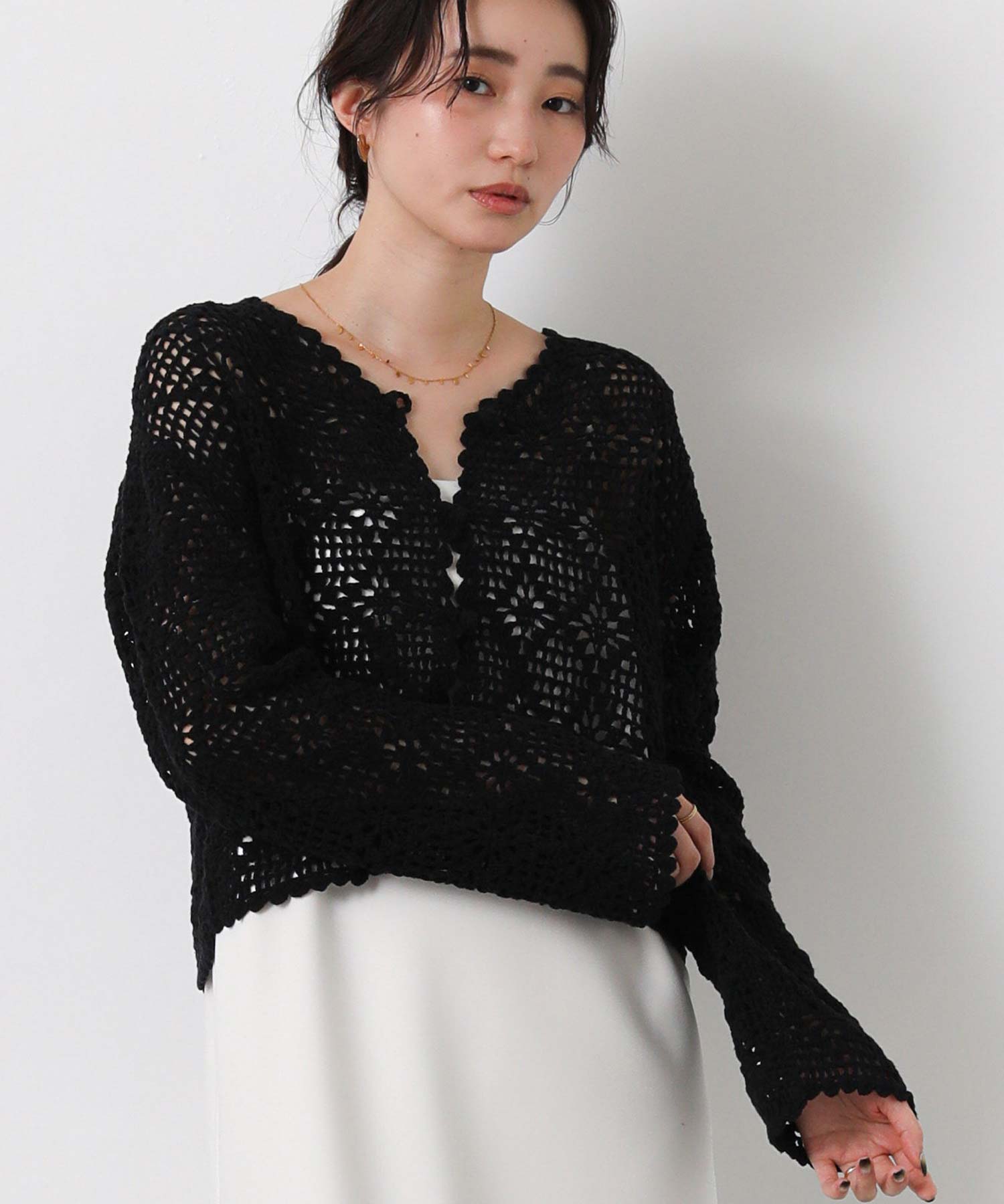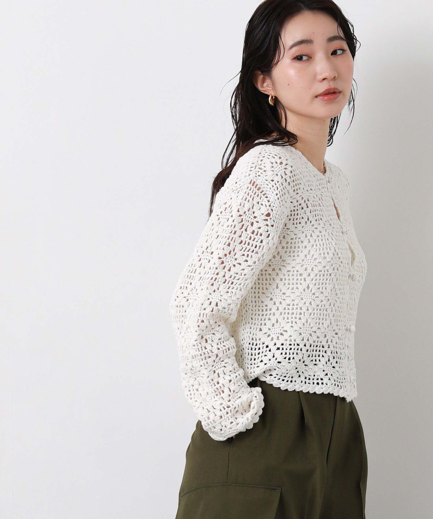 ほどよい透け感のかぎ針編みデザインは、シーズンライクな雰囲気でロングシーズンで着まわせます。