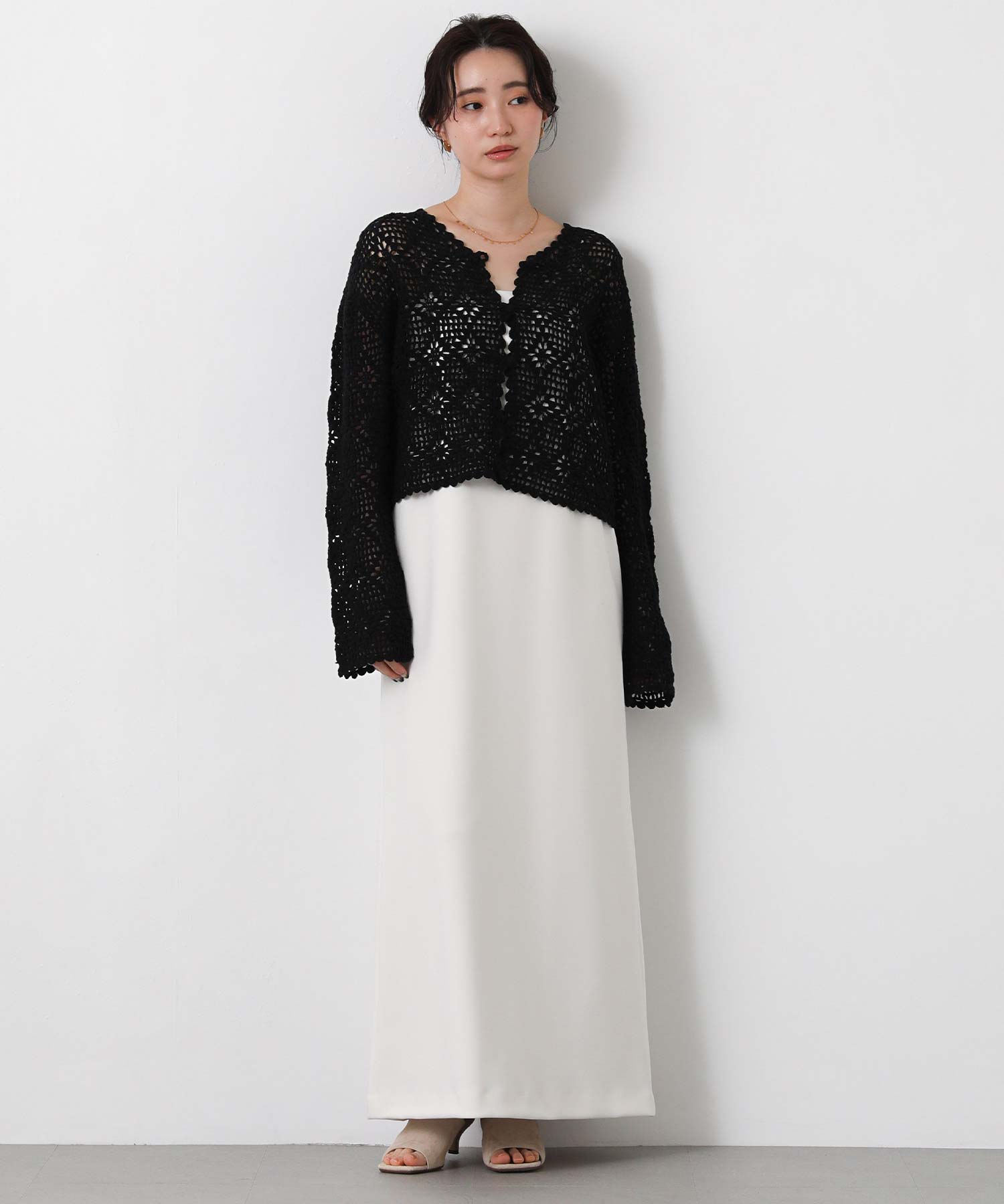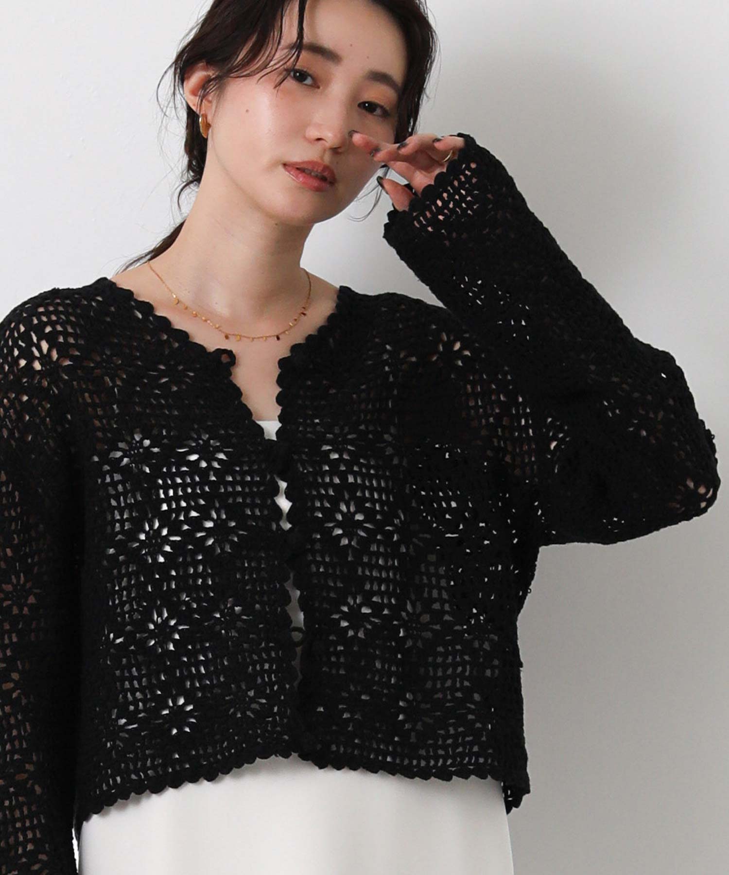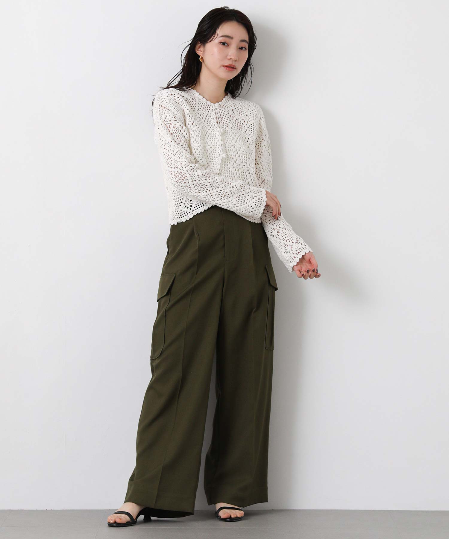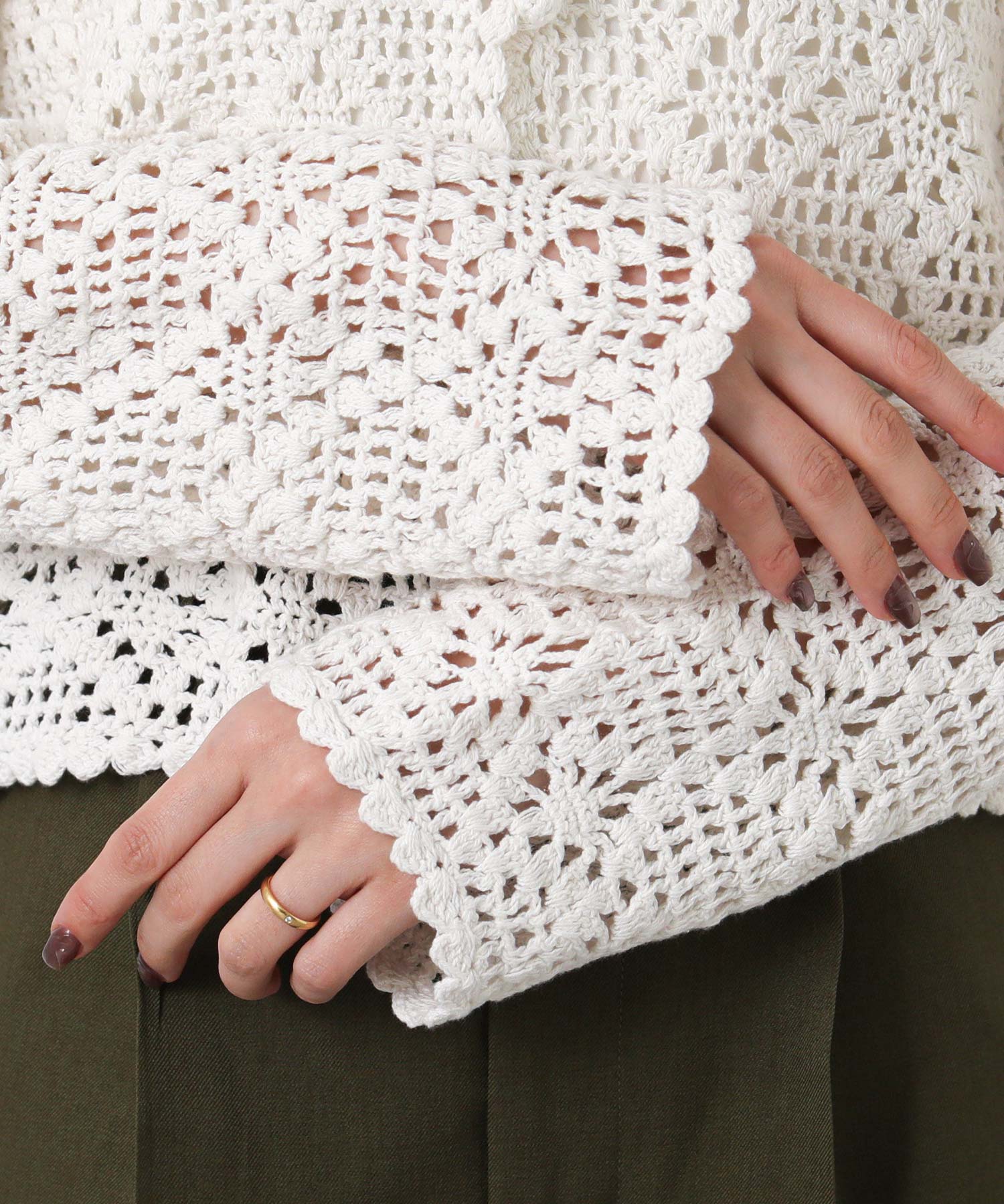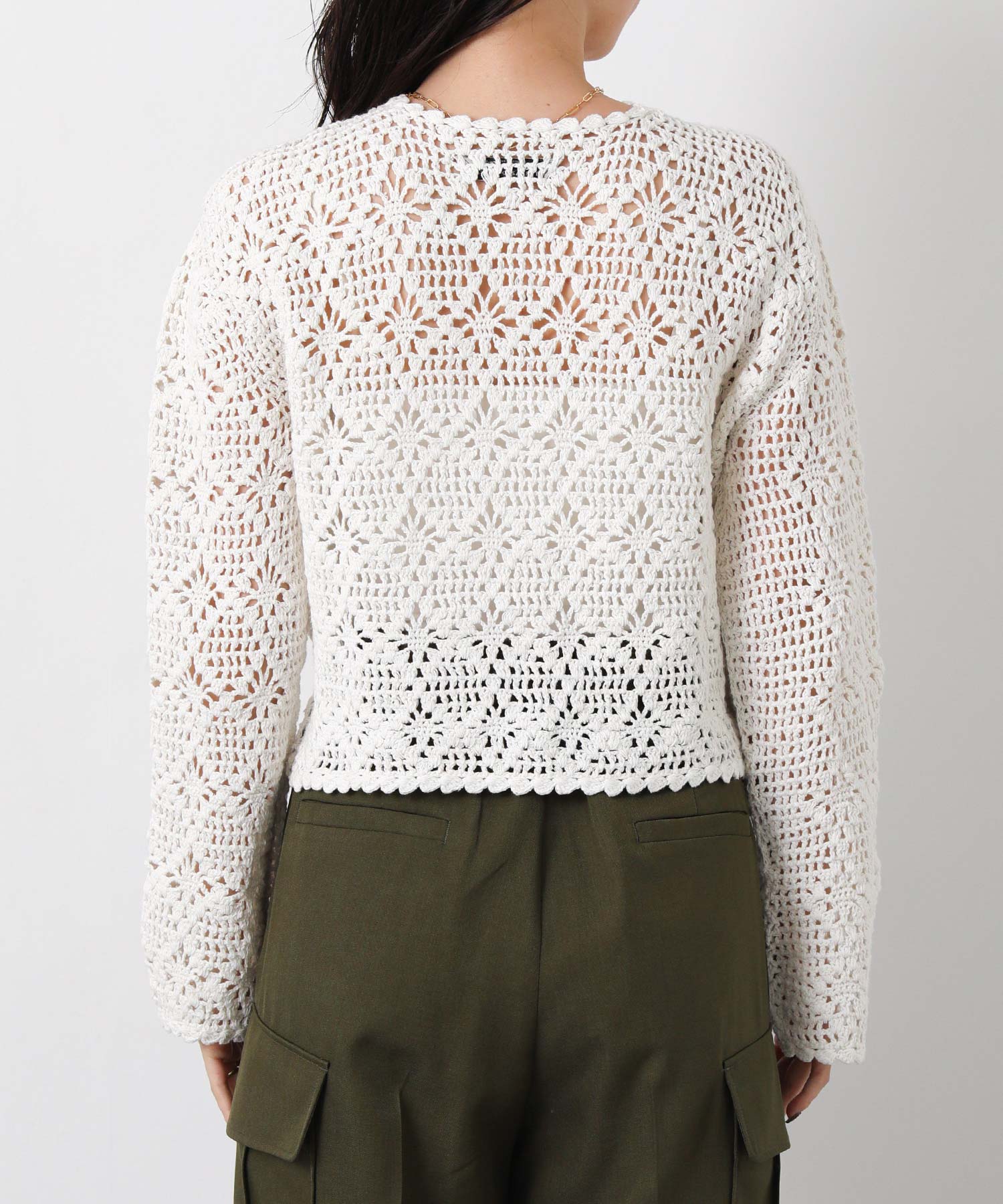 ほどよい透け感のかぎ針編みデザインは、シーズンライクな雰囲気でロングシーズンで着まわせます。