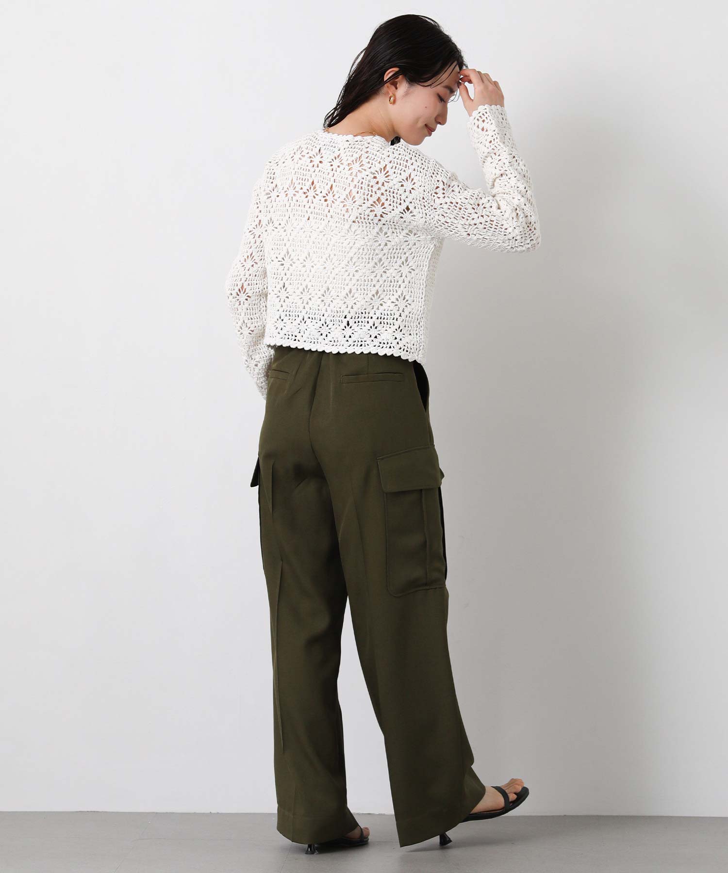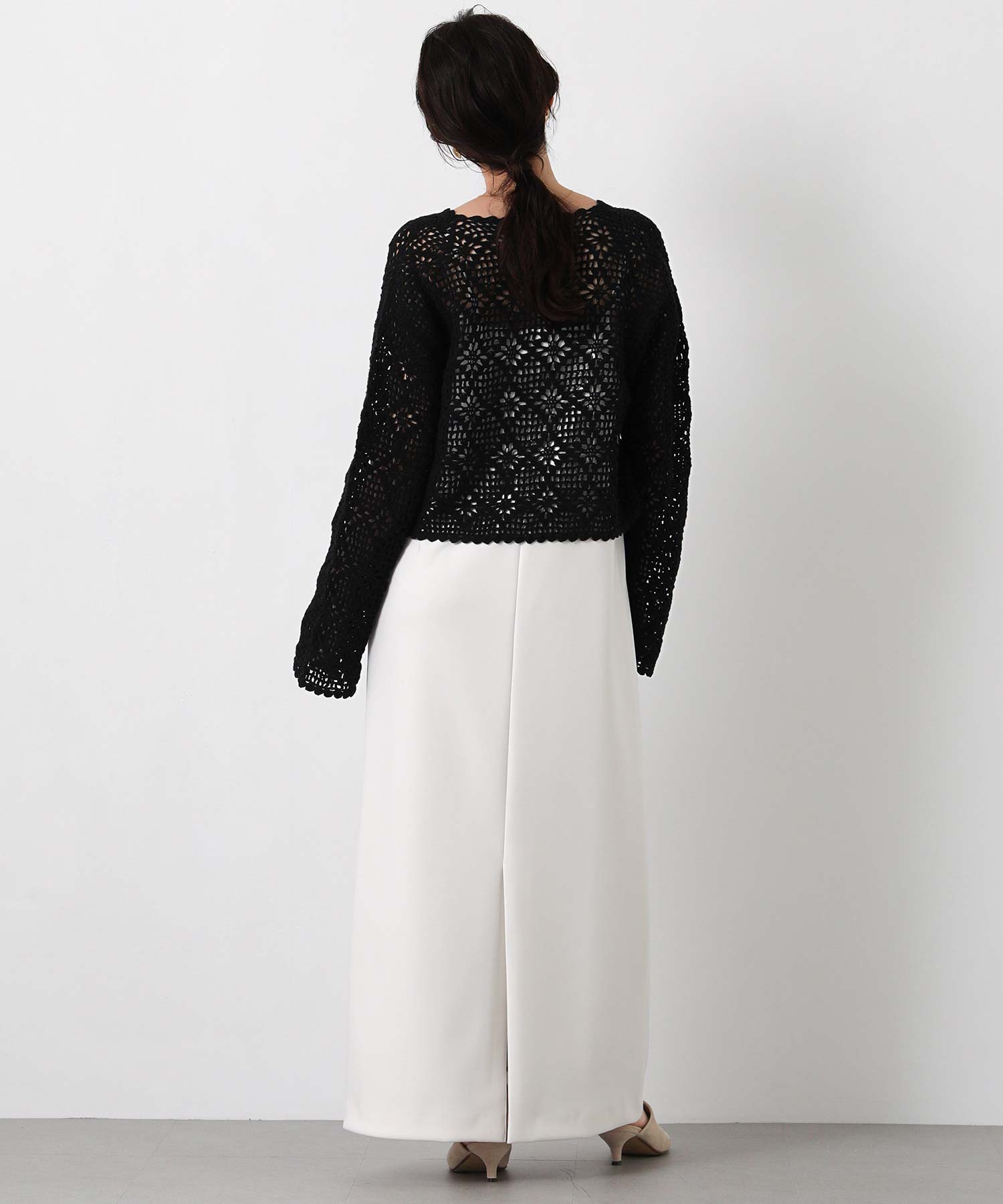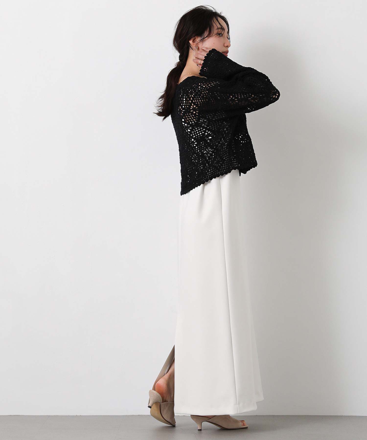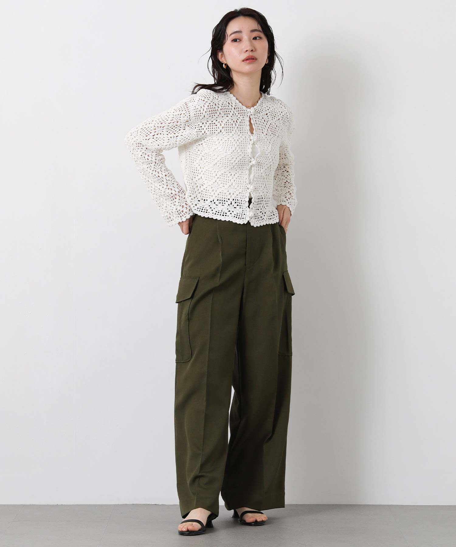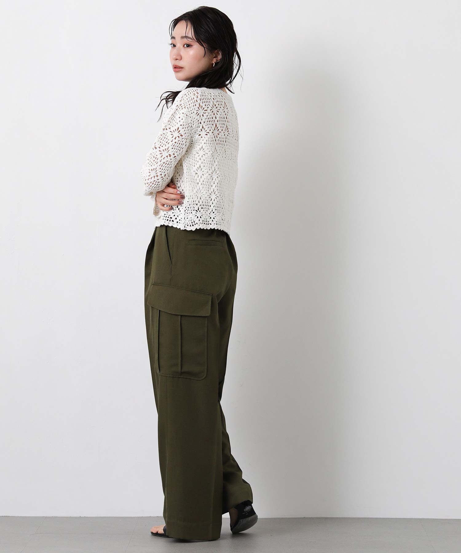ほどよい透け感のかぎ針編みデザインは、シーズンライクな雰囲気でロングシーズンで着まわせます。