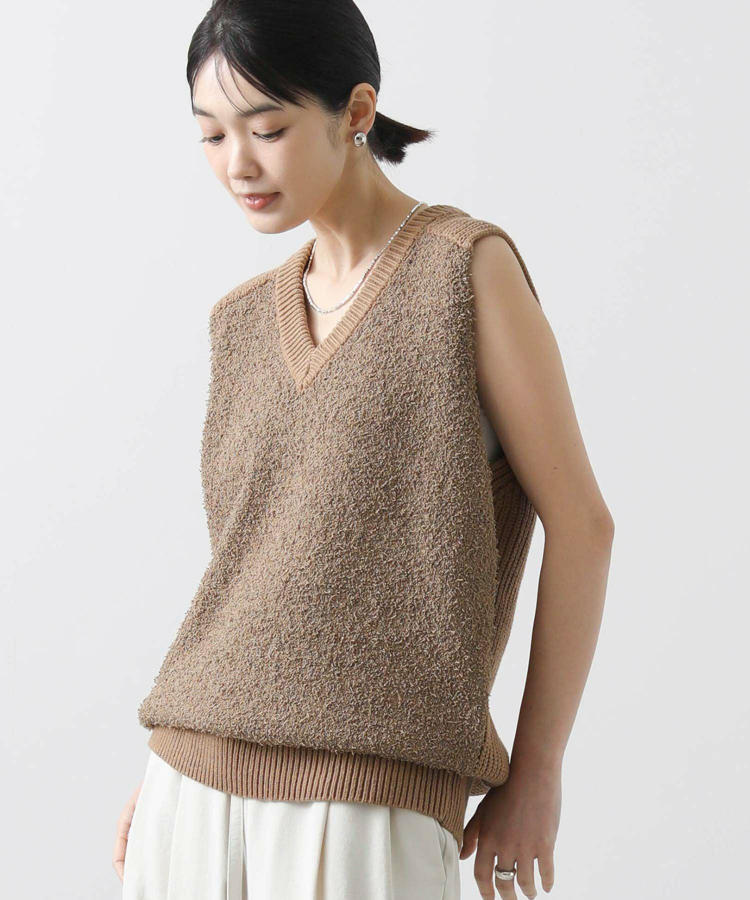 【AGAWD(アガウド)】から、前見頃と後ろ見頃で編み地を変え、表情豊かな風合いで仕上げたニットベストをセレクト。