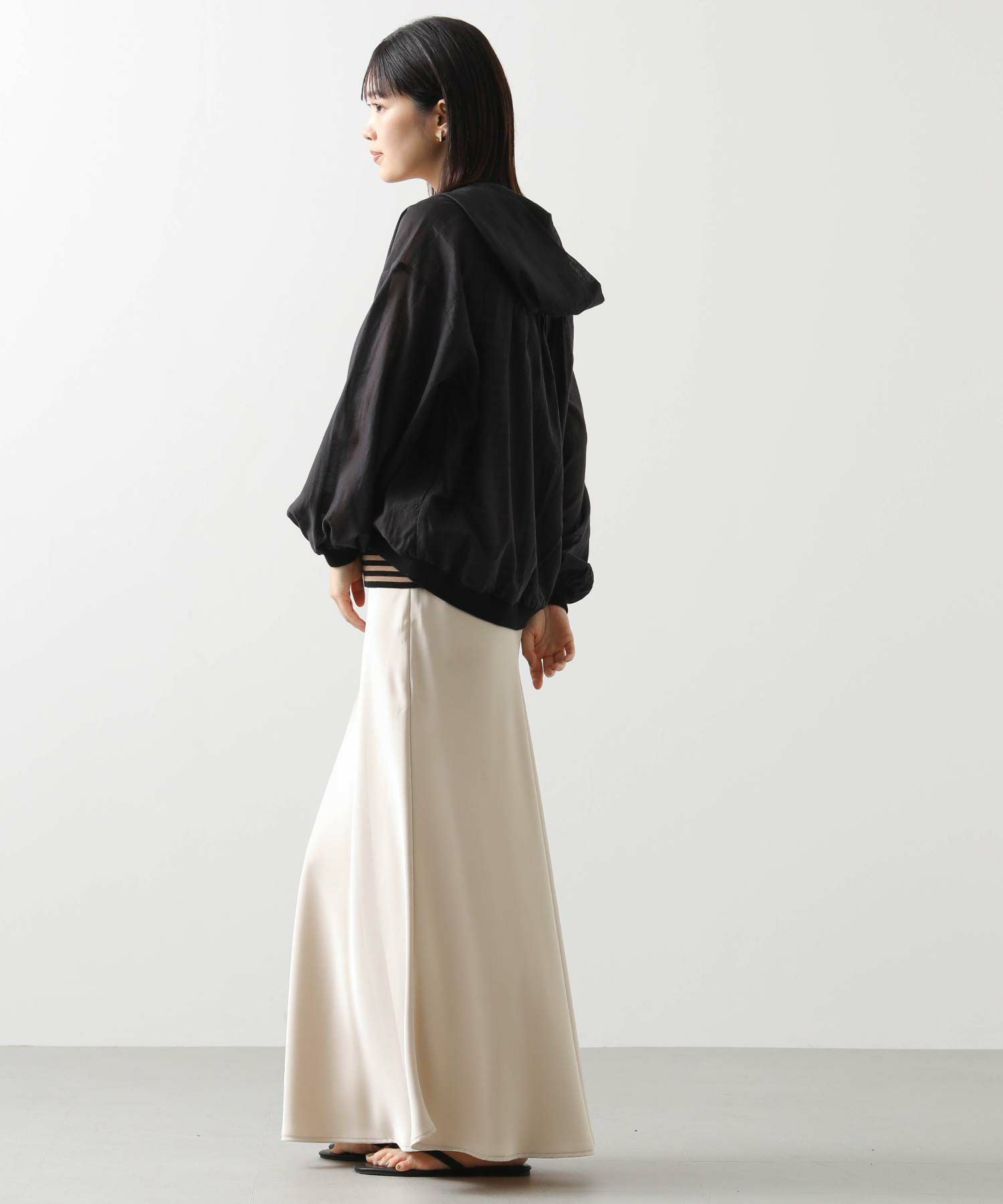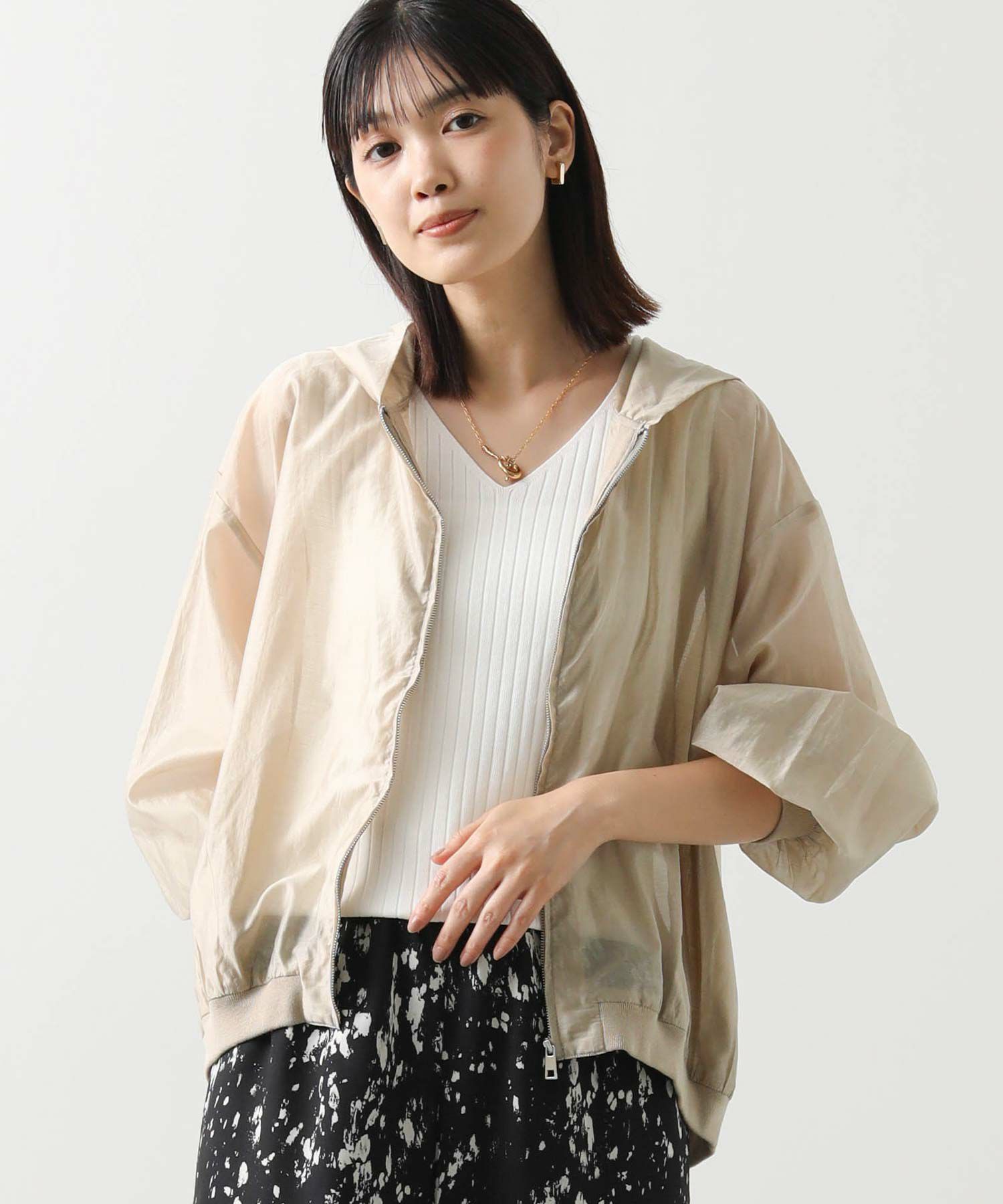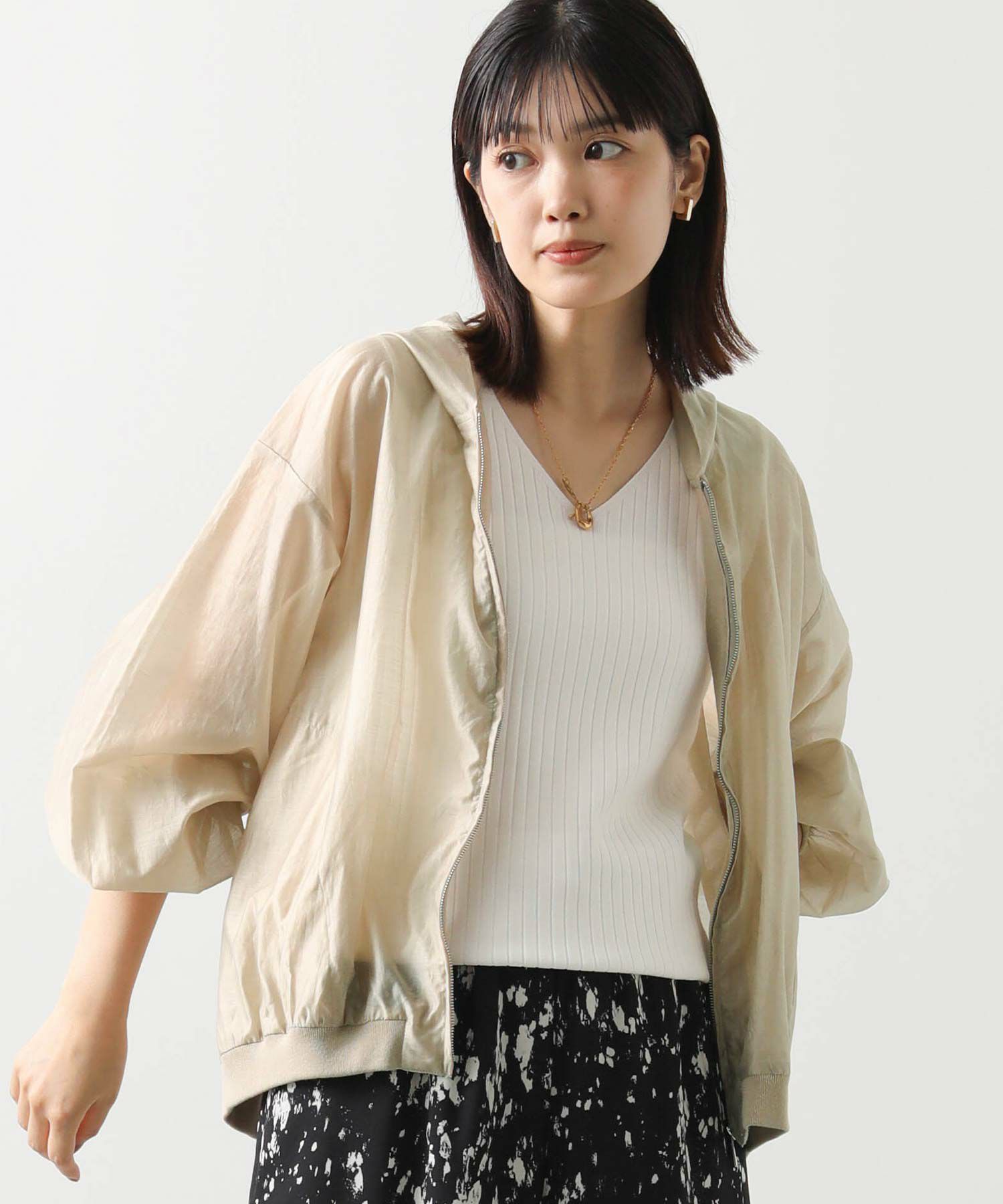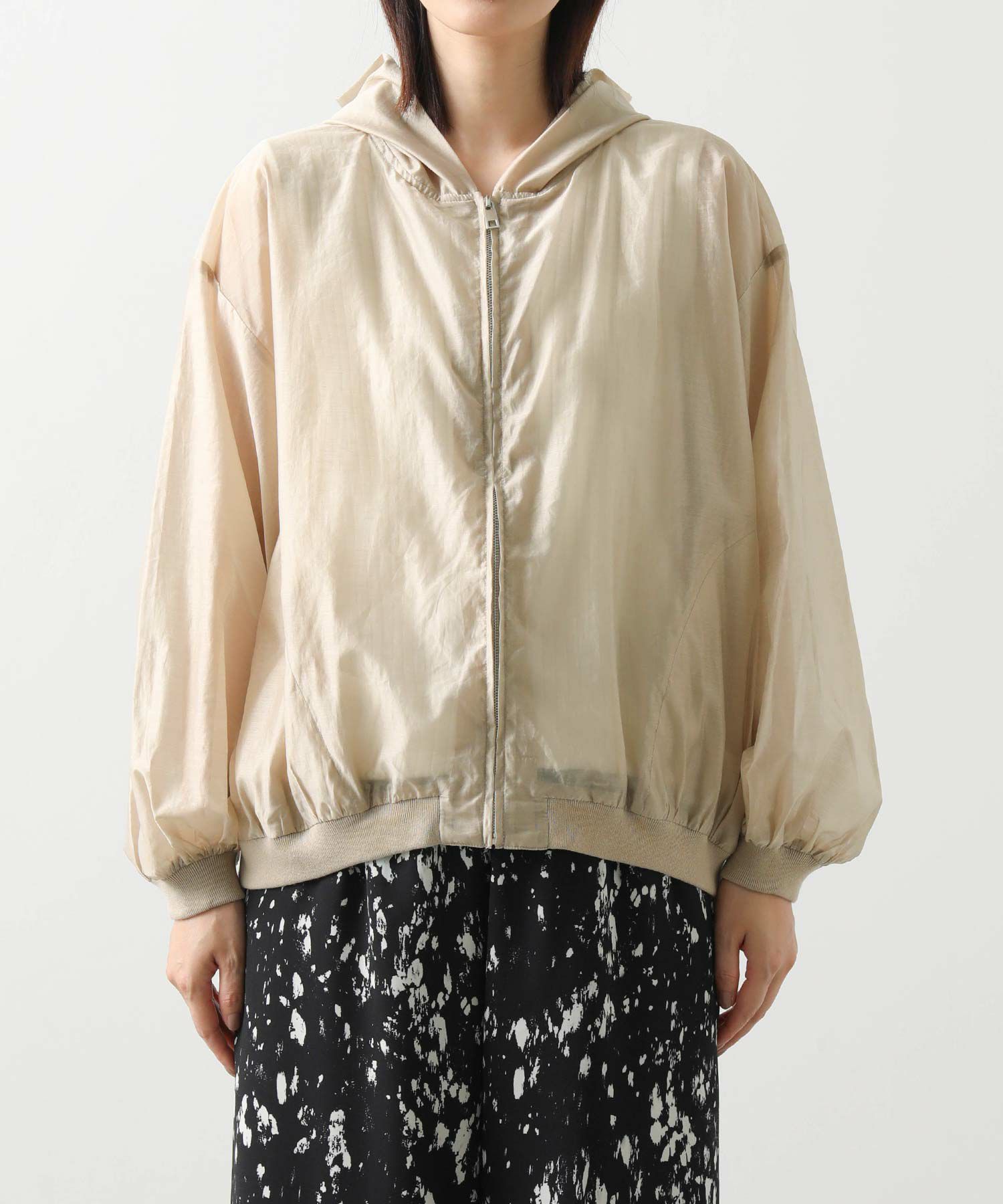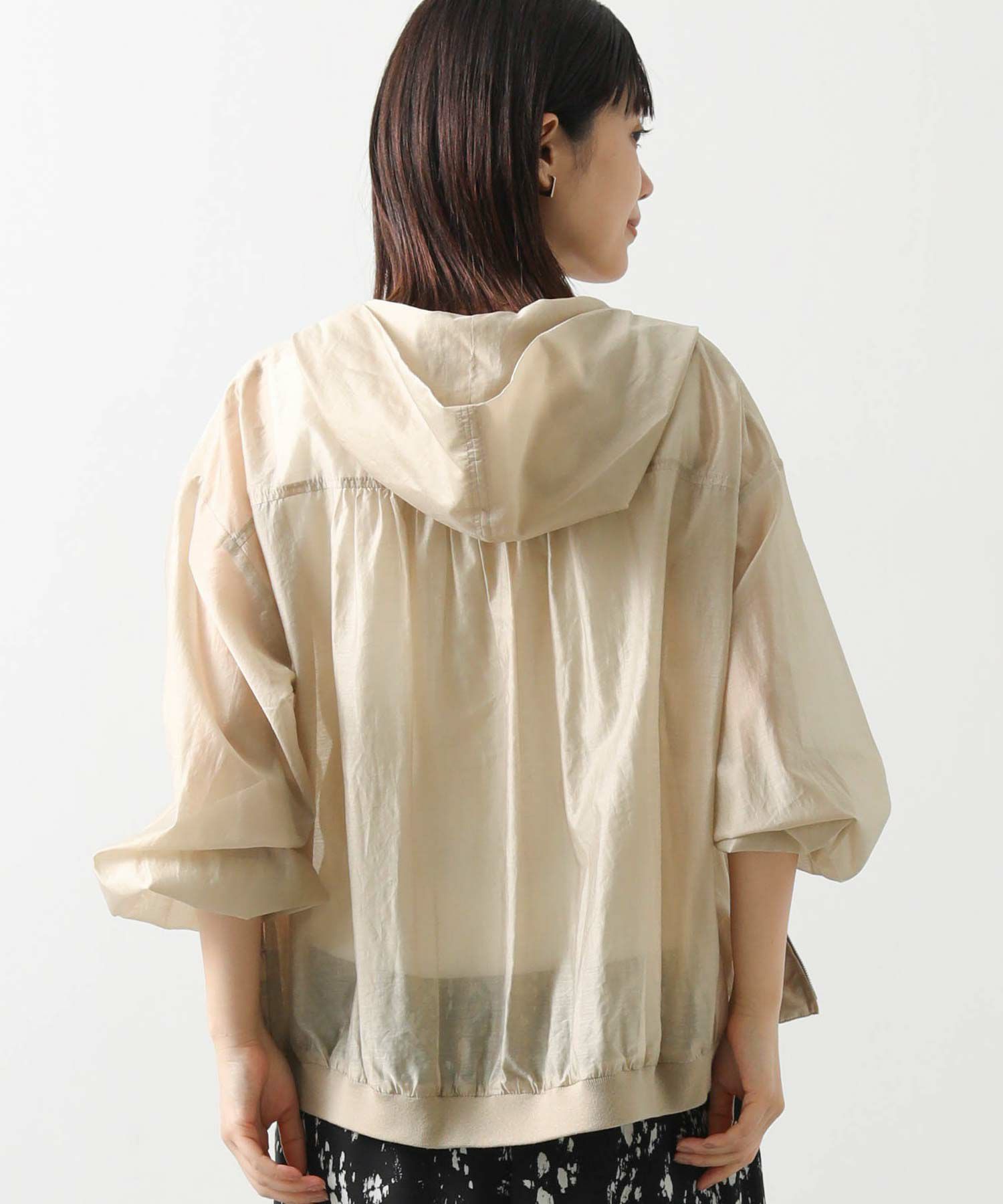 カジュアルなイメージのパーカーですが、上品な透け感の素材でキレイめコーデにも合わせやすい1枚。