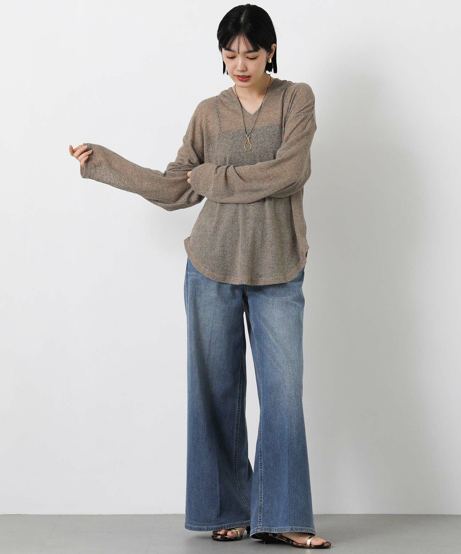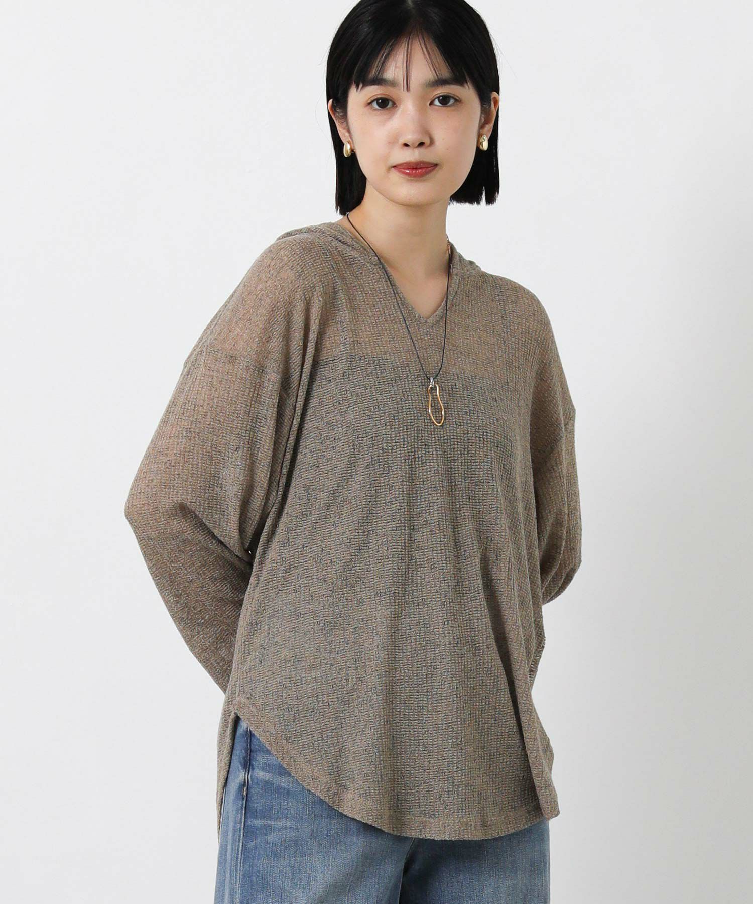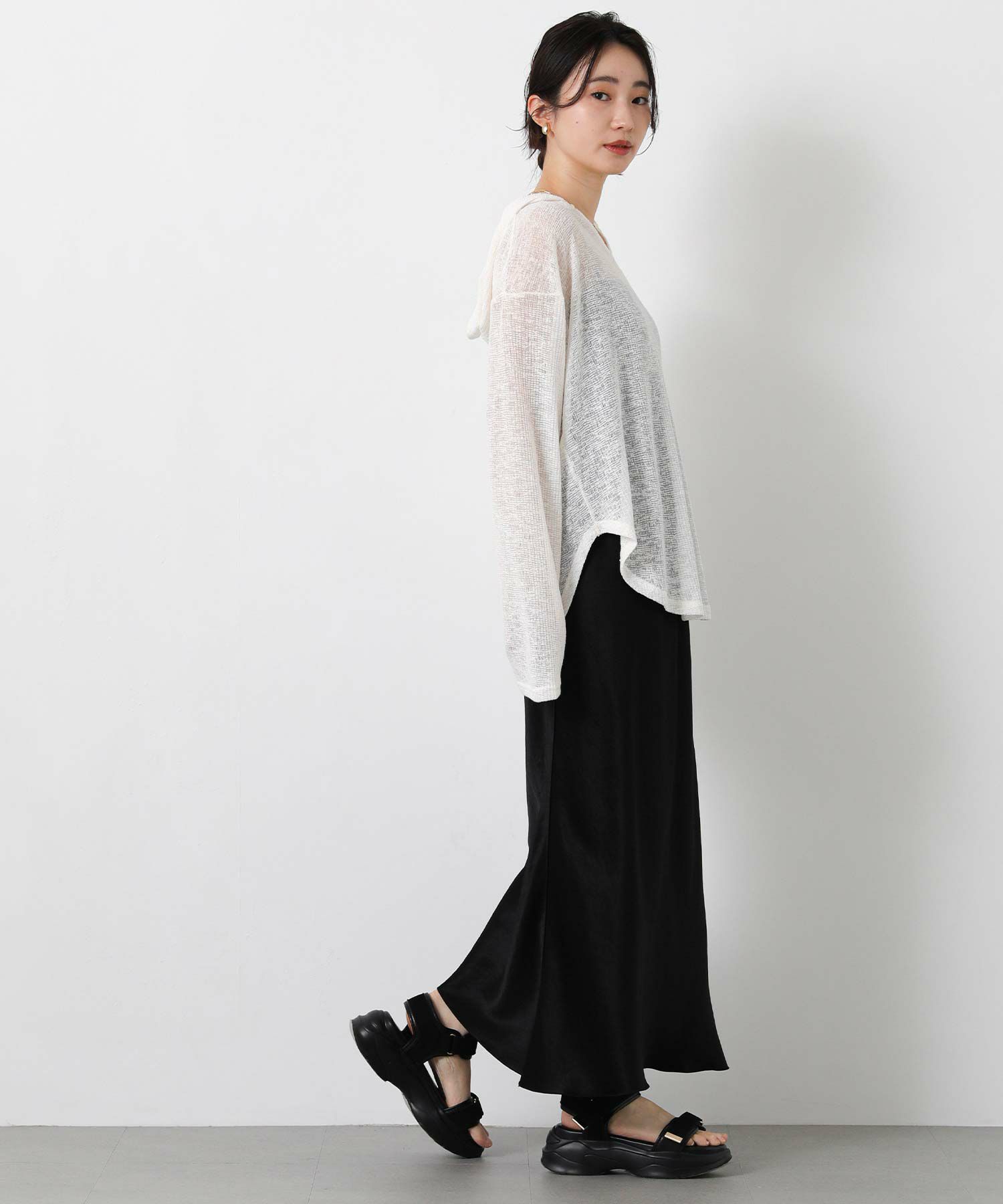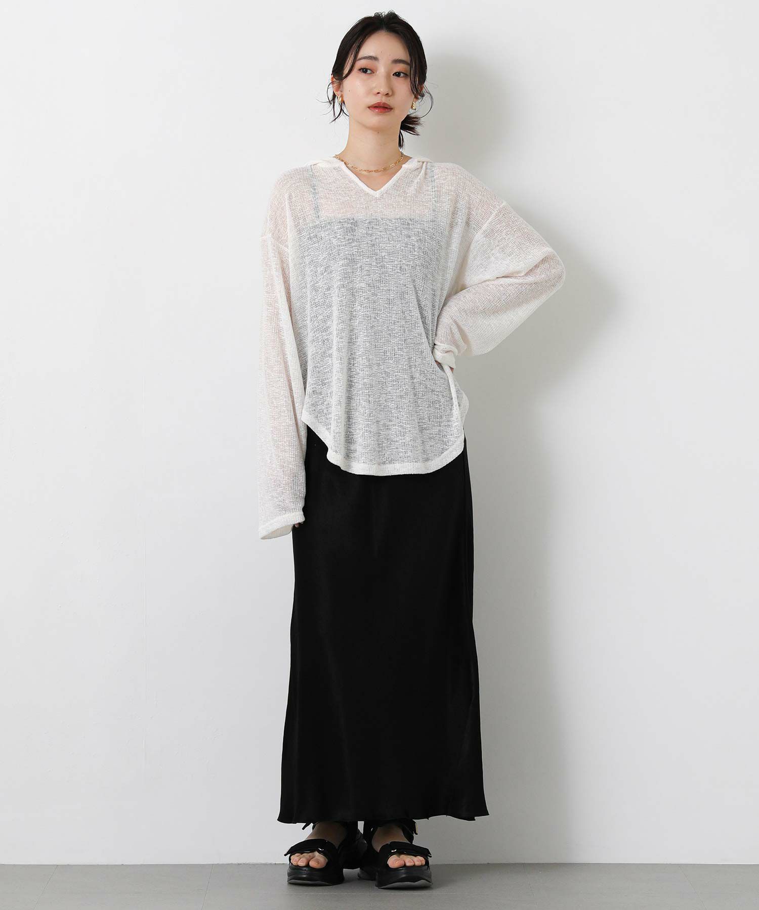 カジュアルな印象のフーディーを、ほんのりシアーな軽やかなカットソーでこなれ感のある1枚に。