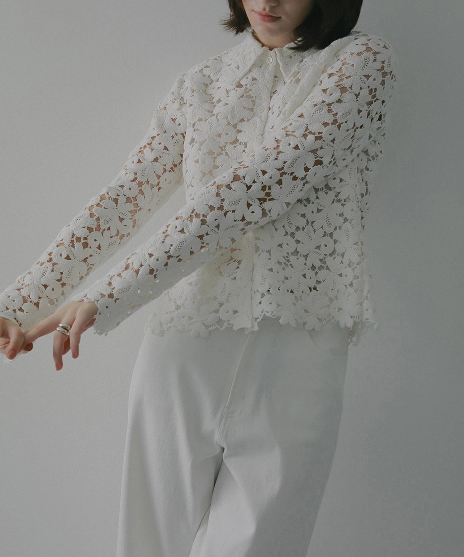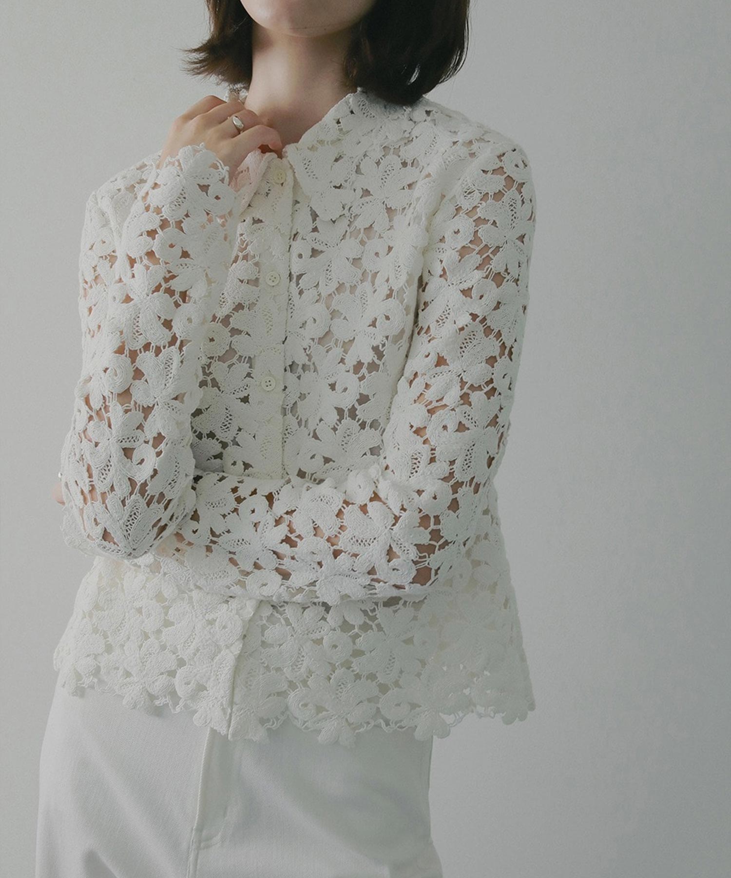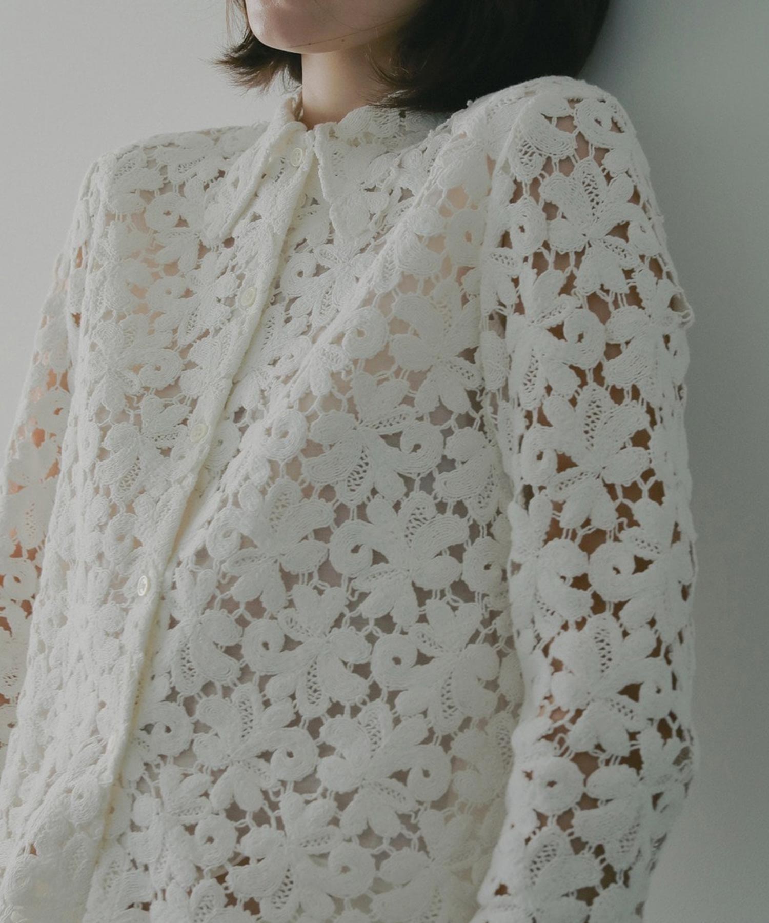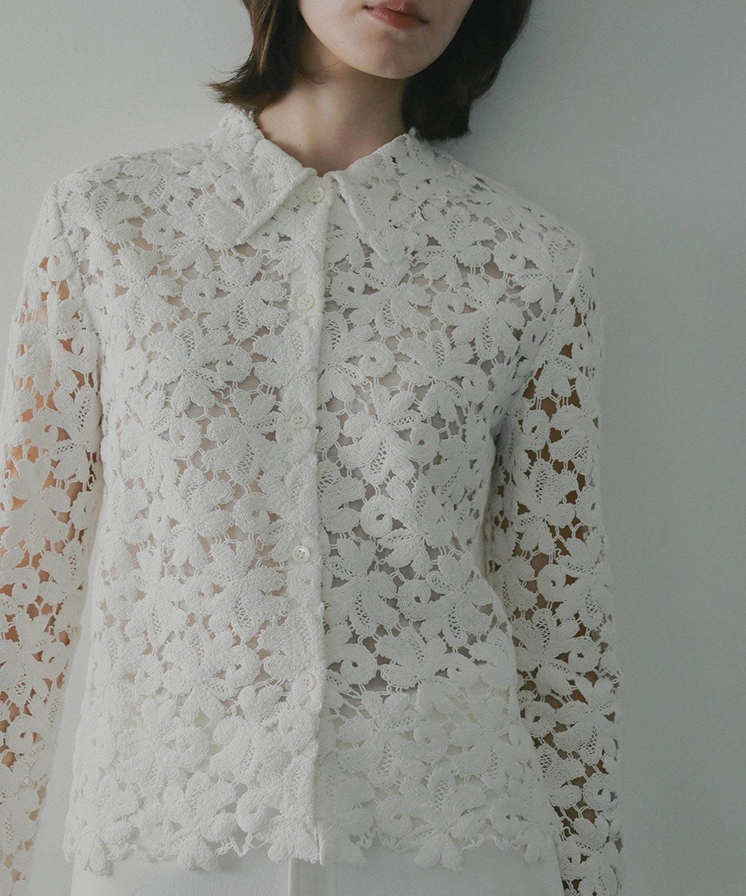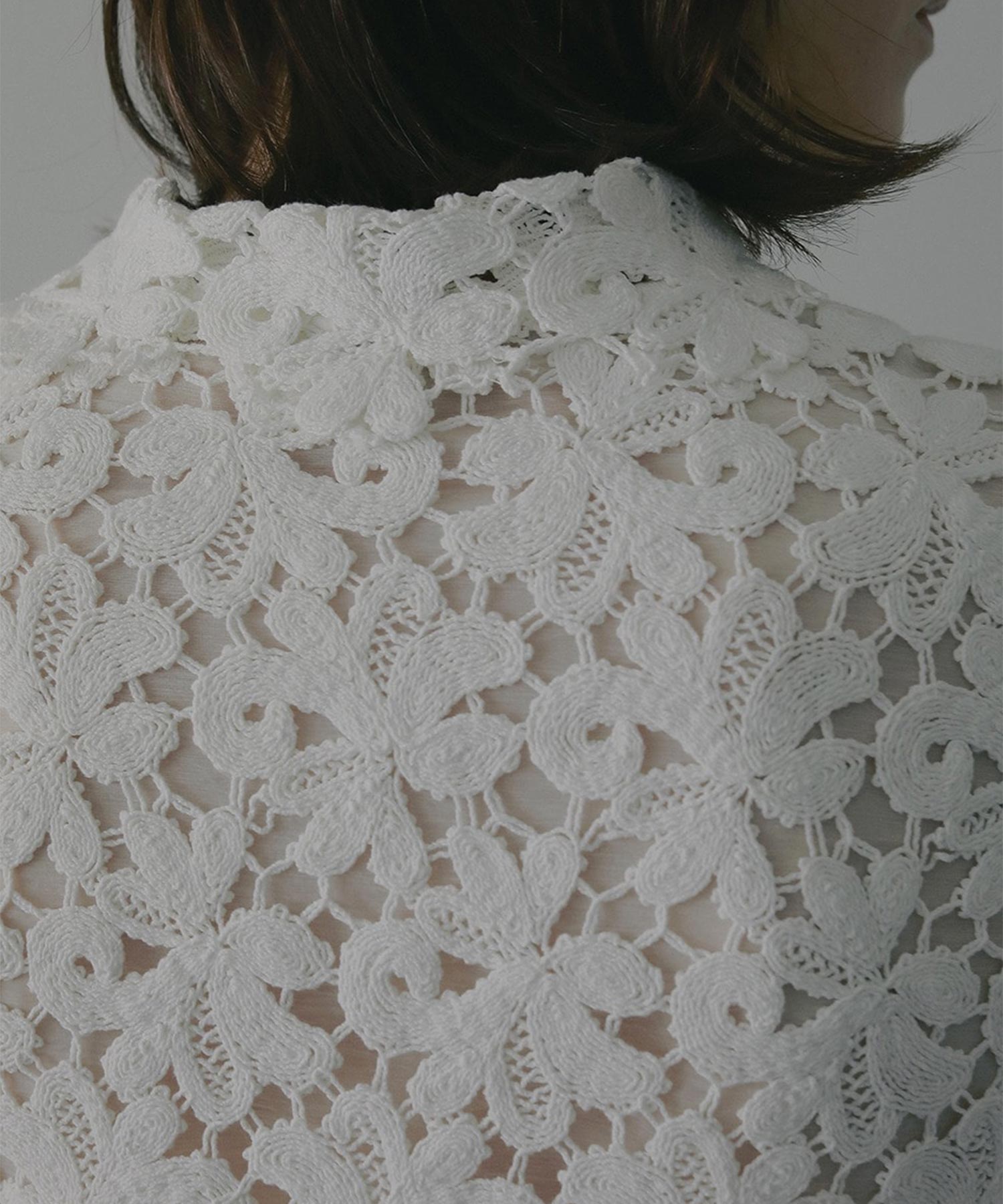 コットン素材のふっくらとしたレースで、エレガントさを抑えた甘くなりすぎないデザインに。コンパクトで正統派なレギュラーカラーにすることで気軽に着ていただきやすくしております。身頃にはシアー素材の裏地を重ね、透け感をほど良くセーブ。裾や襟先にあしらったスカラップが軽やかなニュアンスをプラスしてくれます。