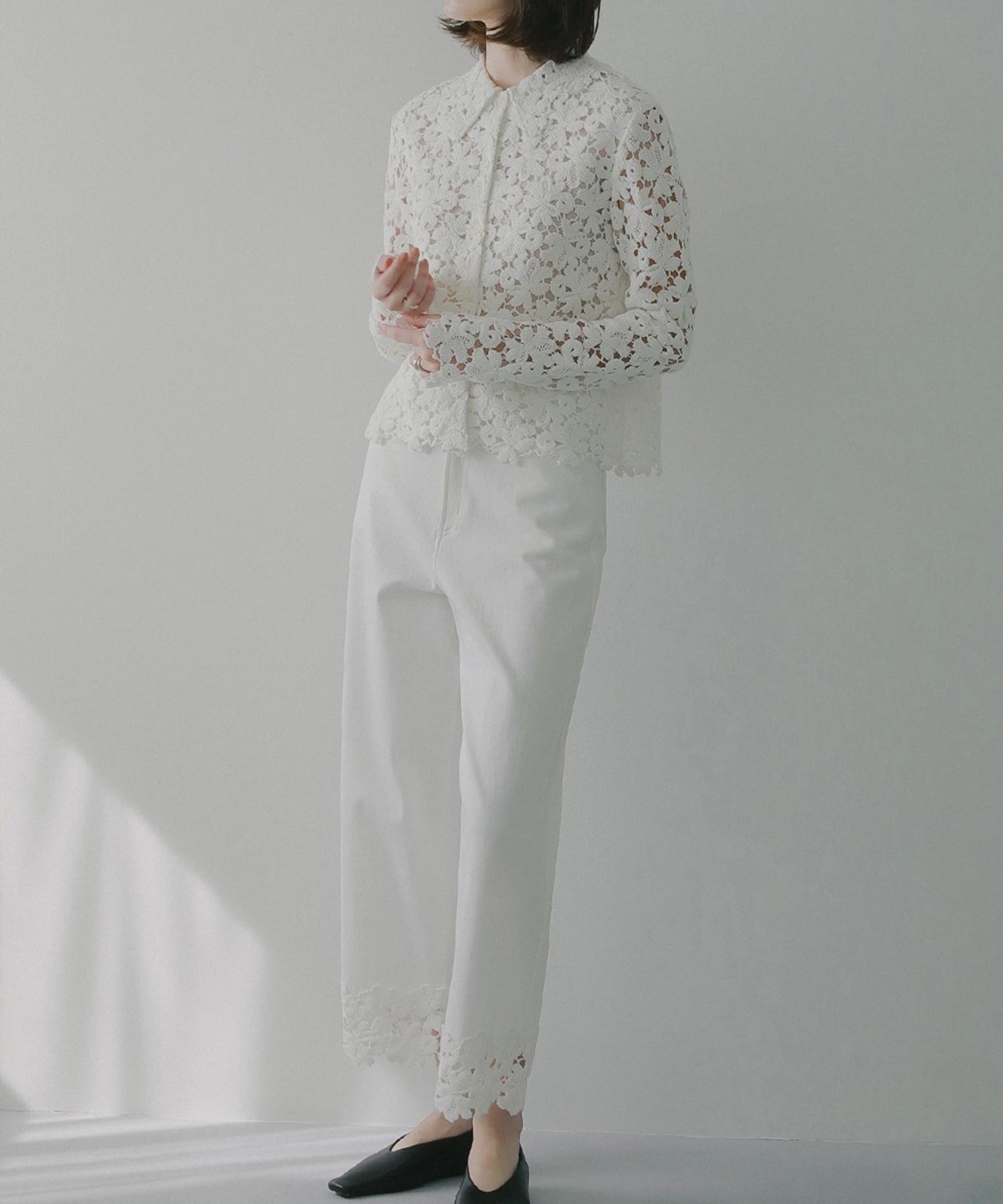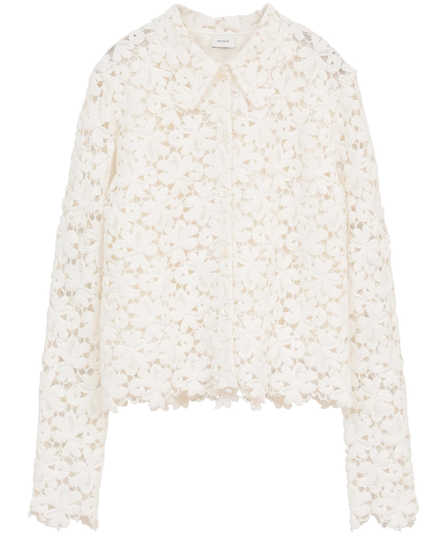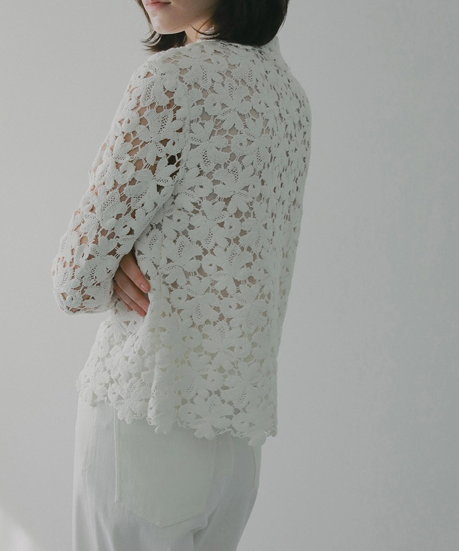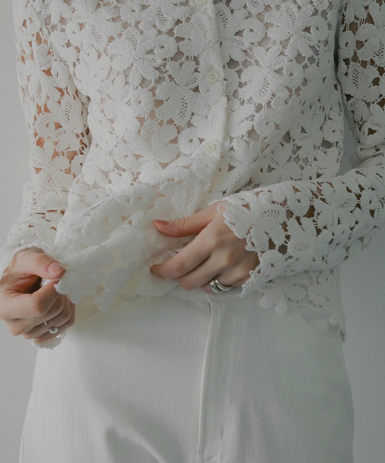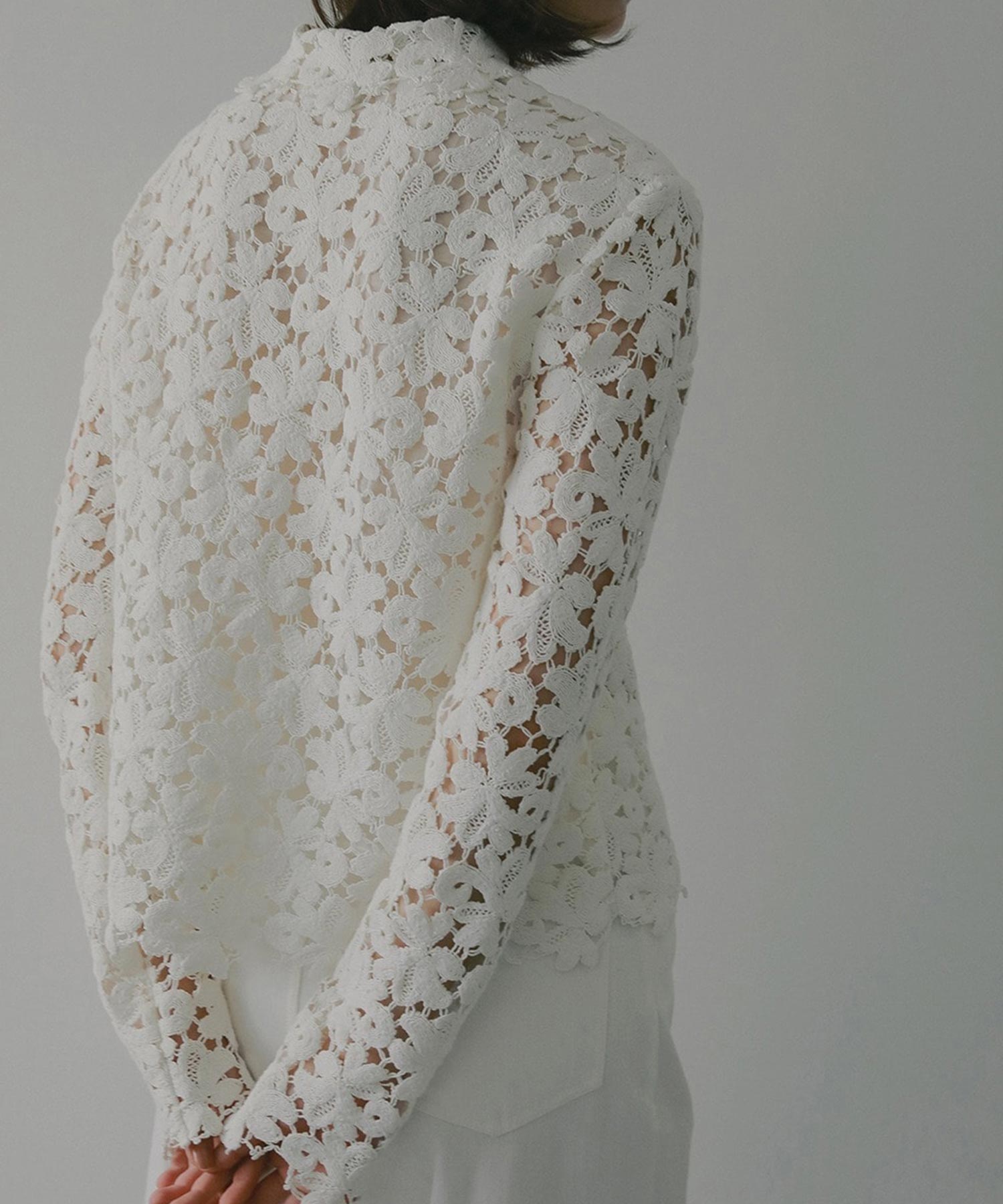 コットン素材のふっくらとしたレースで、エレガントさを抑えた甘くなりすぎないデザインに。コンパクトで正統派なレギュラーカラーにすることで気軽に着ていただきやすくしております。身頃にはシアー素材の裏地を重ね、透け感をほど良くセーブ。裾や襟先にあしらったスカラップが軽やかなニュアンスをプラスしてくれます。