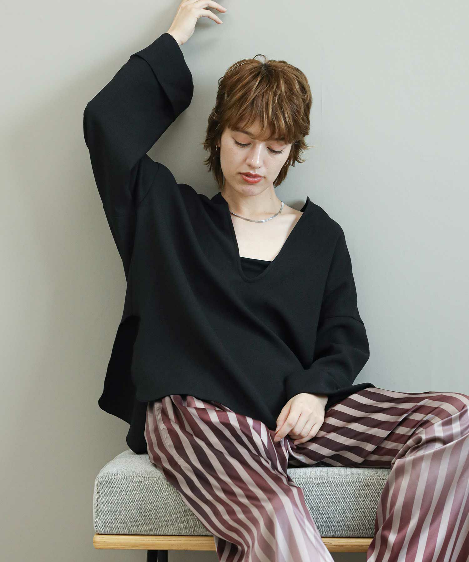 滑らかな落ち感のあるアムンゼン素材を使用したスリットブラウス。