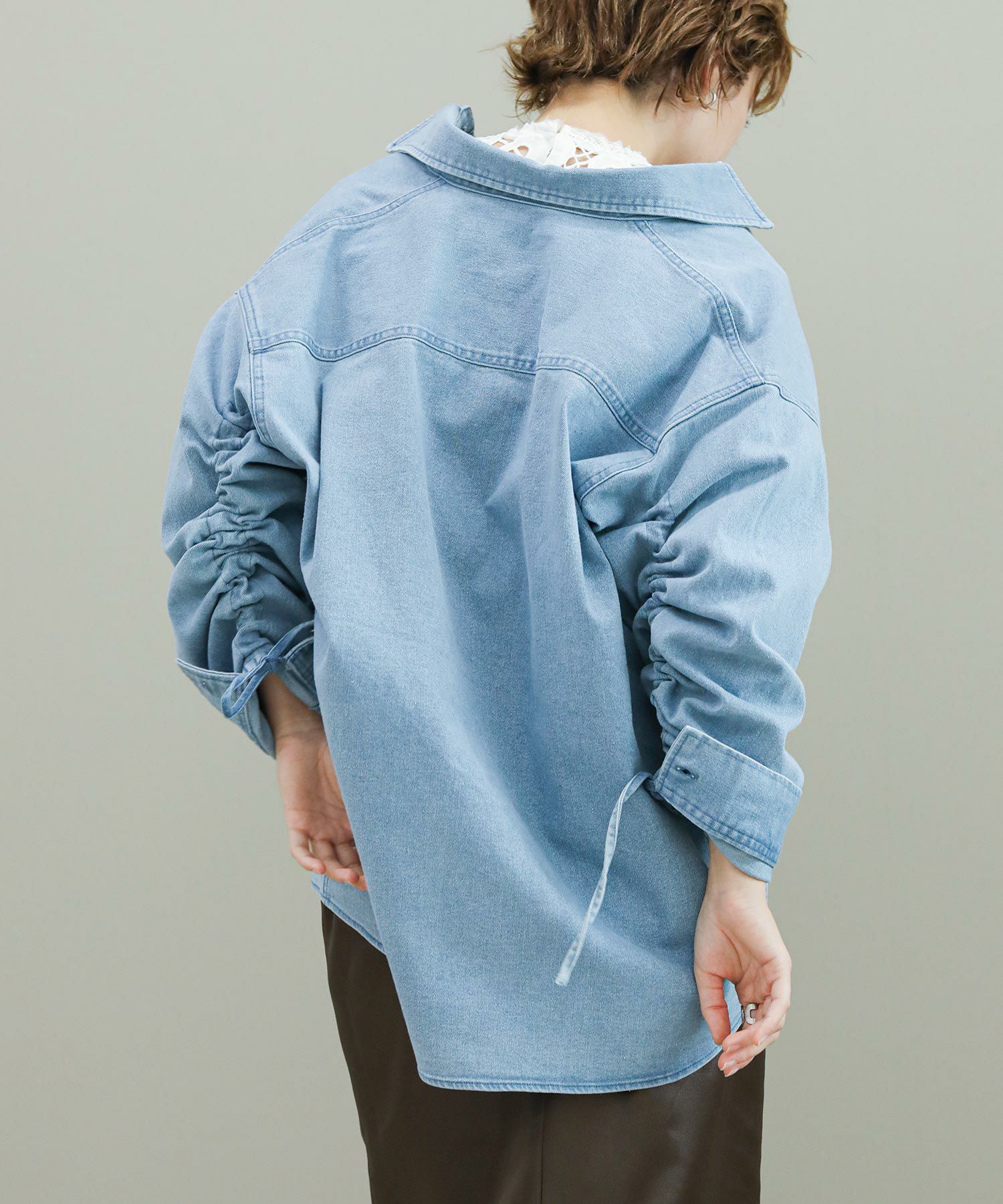 袖のドローコードでシャーリングを作り、袖のフォルムをアレンジできます。程よい肉厚のデニム生地がジャケット代わりにも。デニムはブリーチとボールバイオ加工でヴィンテージライクな風合いに仕上がっています。