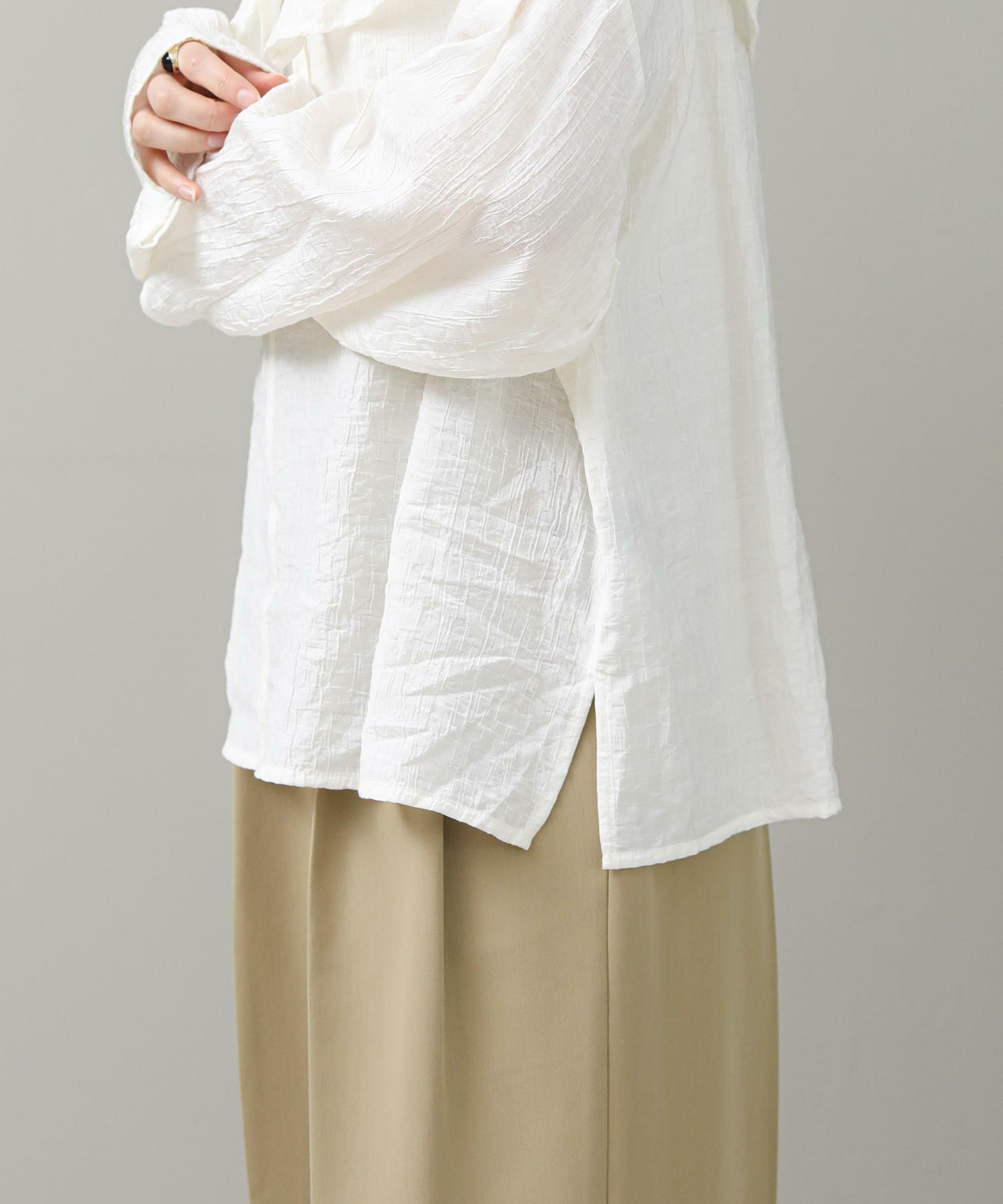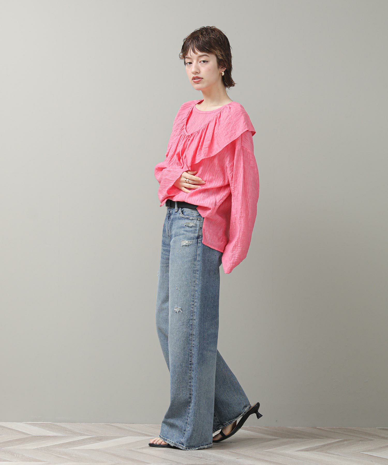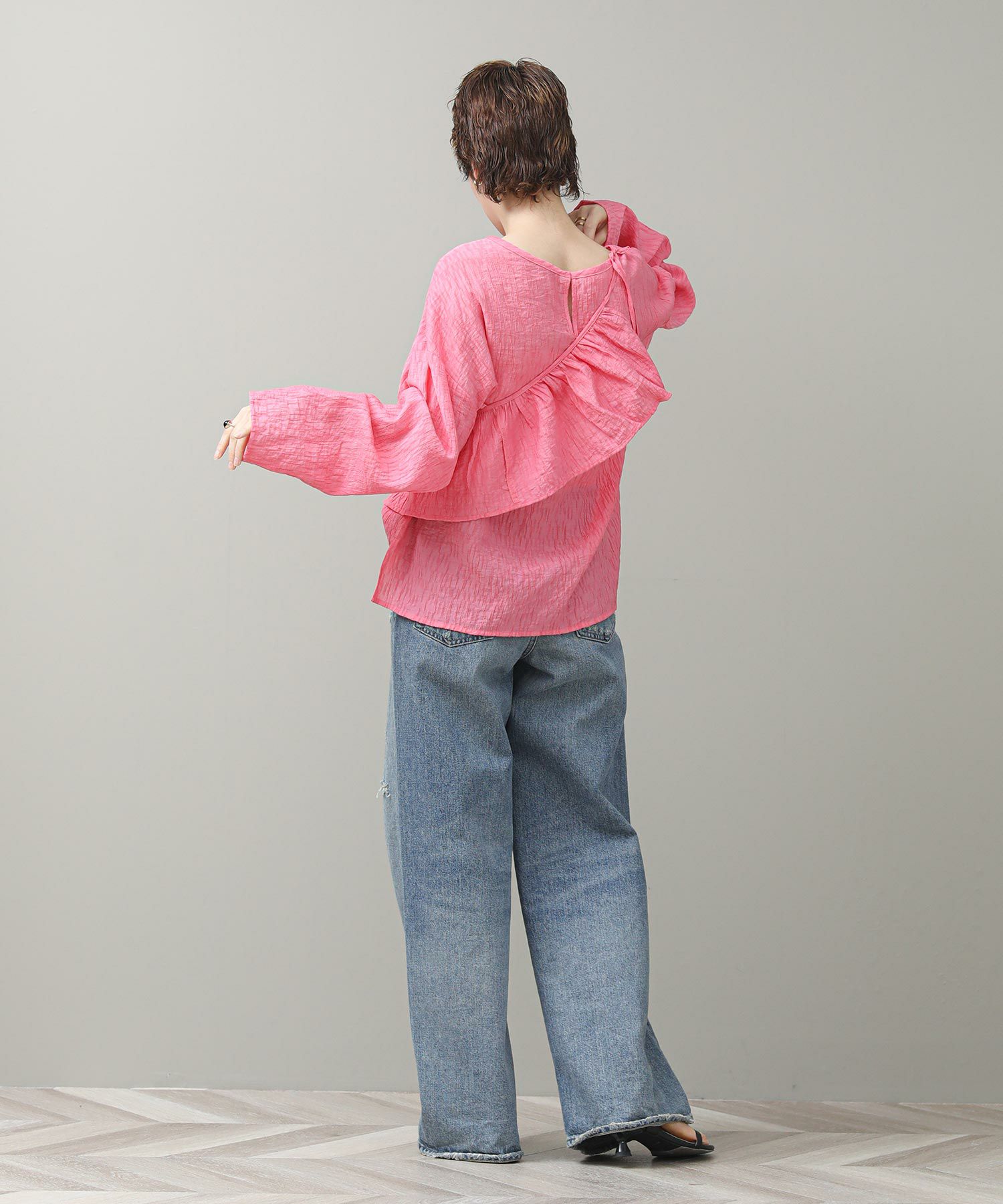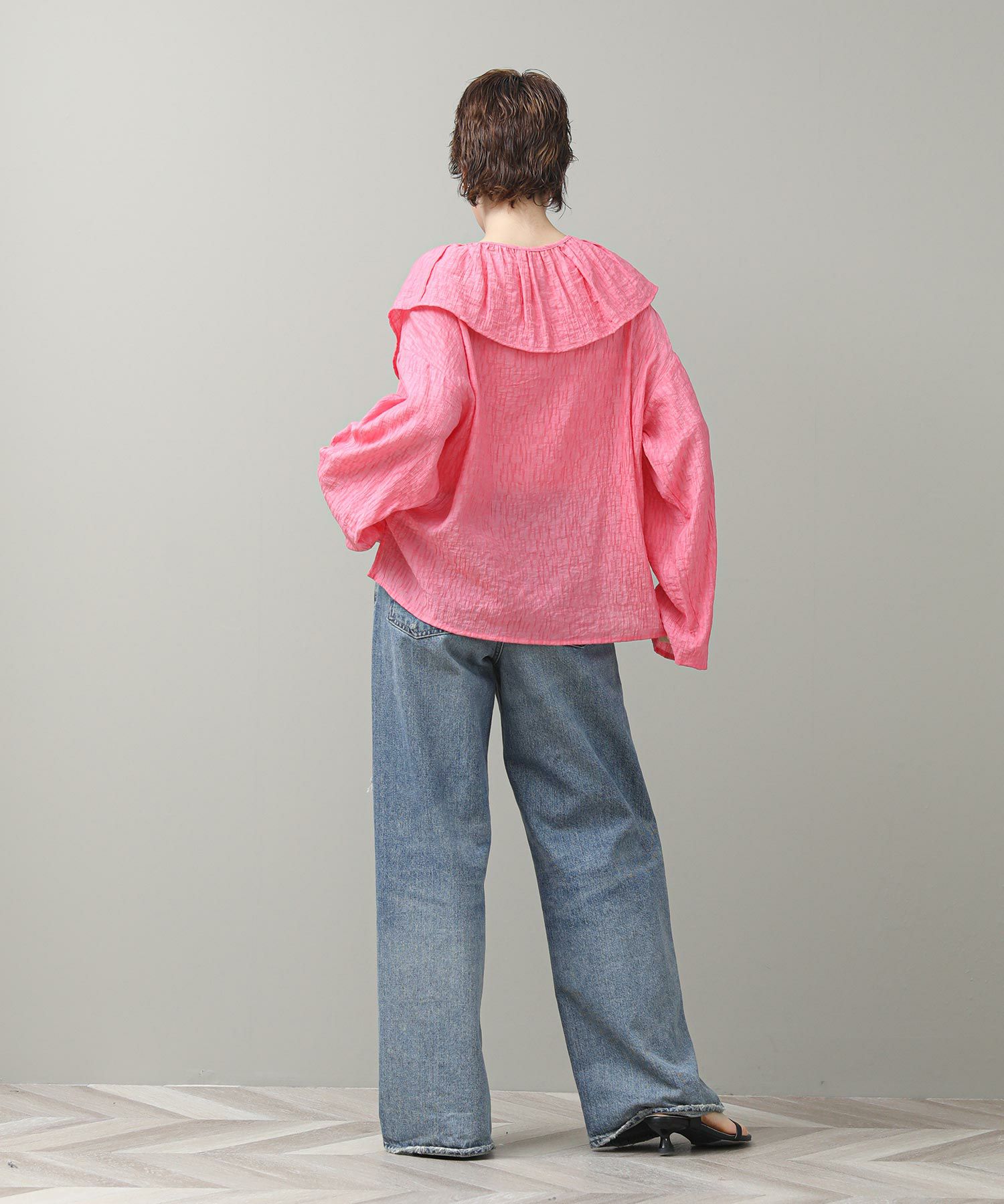 大きなフリル衿は着脱が可能でマルチWAYで使用できます。肩に垂らしてラッフルカラー風にしたり、腰の位置で巻けばペプラムデザインのブラウスにも。ブラウスだけで着るとTシャツ感覚で着られてジャケットやカーディガンのインナーにも重宝します。目を惹くビビットなピンクが春の気分を高めてくれる1枚です。