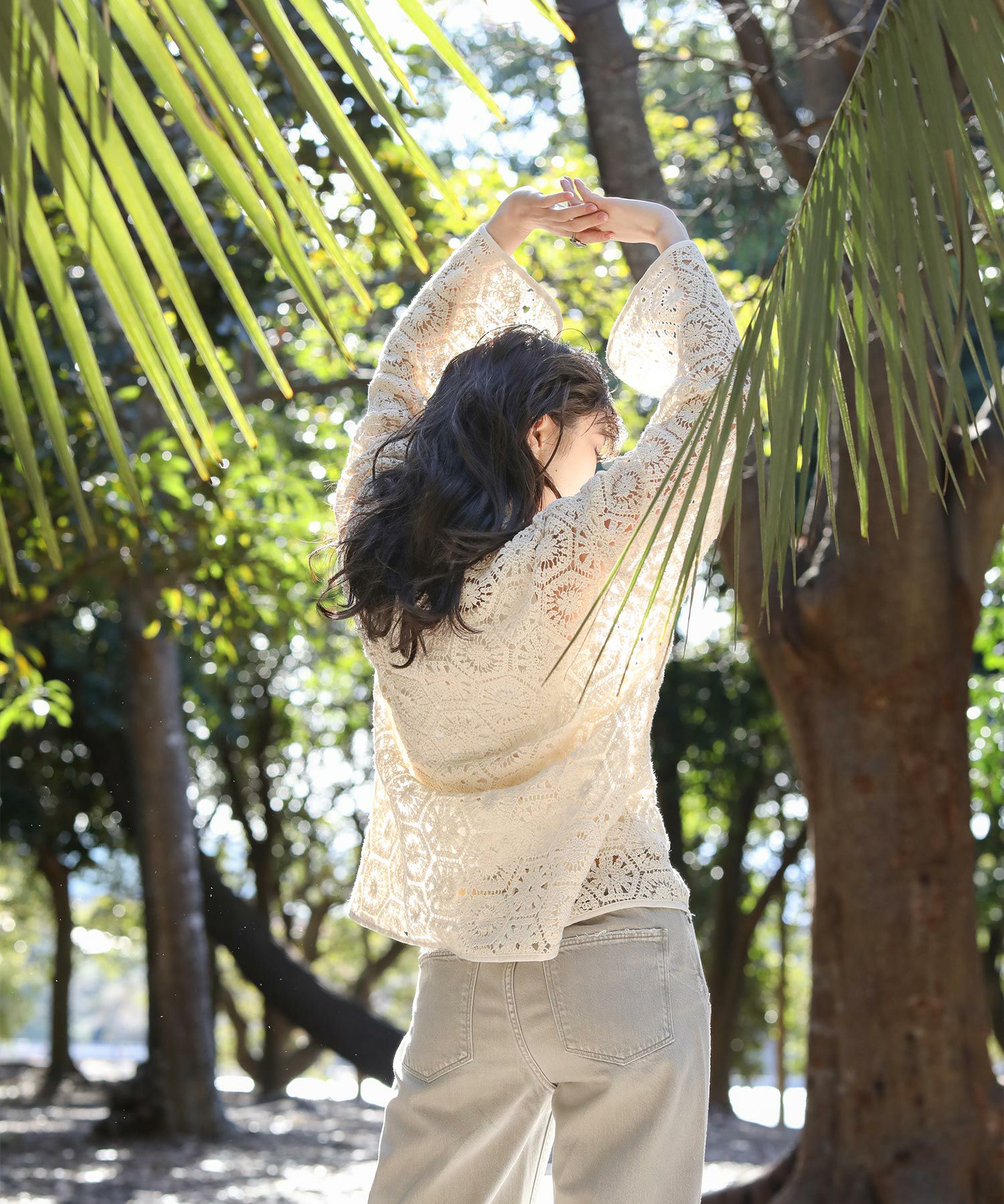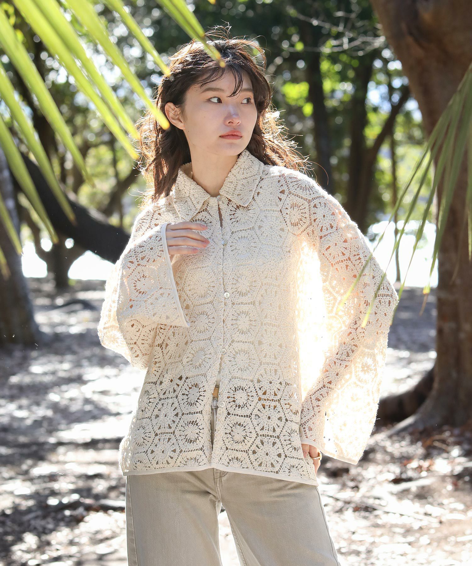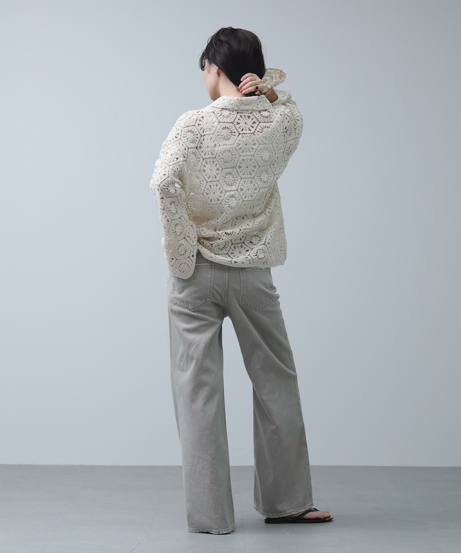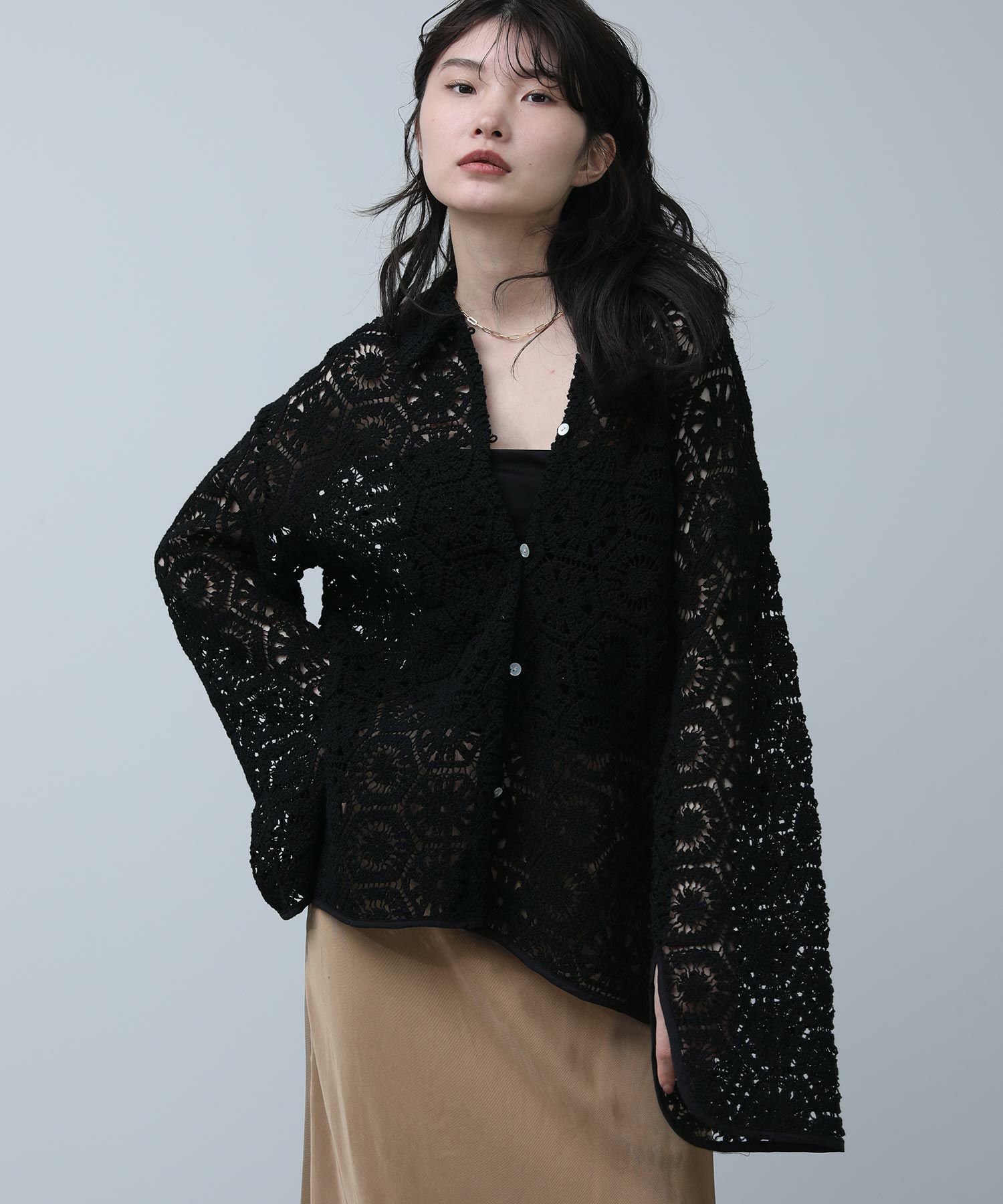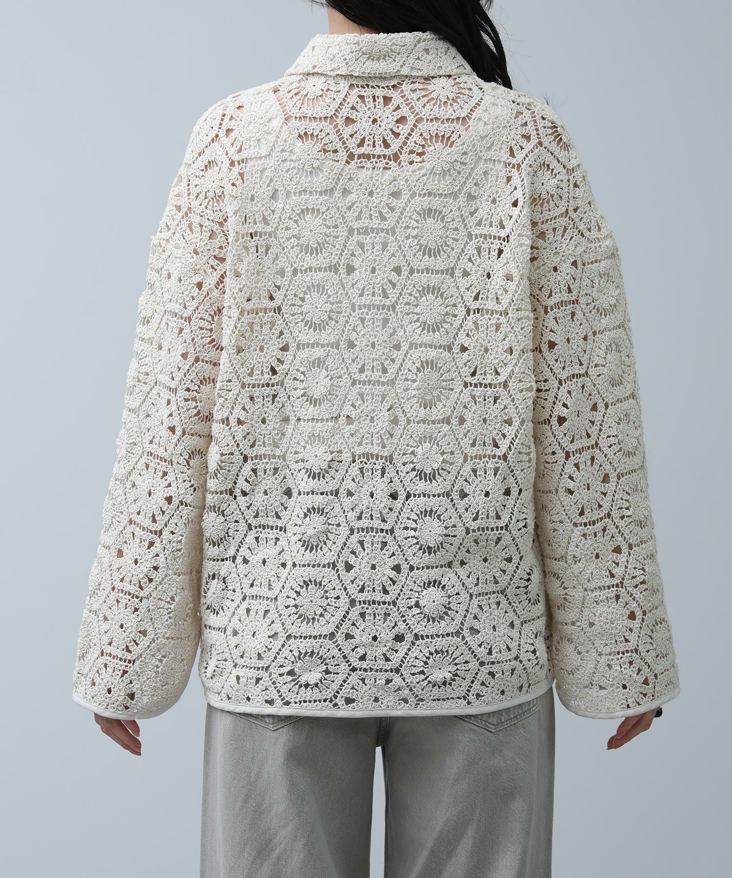 繊細なレースで旬な着こなしが叶います。程よくゆとりのあるサイジングなので、ラフに羽織ってもバランス良く着ていただけます。まだ肌寒い時期やロンTなどの上に羽織としてもおすすめ。季節が進めば、キャミやタンクをインナ―に大人の肌見せスタイルをお楽しみいただけます。
