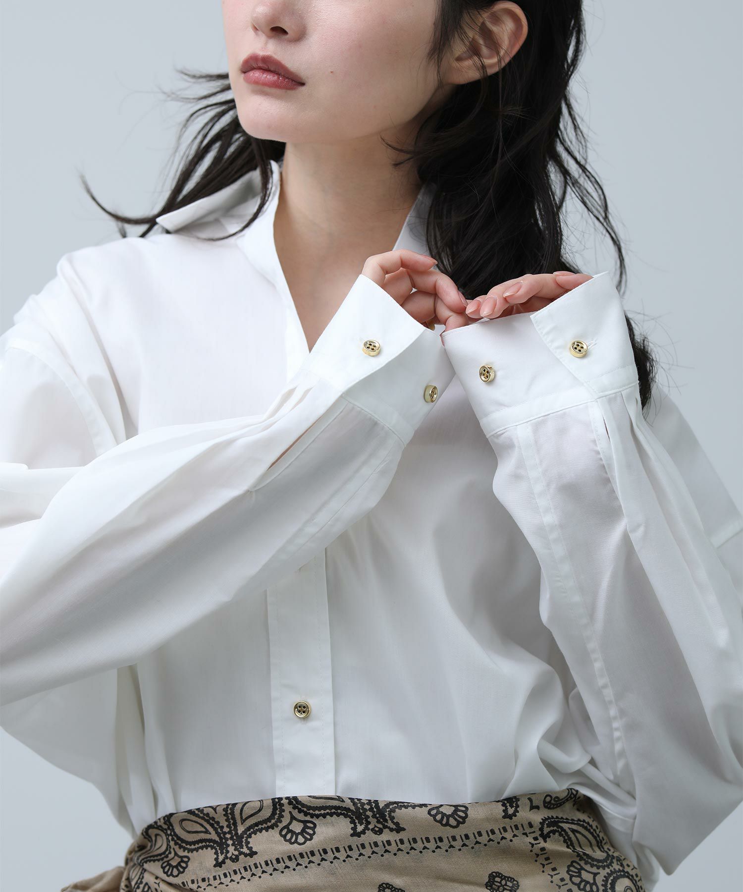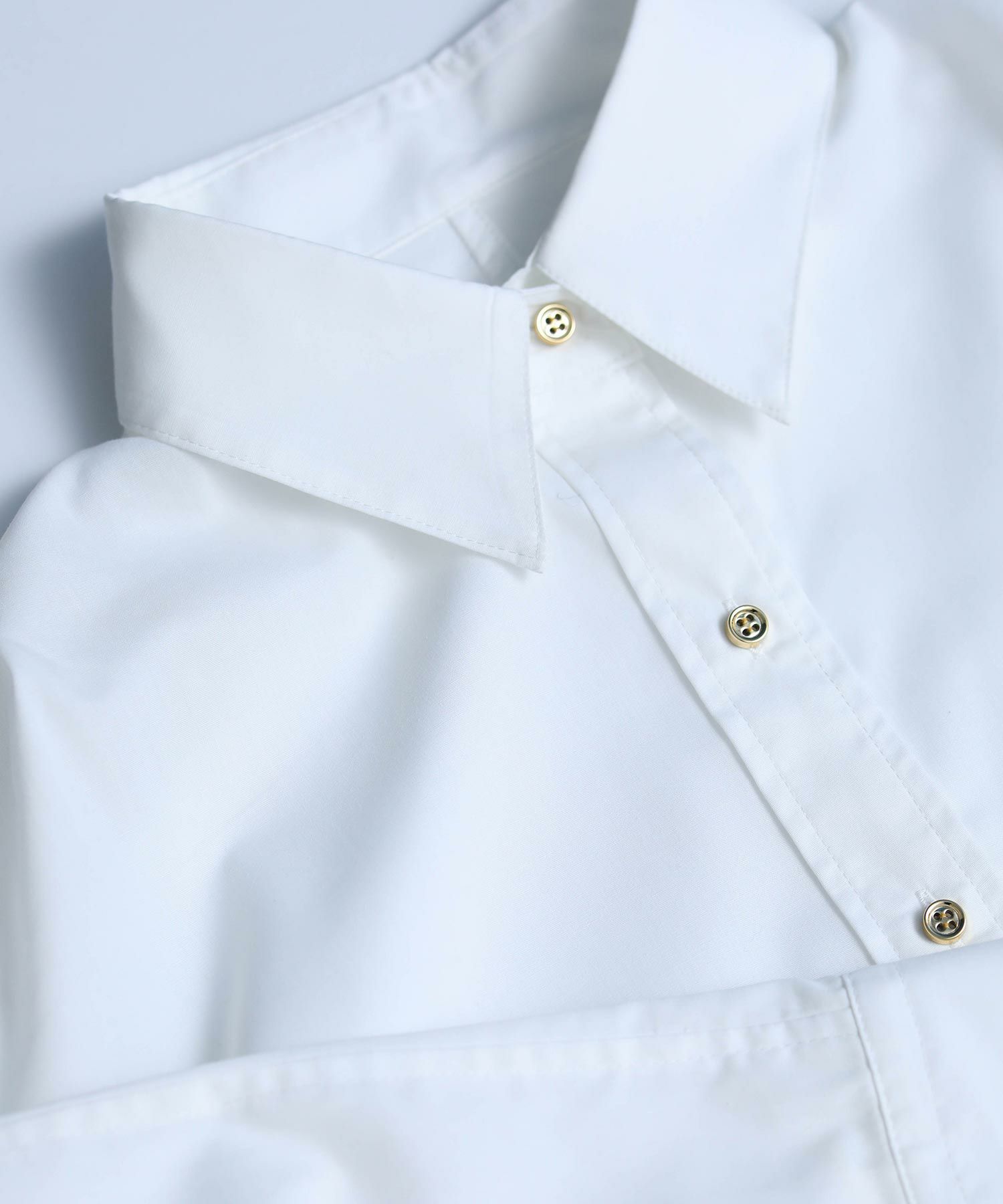 クリーンな白シャツで登場です。ベーシックアイテムも華やかな釦がアクセントになり、1枚でも着映えします。肩にタックを取ることで、衿を抜いてきたときのシルエットが綺麗に決まります。シワが気にならず、お手入れも簡単なのでお仕事着にもおすすめです。