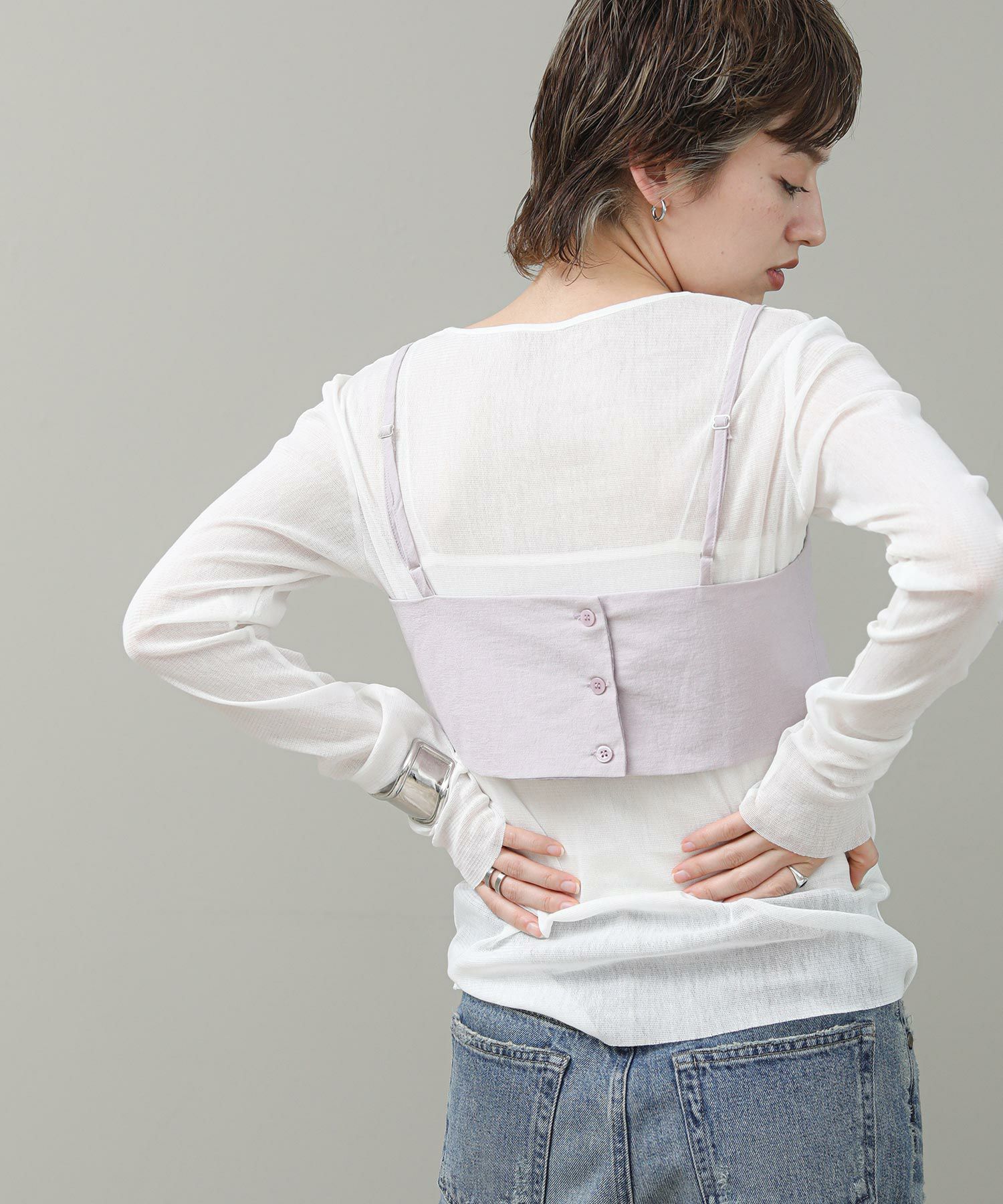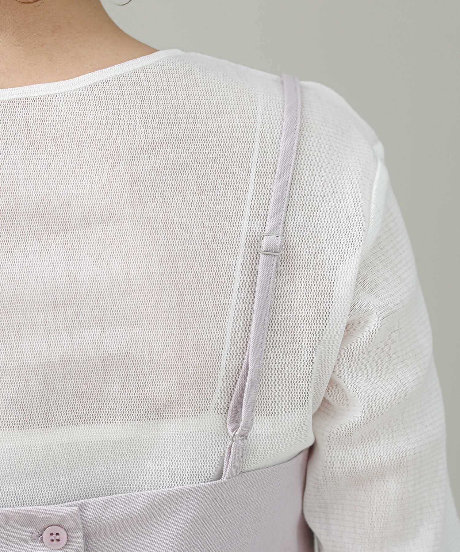 シャツやTシャツとのレイヤードスタイルが楽しめます。テーラードジャケットの上から重ねても更に今のムードの着こなしが実現します。背中の釦は全部留めず、上だけ止めでゆるっと着るのもおすすめです。肩紐はアジャスター付きで調節が可能なのも嬉しいポイントです。