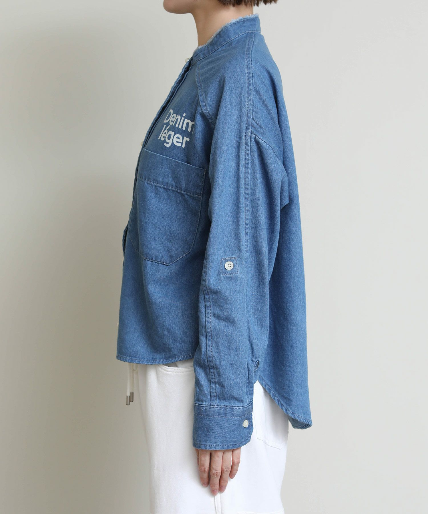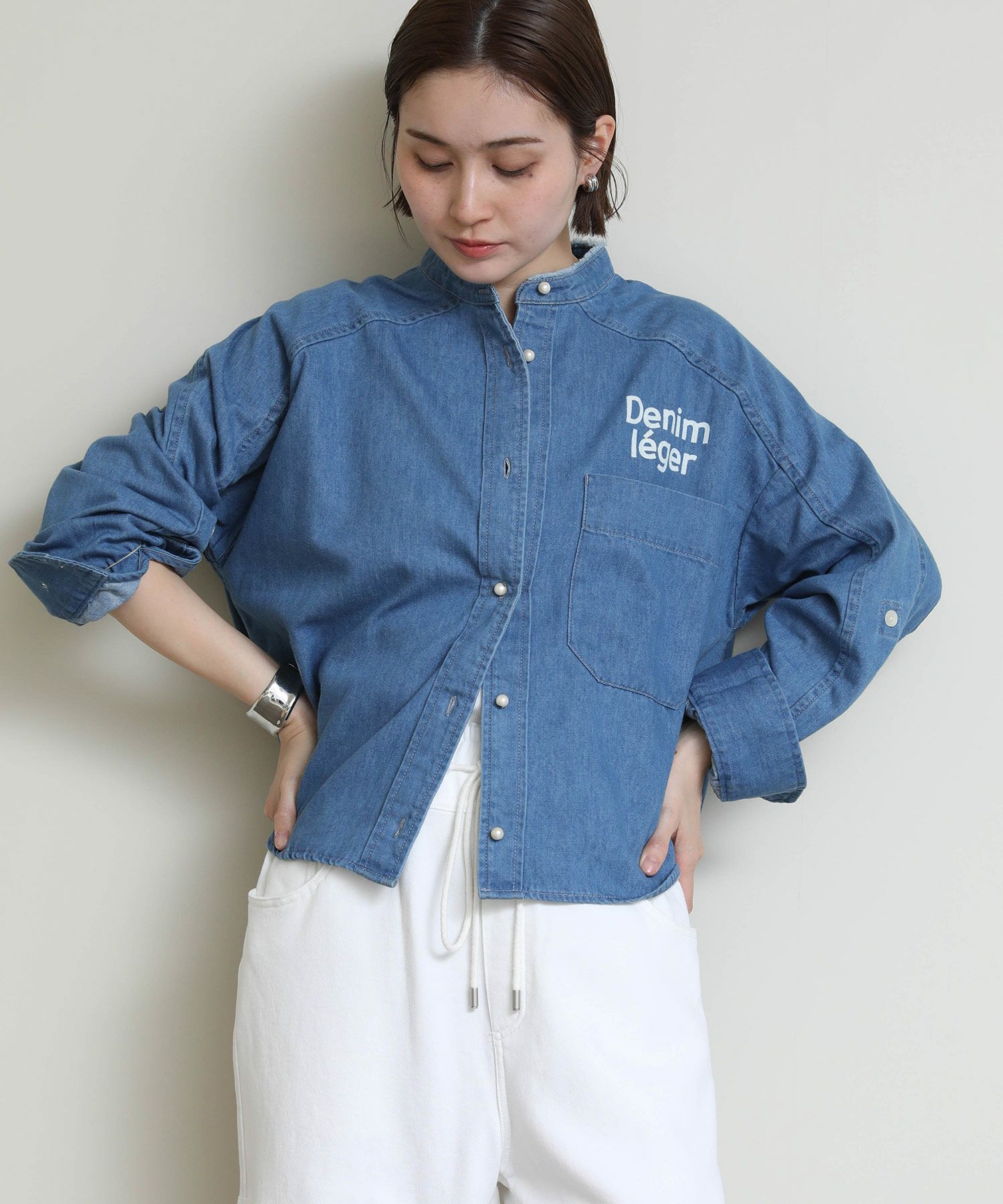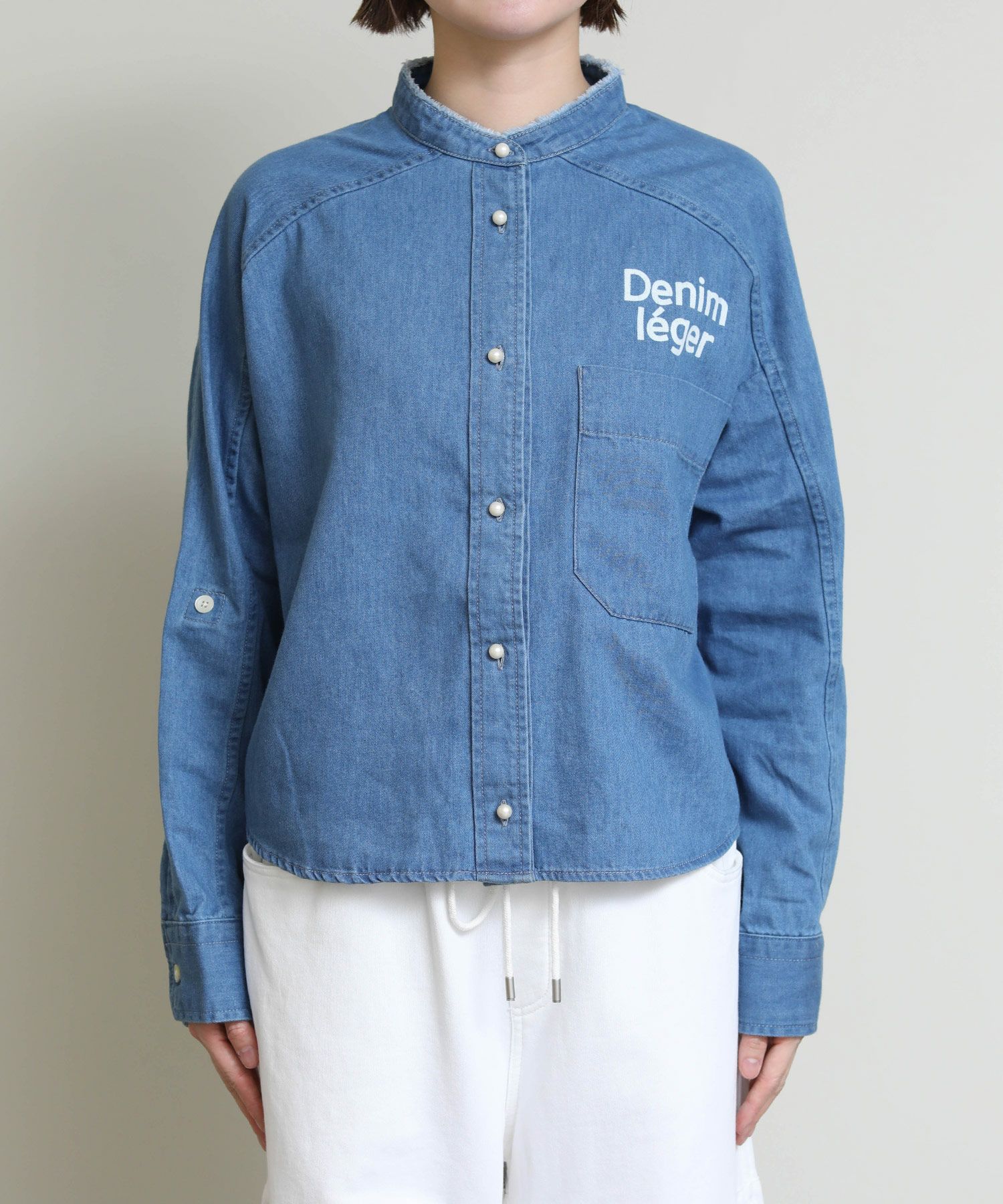 パールボタンとロゴプリントがポイントのデニムシャツ。