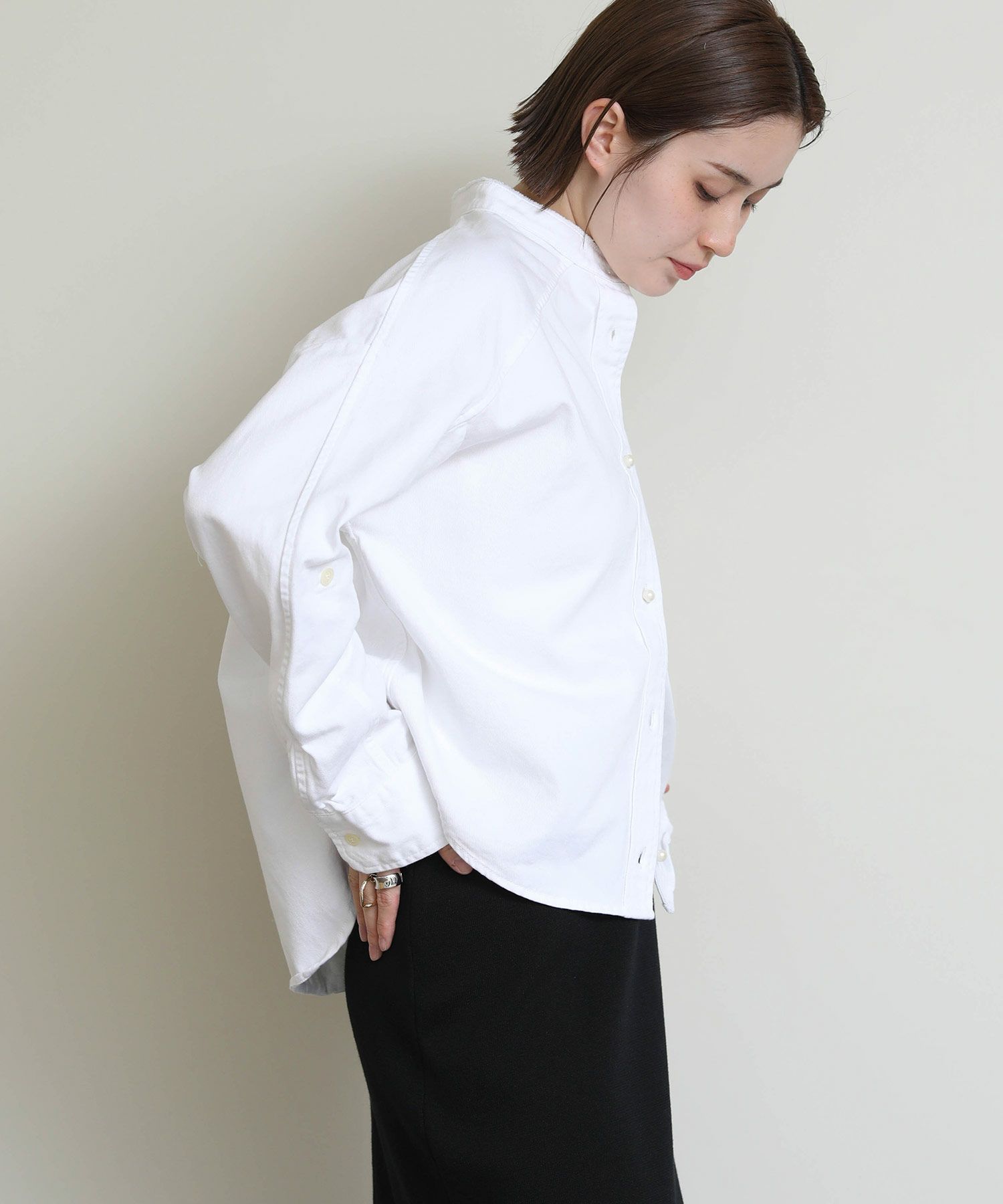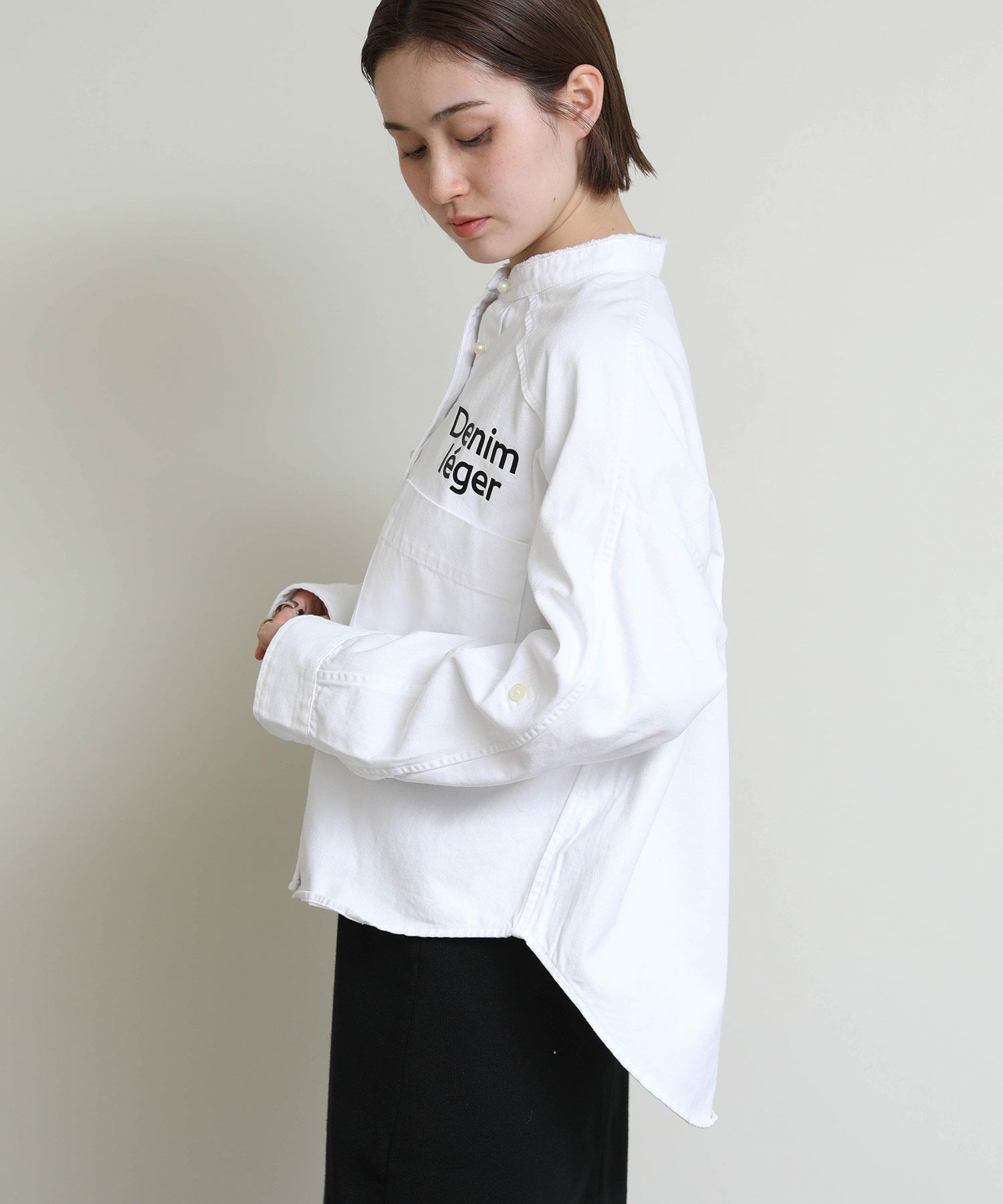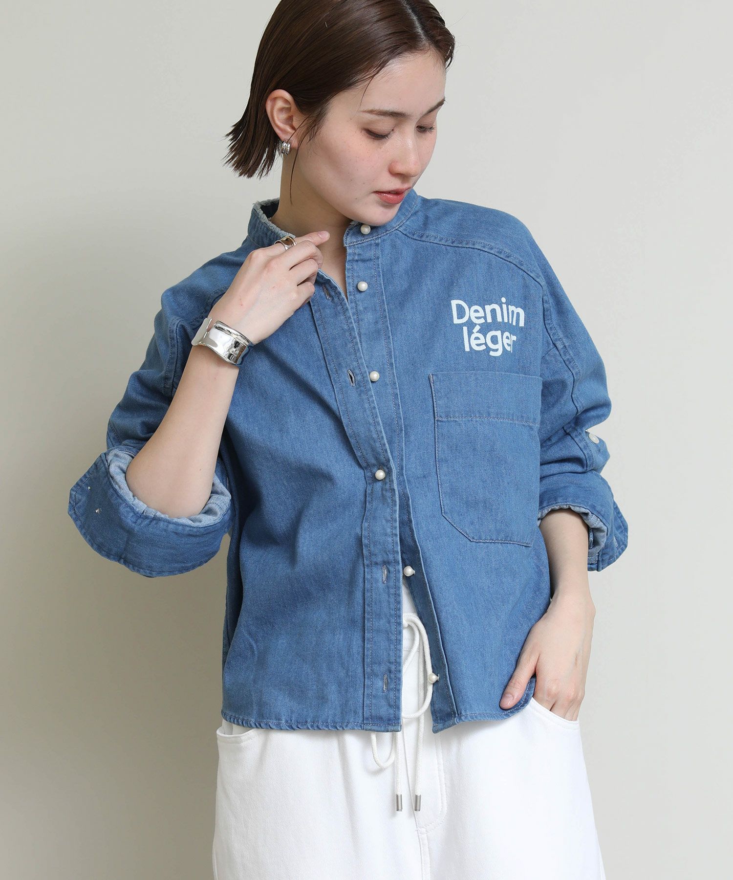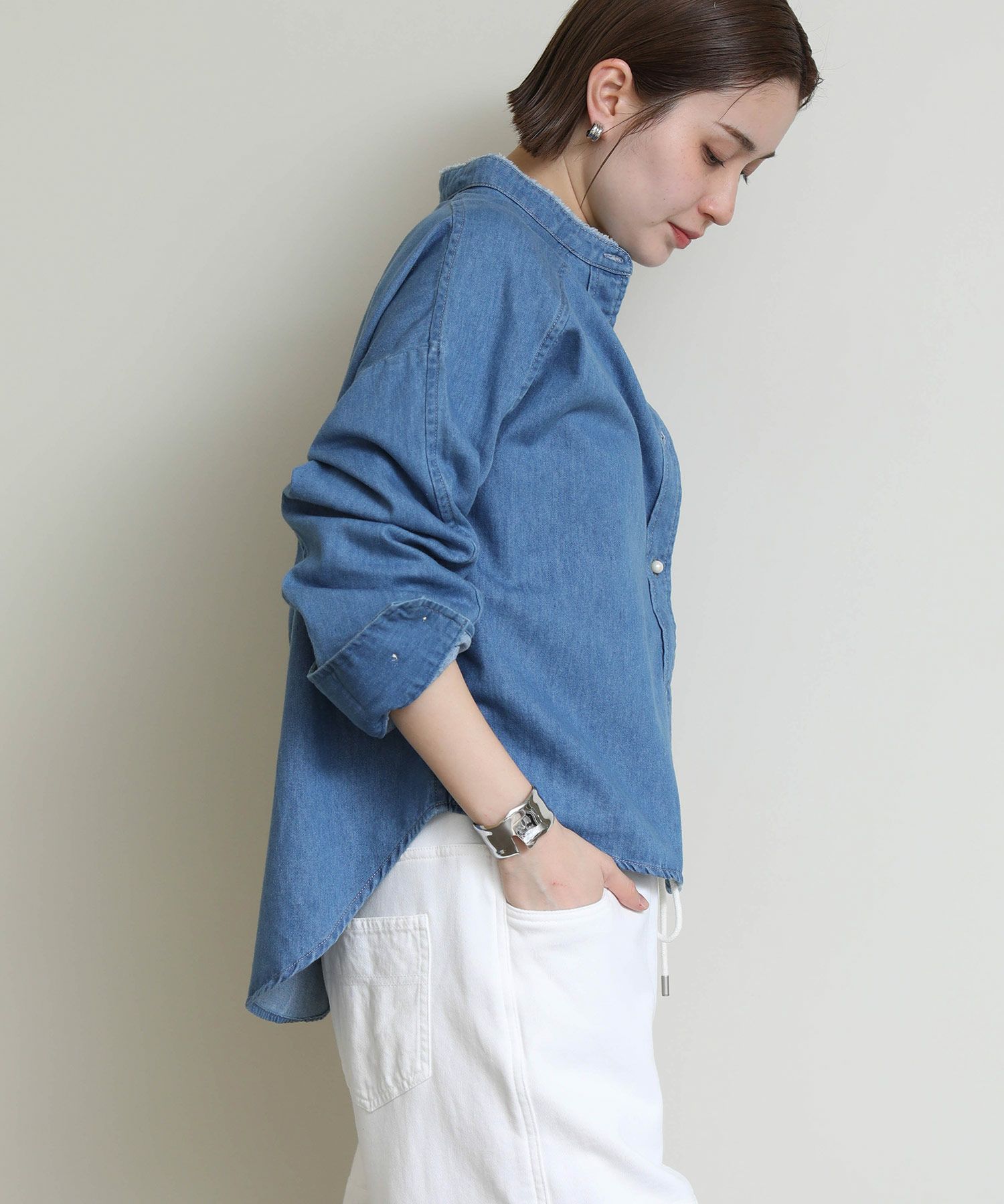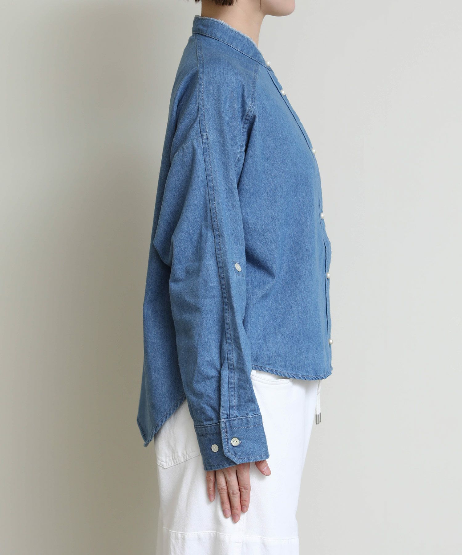 洗いざらしでケアが簡単なデニムと上品なパールボタンが好相性。 ヴィンテージ加工のライトなブルー、爽やかなホワイトとそれぞれ印象も異なりチョイスが楽しい2色。 パールボタンがアクセントになり、数あるデニムシャツの中でも目を惹く逸品。 シャツとして着ても、衿抜きして羽織ってもサマになります。