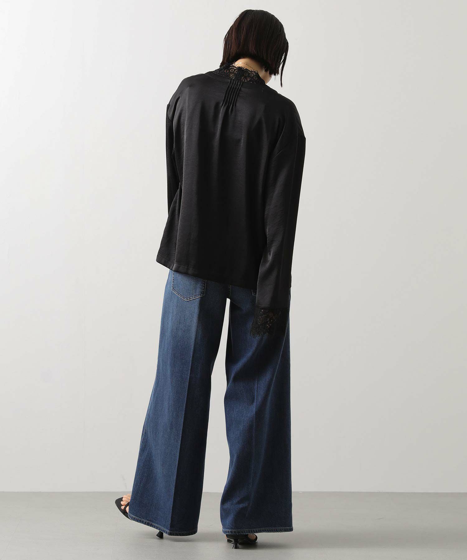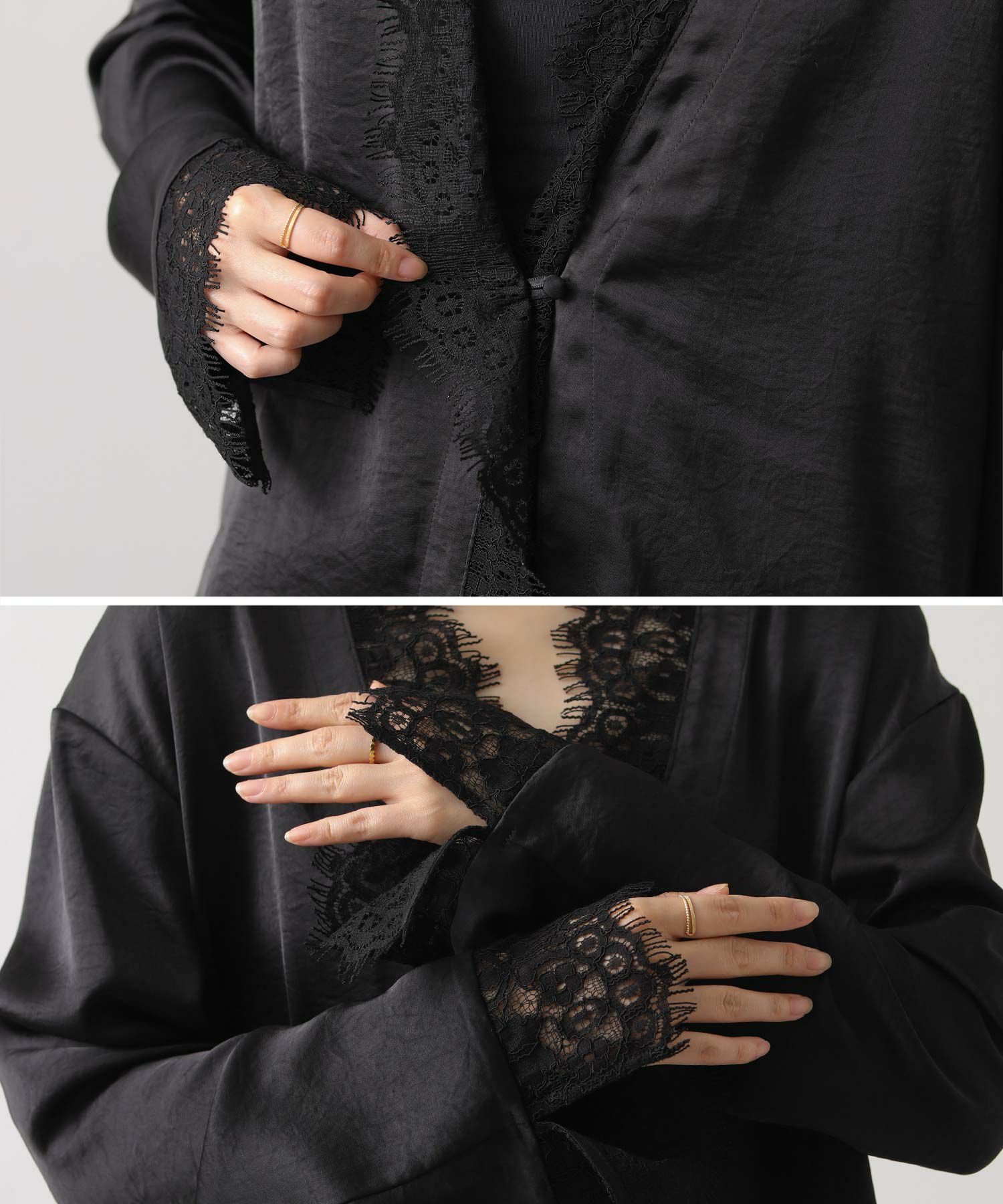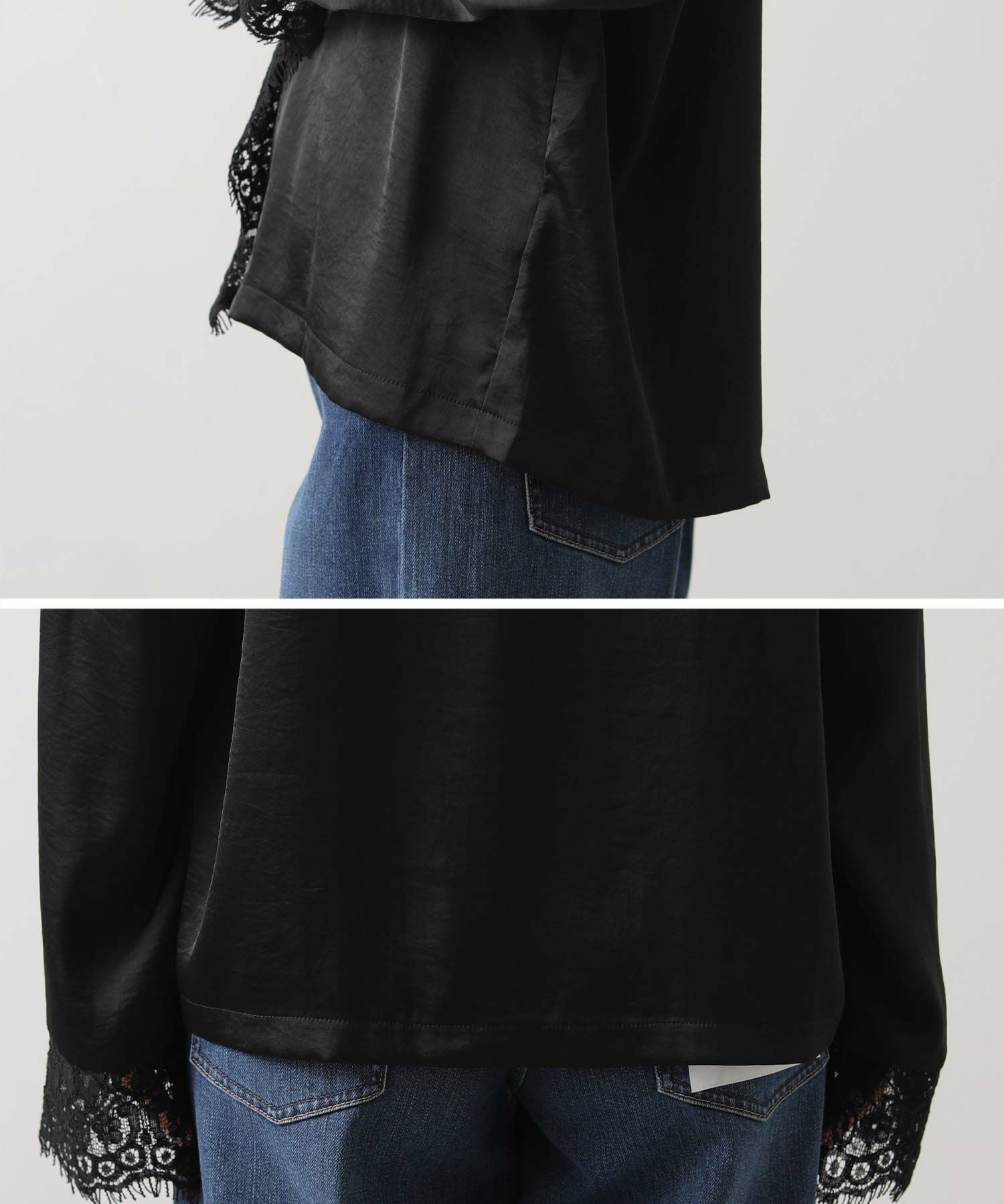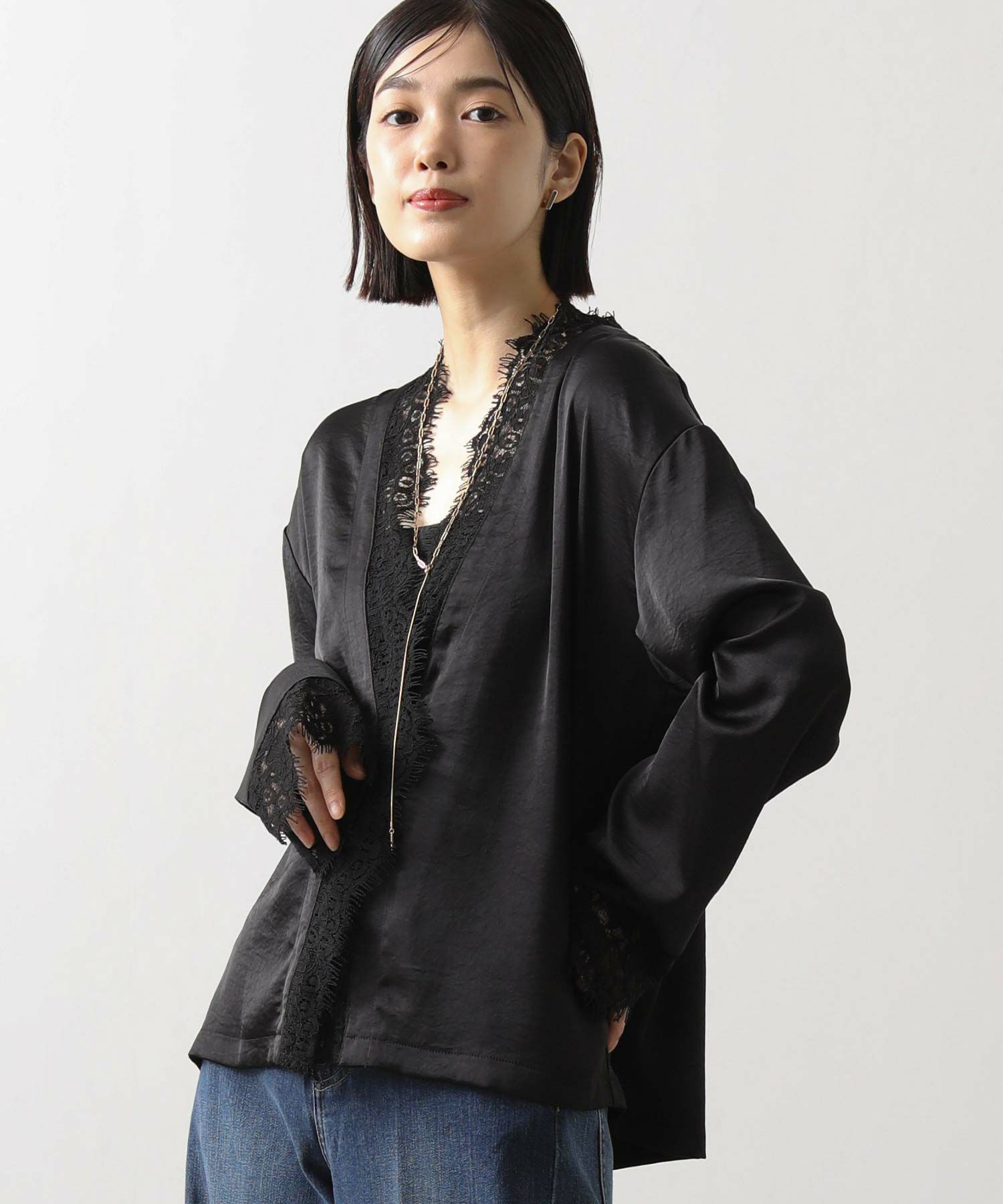 シルクのようななめらかな手ざわりと、自然な落ち感が大人っぽいレース使いブラウス。