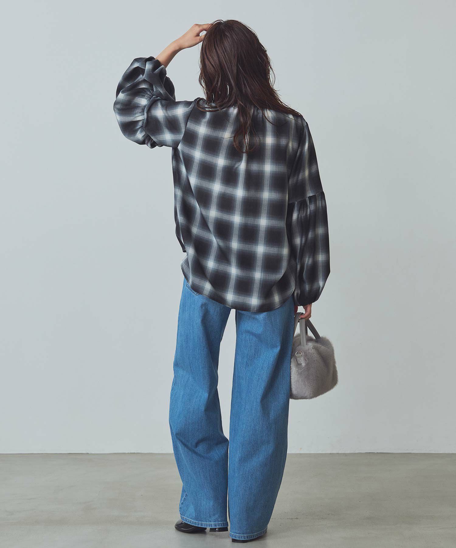 チェックボウタイパフスリーブブラウス