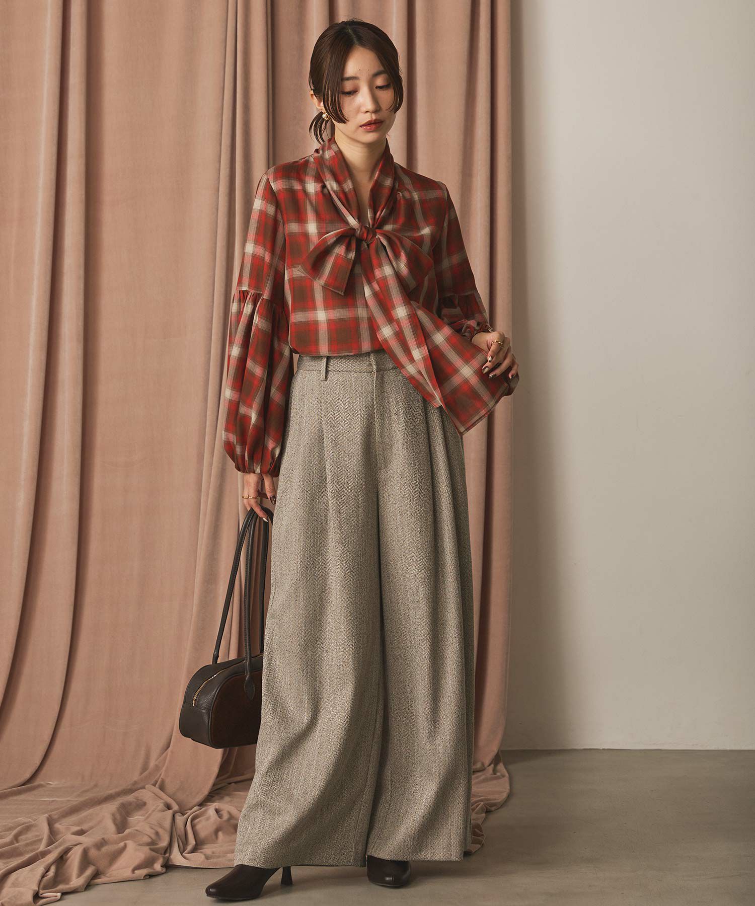 チェックの華やかなボウタイブラウス。