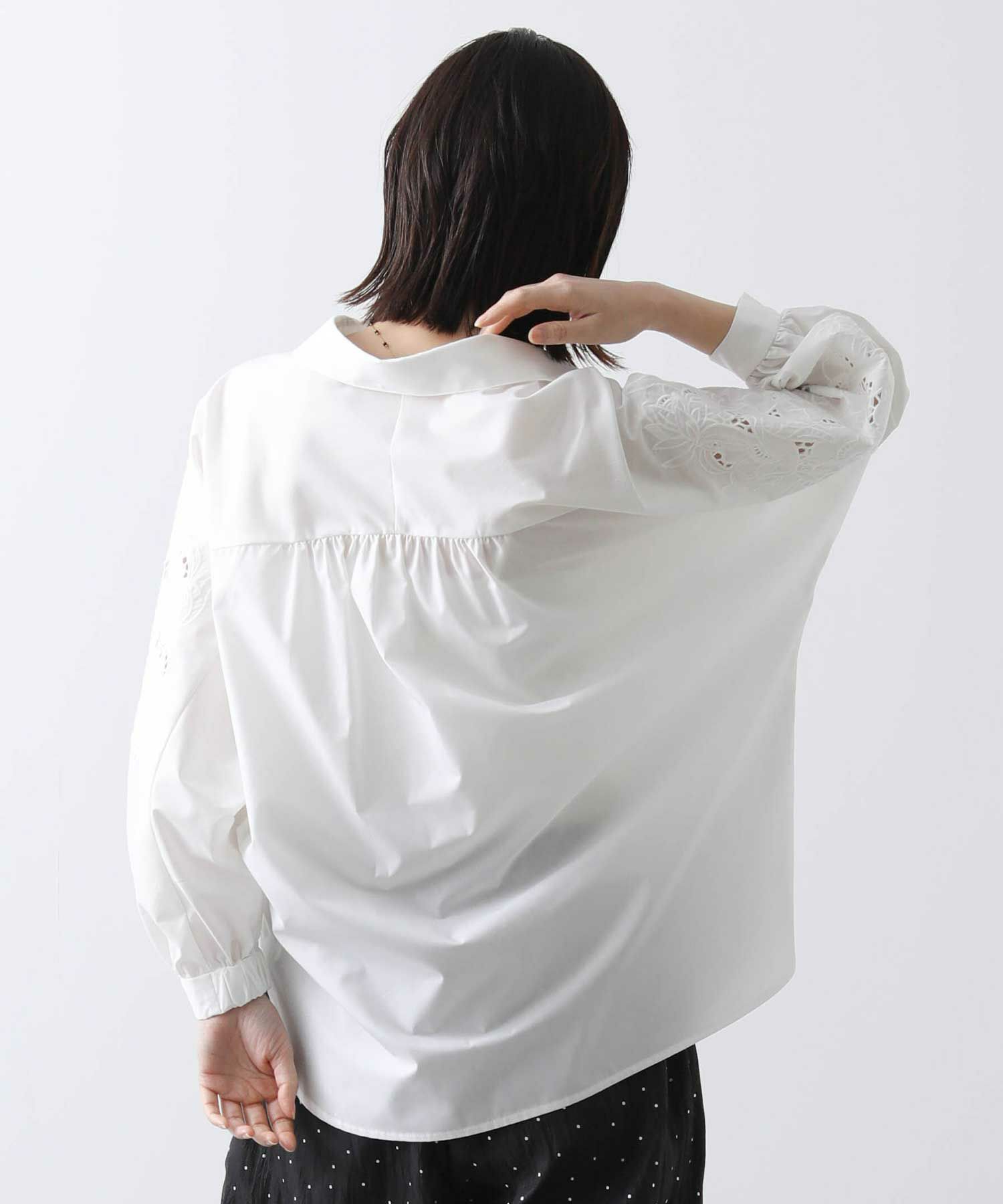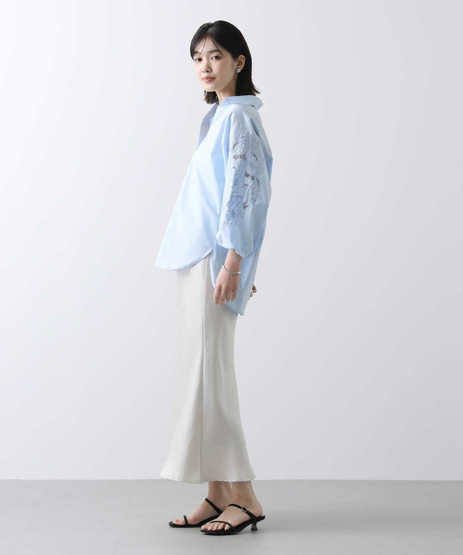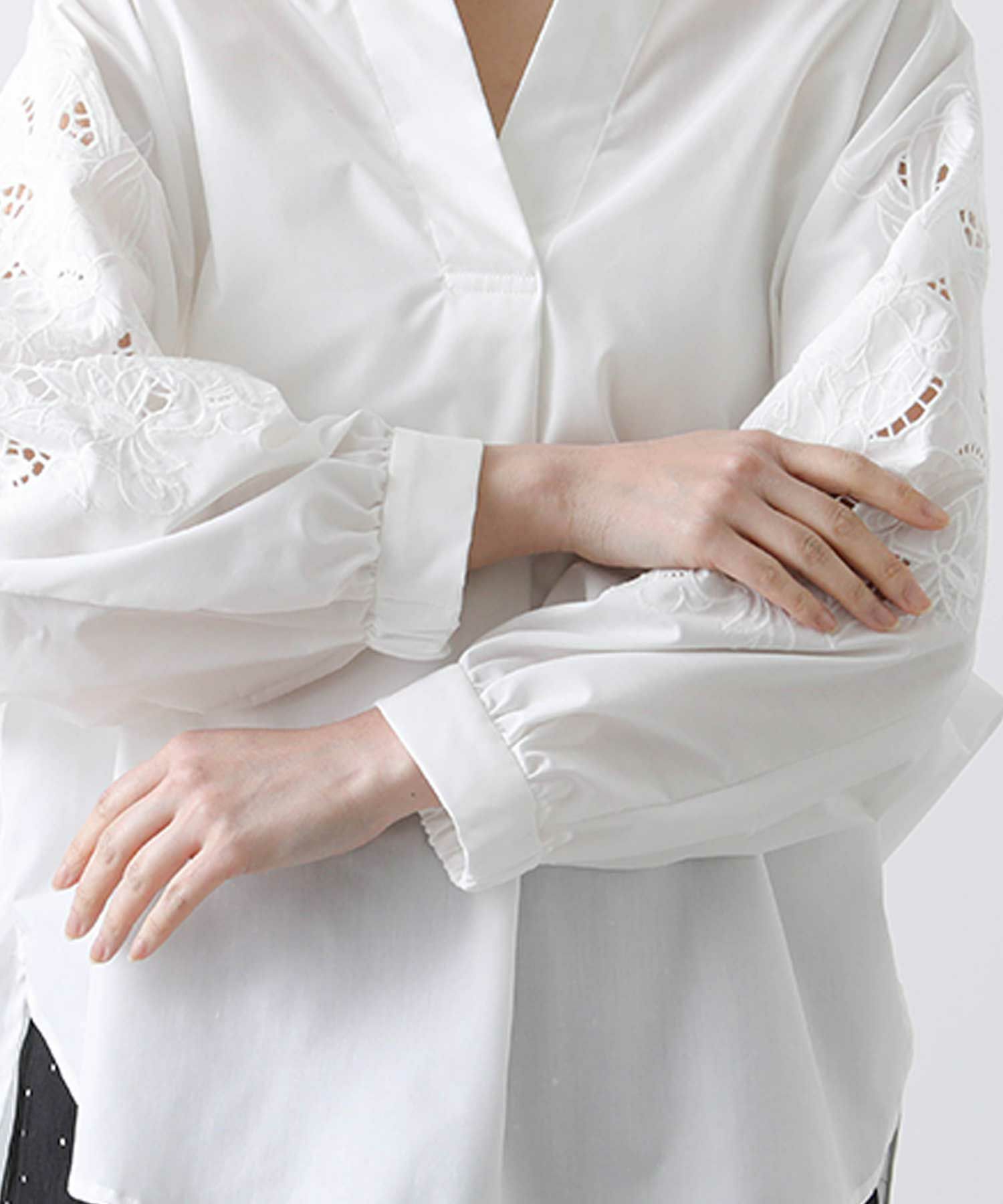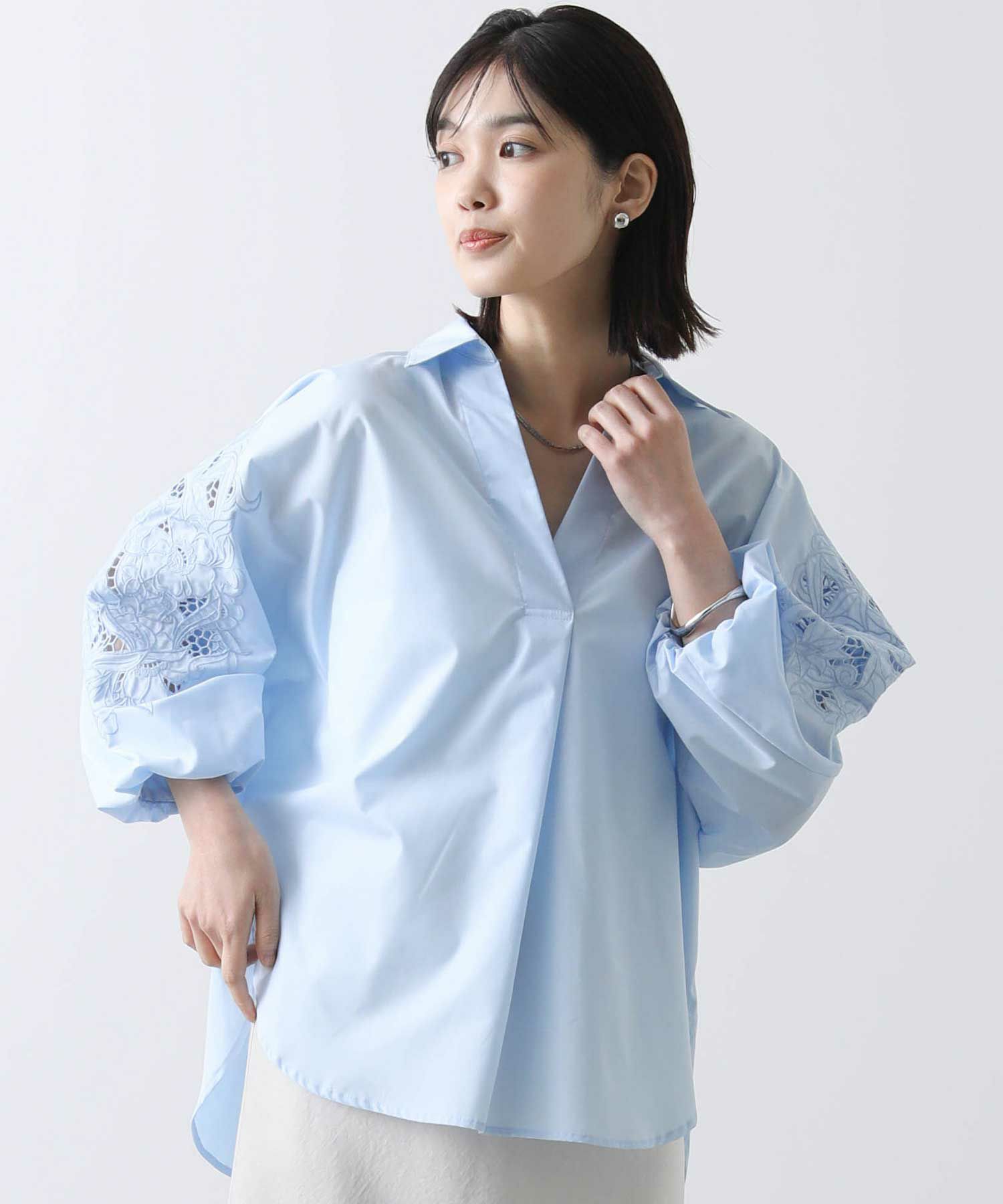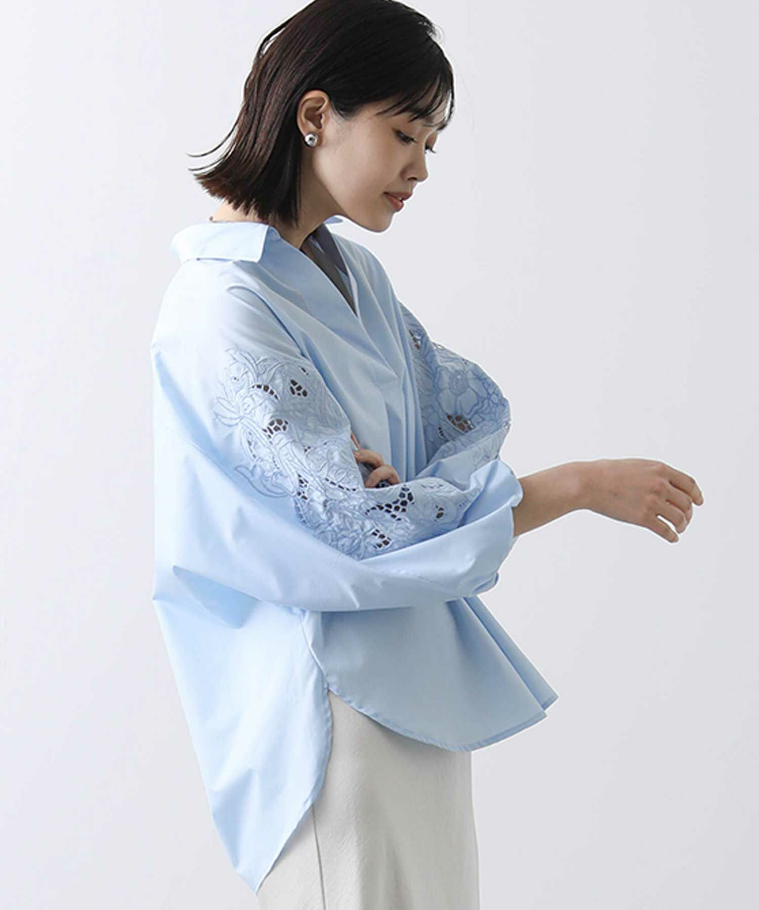 大胆な袖の刺繍が目を惹くエレガントなシャツブラウス。