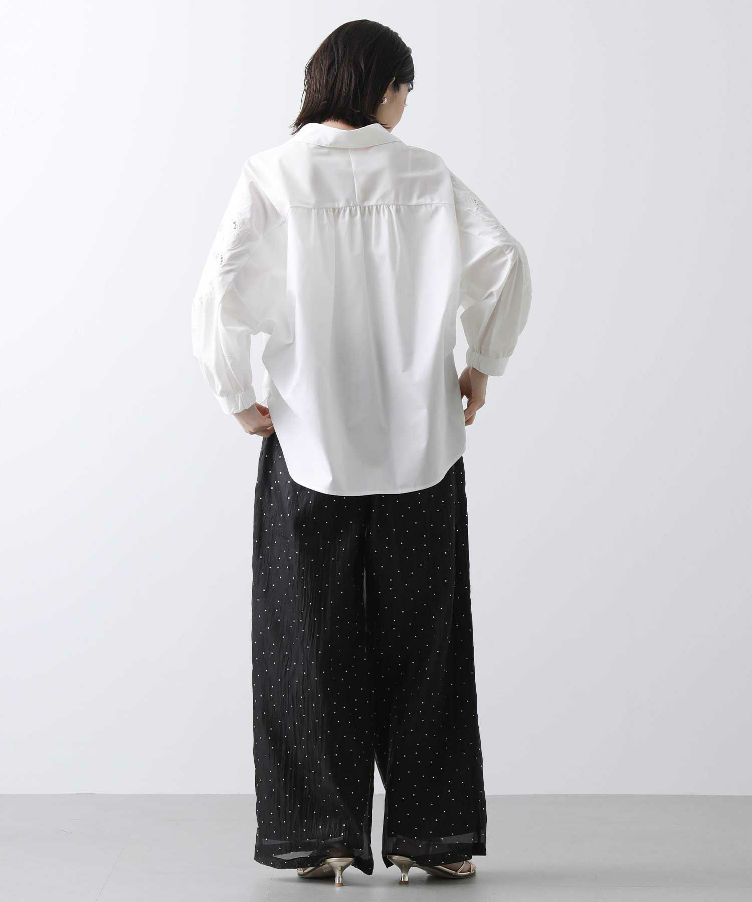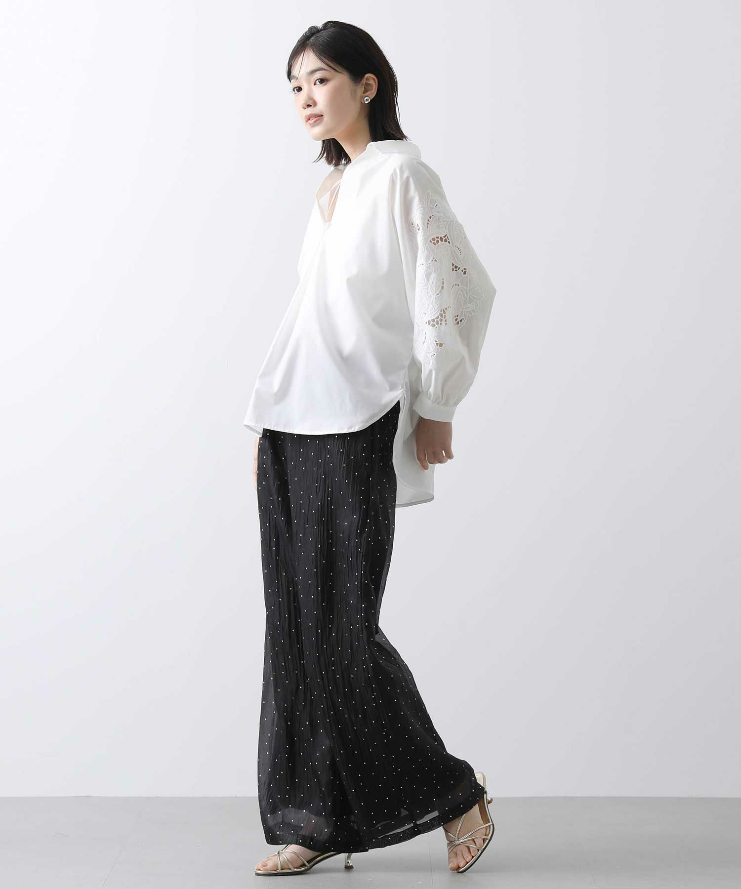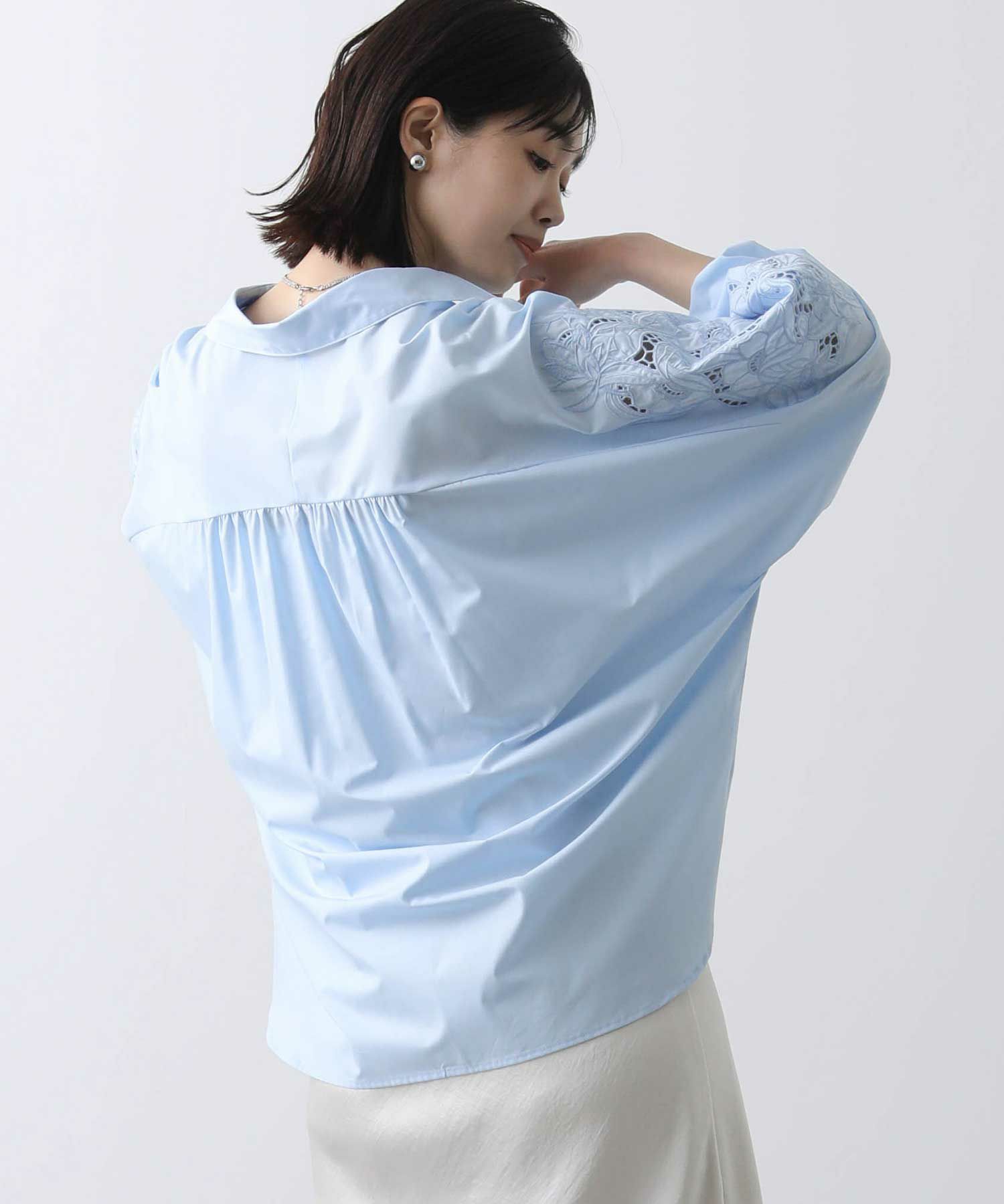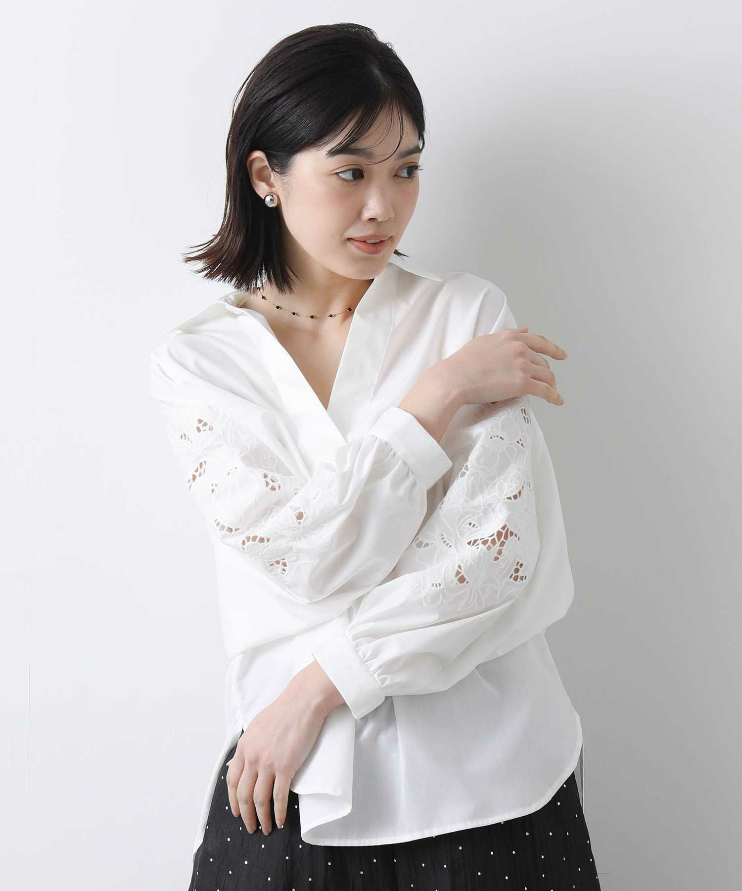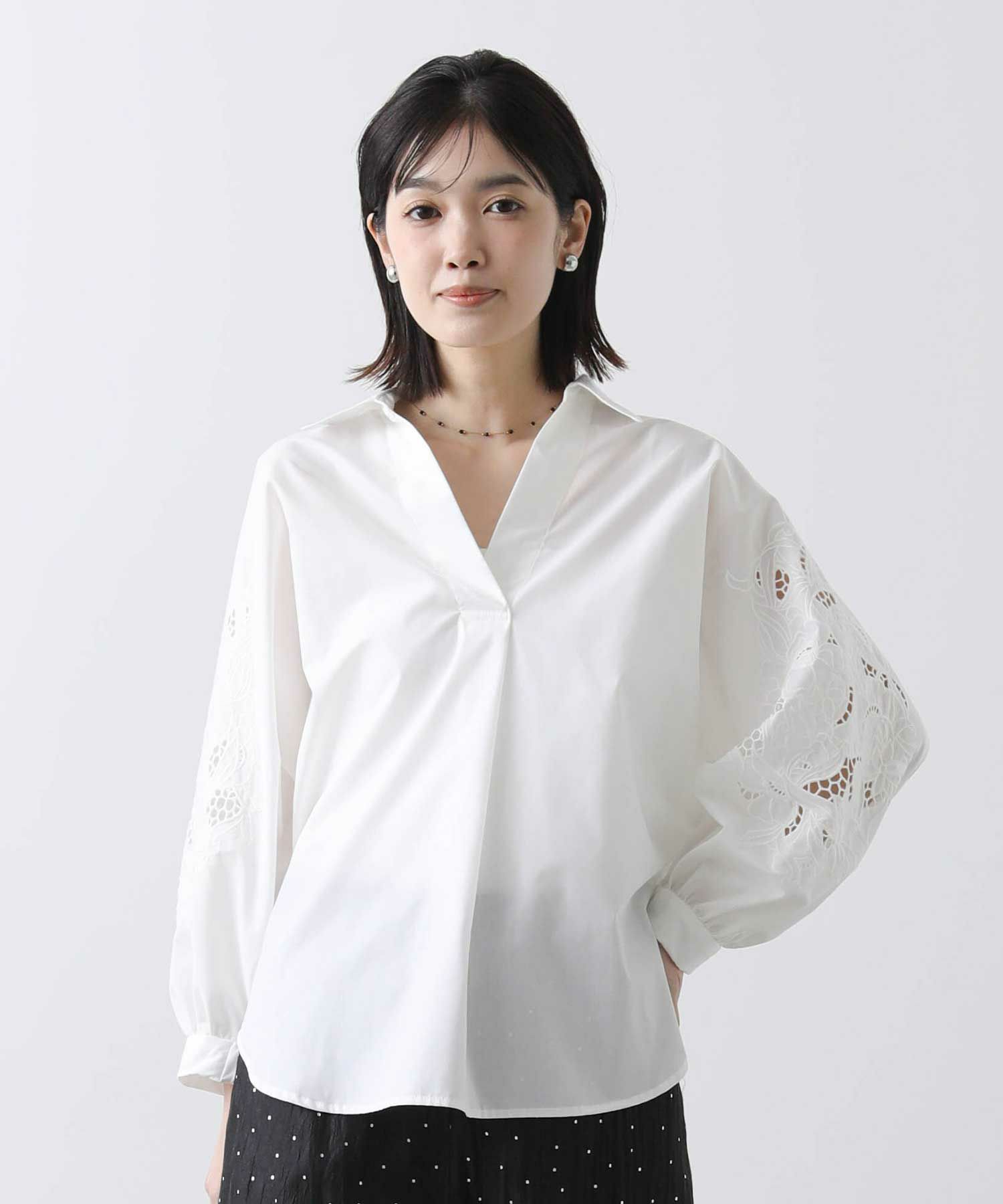 大胆な袖の刺繍が目を惹くエレガントなシャツブラウス。