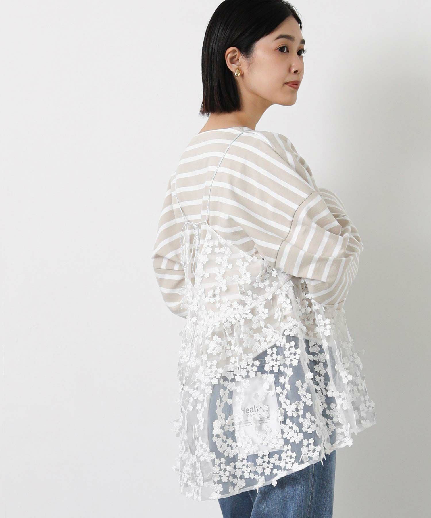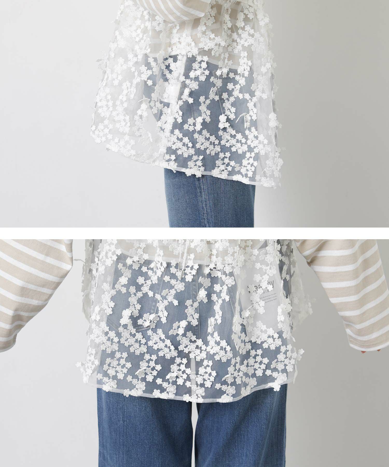 透け感のあるオーガンジー素材に、立体的に刺繍を施した動きのある素材を使用。