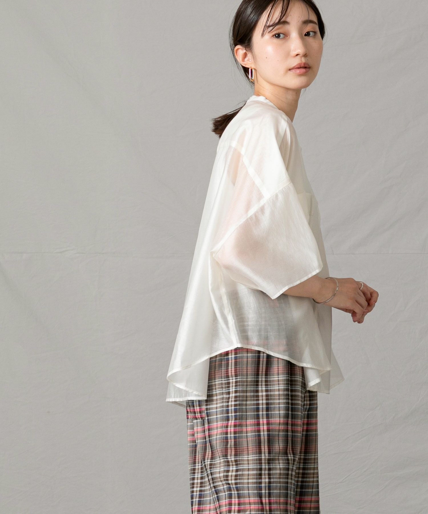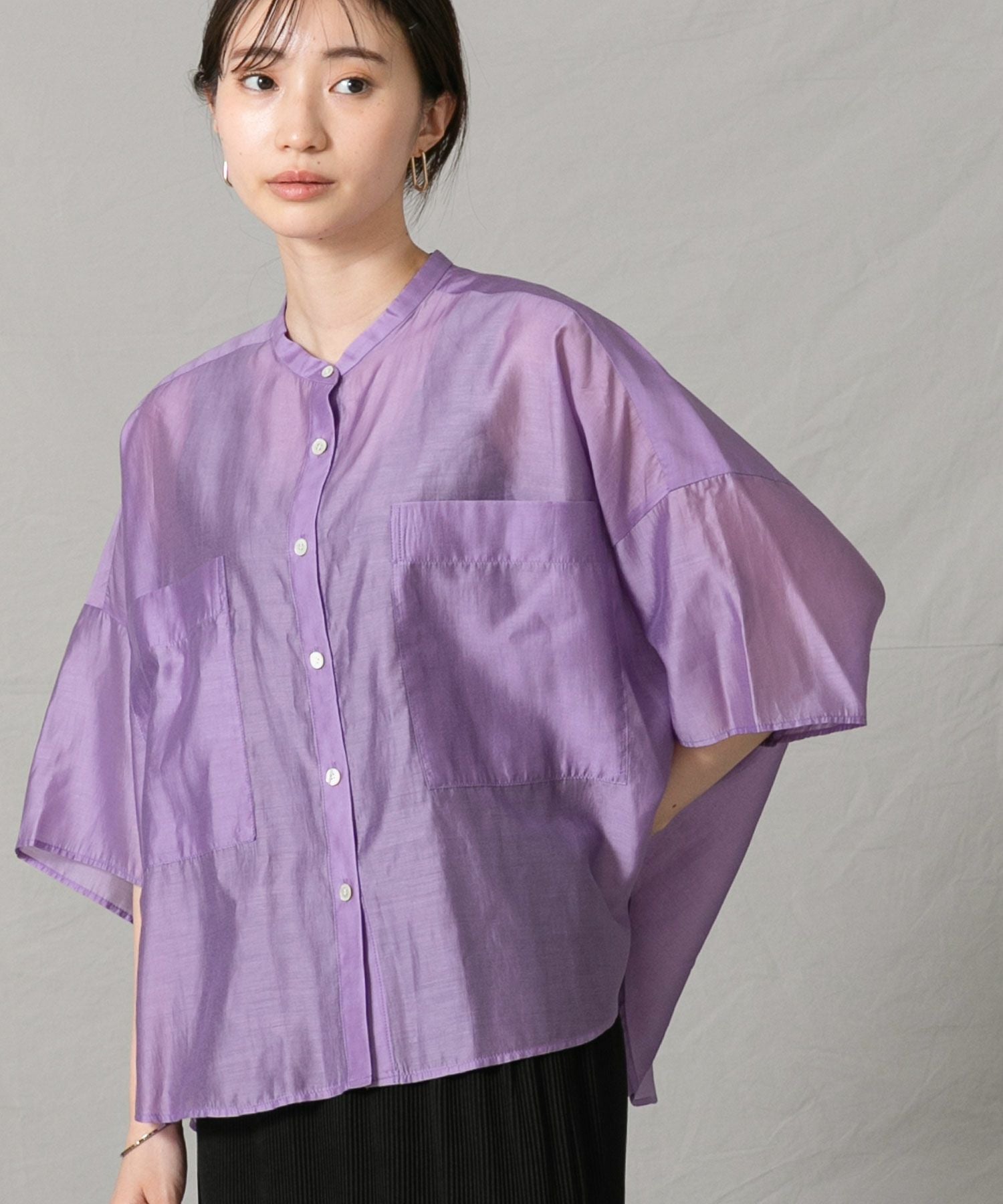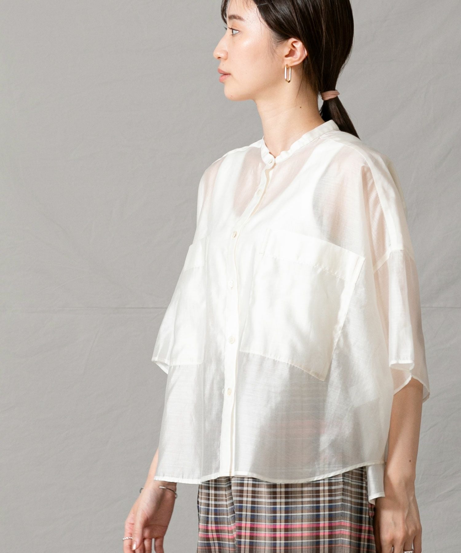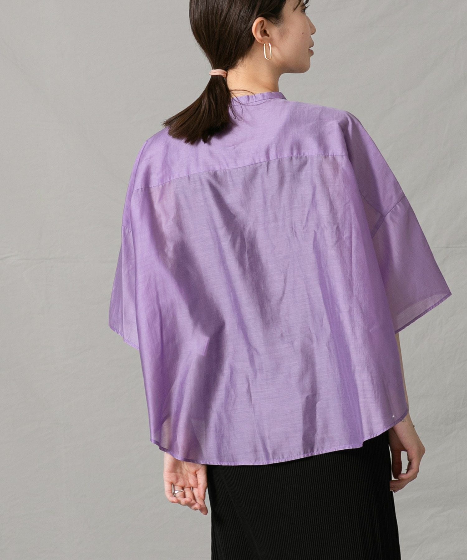 程良いシアー感のある素材と、秋気分を高めてくれるカラーリングがポイントです。身体が泳ぐサイズ感は抜け感が出て涼しく着ていただけます。