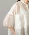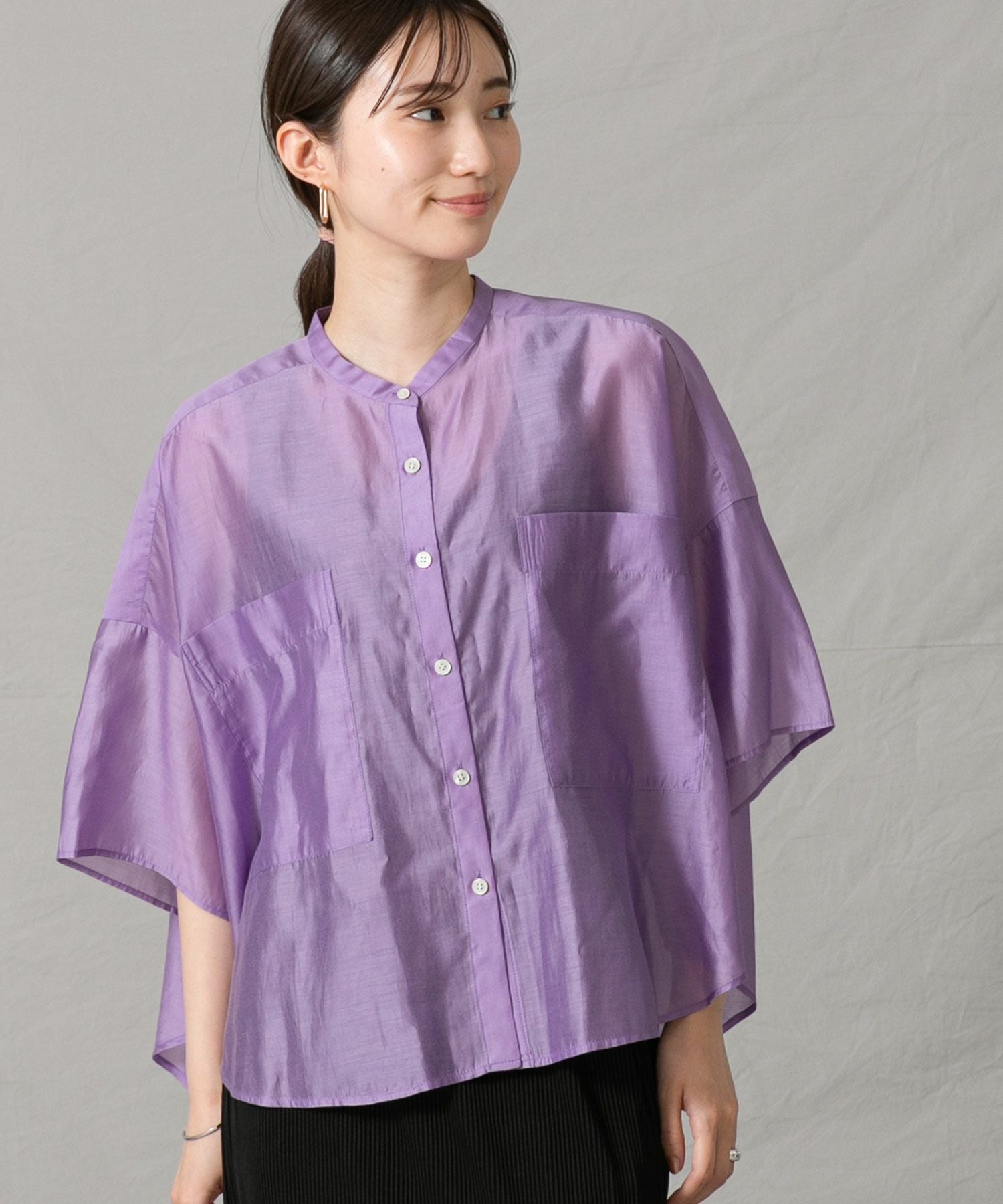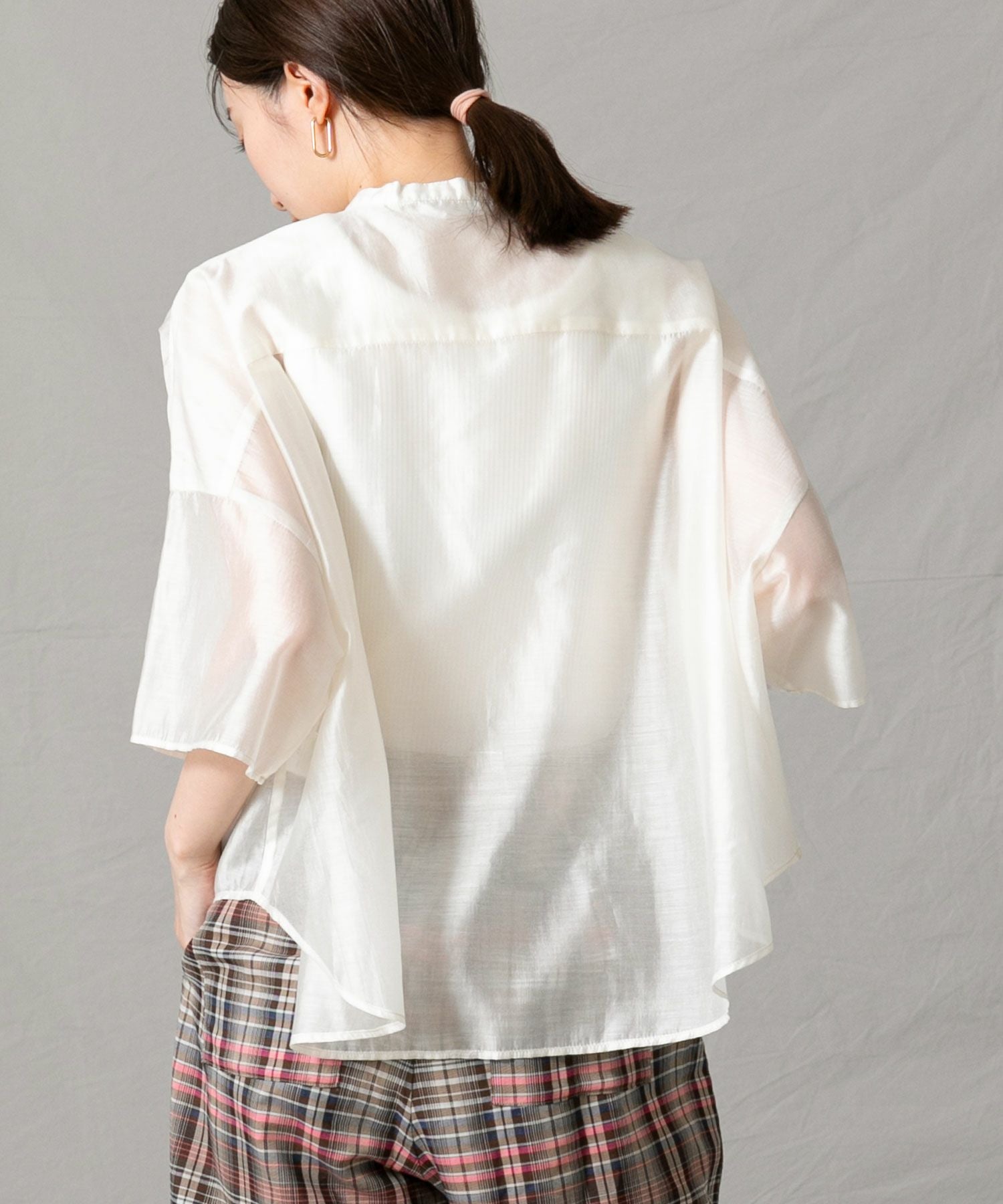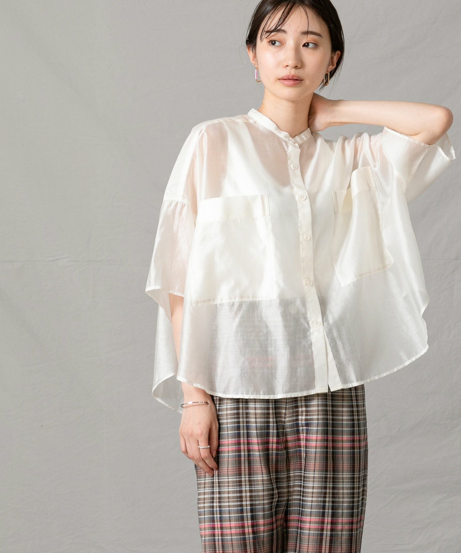 程良いシアー感のある素材と、秋気分を高めてくれるカラーリングがポイントです。身体が泳ぐサイズ感は抜け感が出て涼しく着ていただけます。
