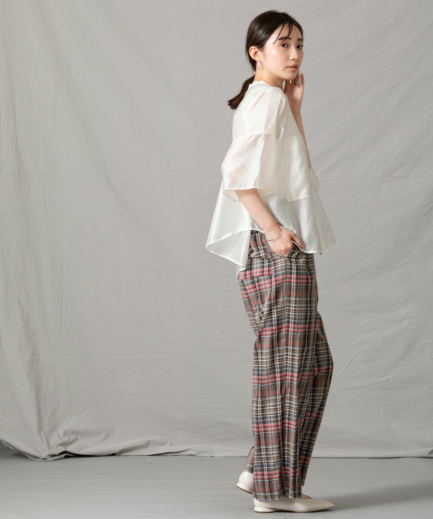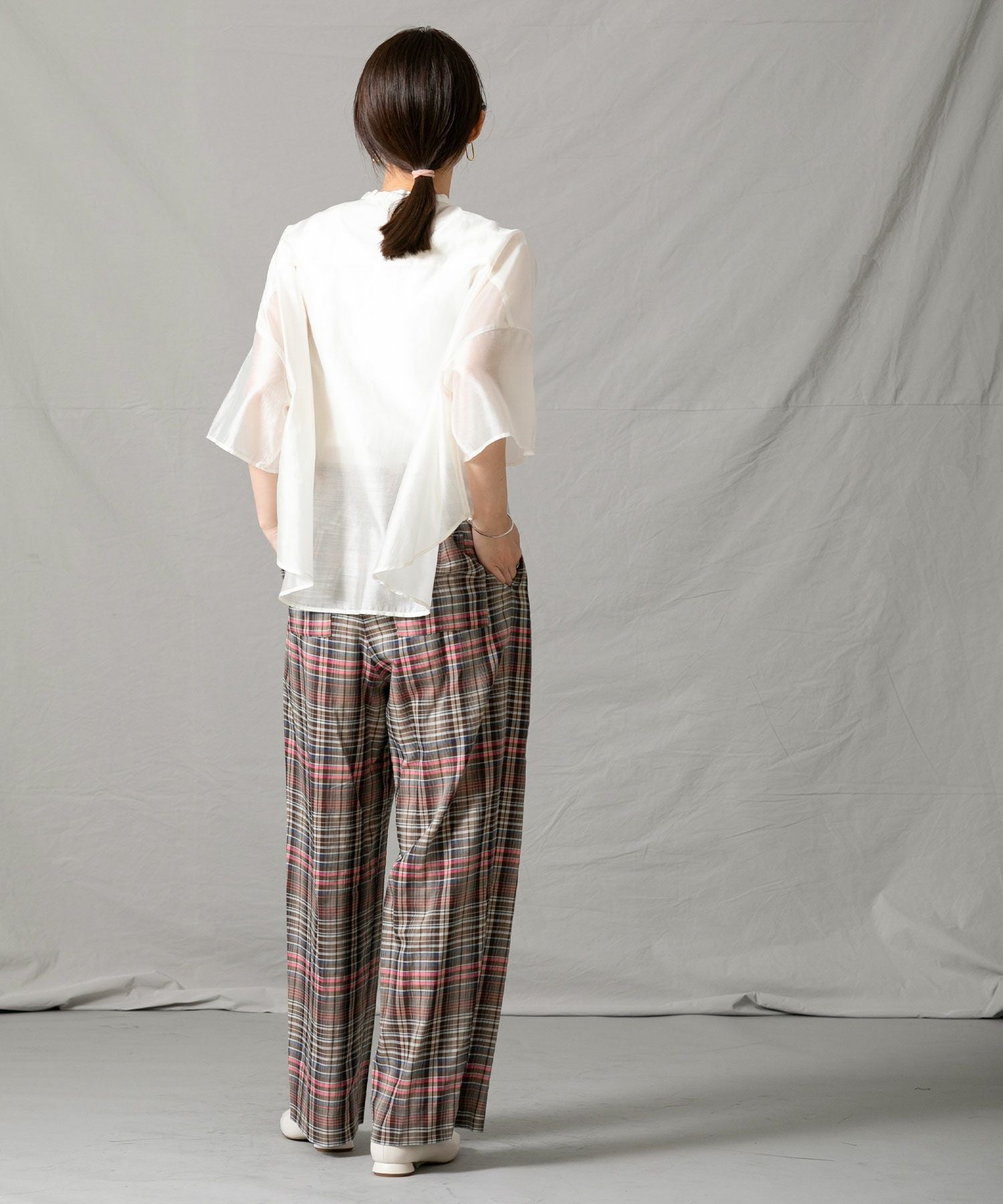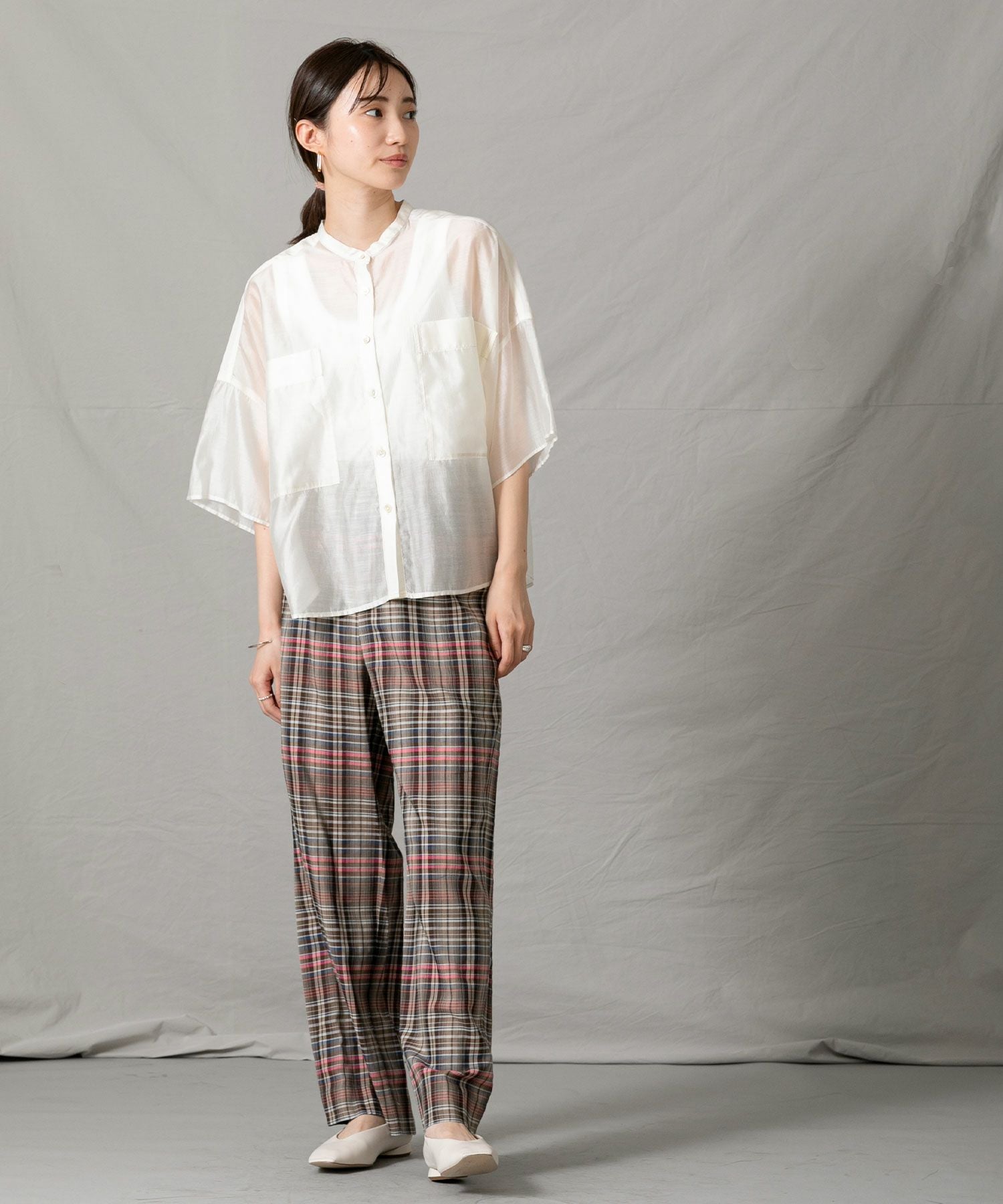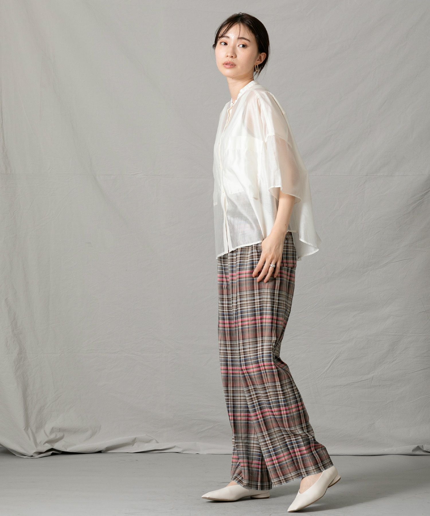 程良いシアー感のある素材と、秋気分を高めてくれるカラーリングがポイントです。身体が泳ぐサイズ感は抜け感が出て涼しく着ていただけます。