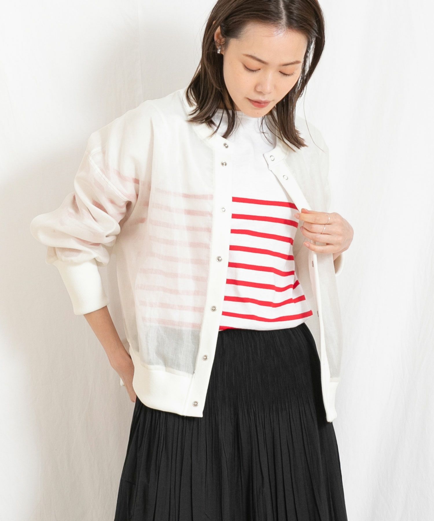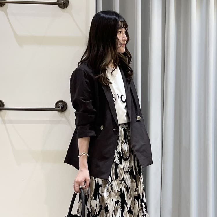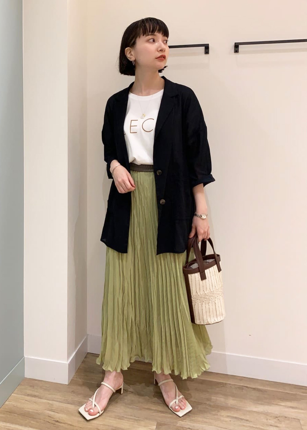 色味が綺麗なプリーツスカートに、軽い着心地のジャケットを合わせて。夏でも涼しい大人カジュアルなジャケットコーデに仕上げました!