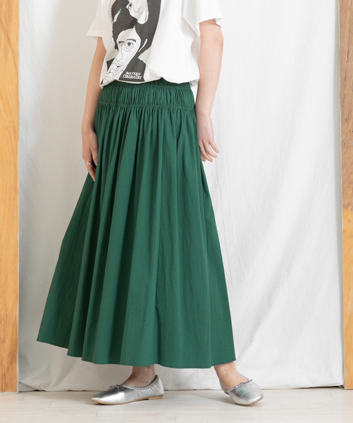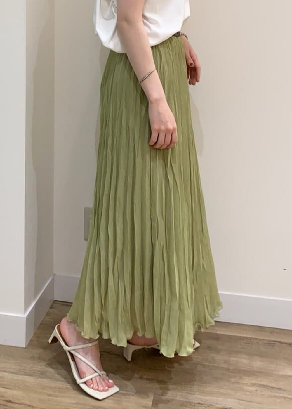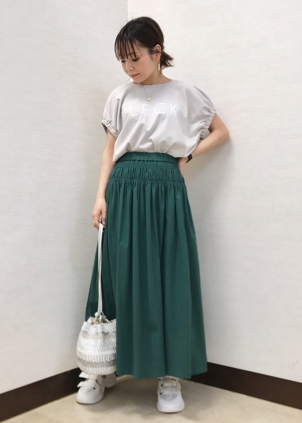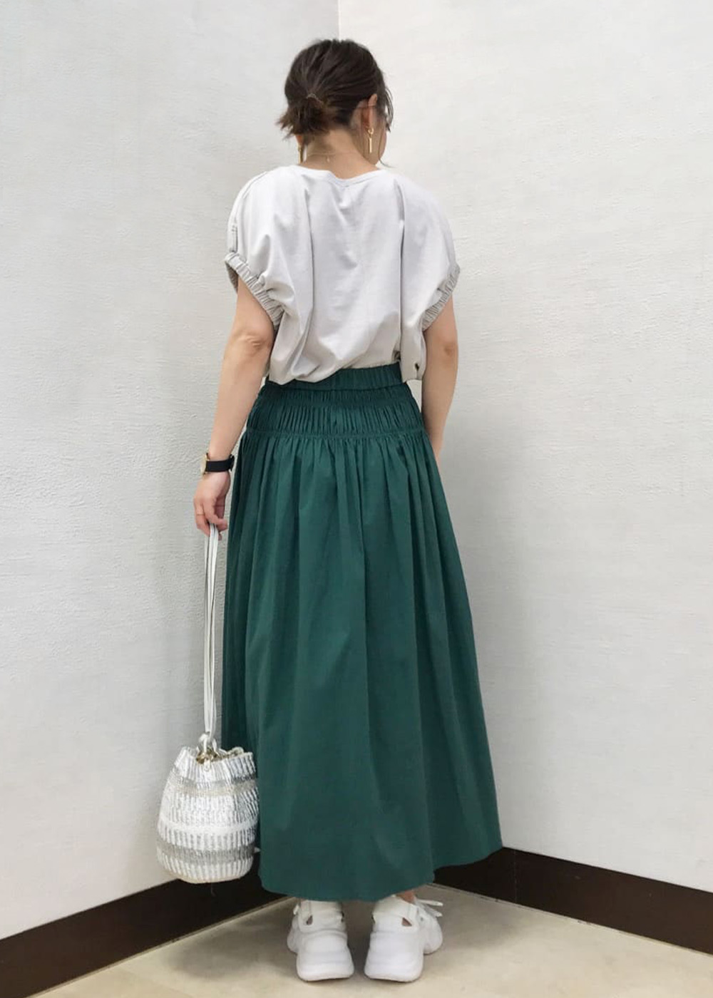 夏らしいフレッシュなグリーンのスカートは、ウエストのシャーリングデザインがポイント。ヒップ回りを押さえてくれるので広がり過ぎないシルエットです。