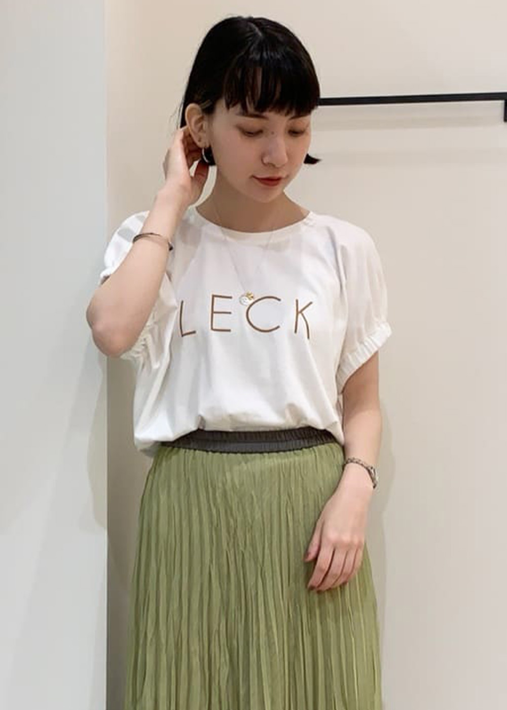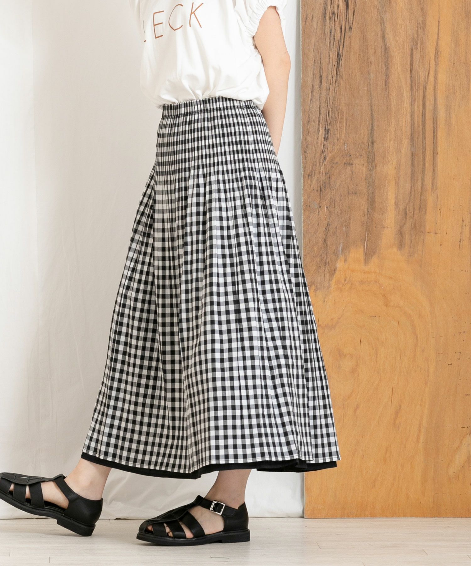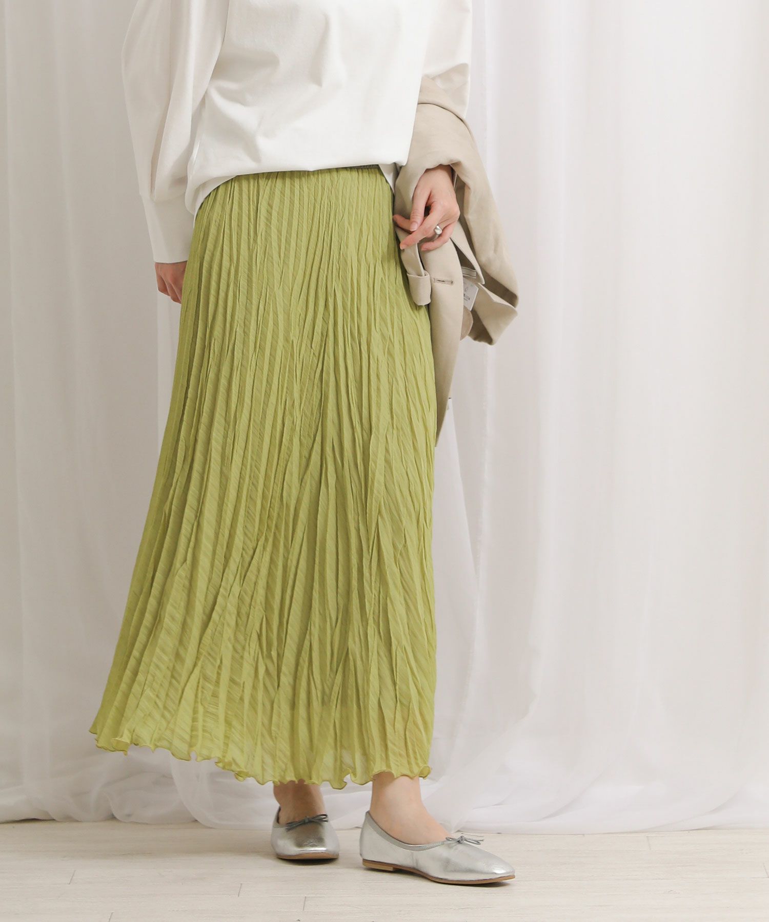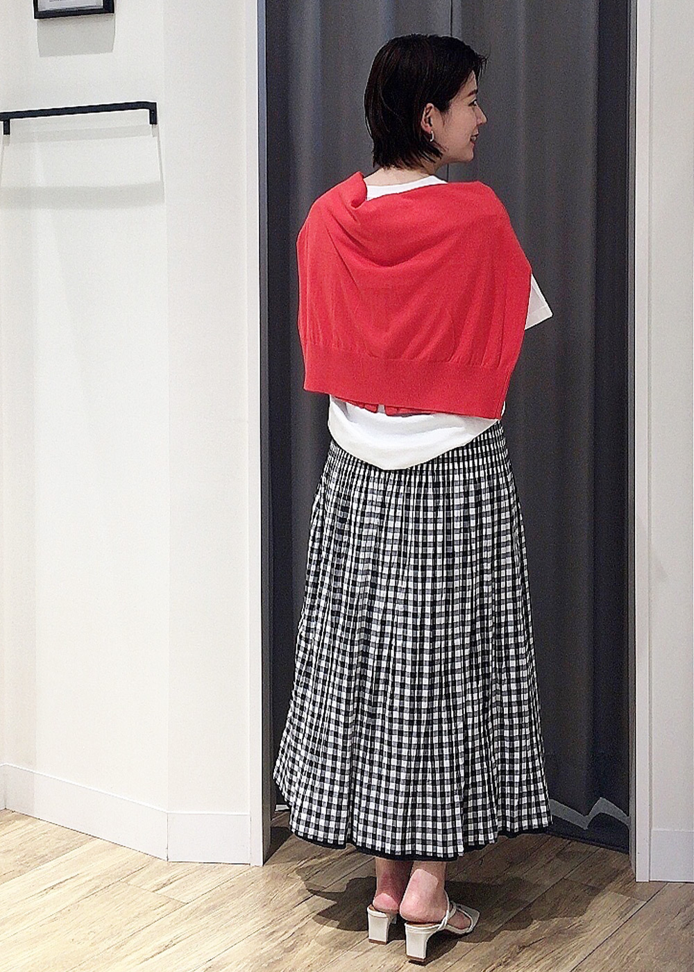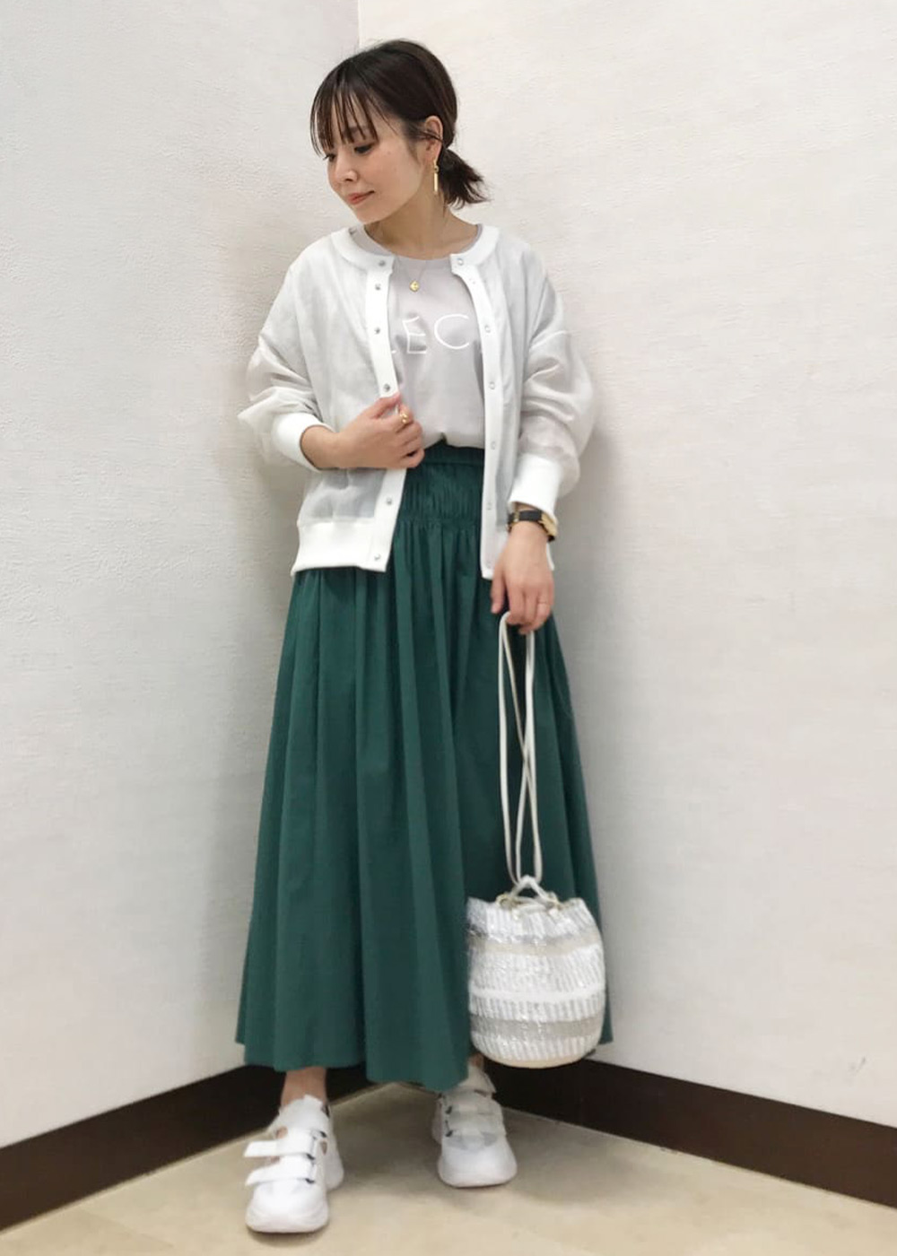 夏らしいフレッシュなグリーンのスカートは、ウエストのシャーリングデザインがポイント。ヒップ回りを押さえてくれるので広がり過ぎないシルエットです。