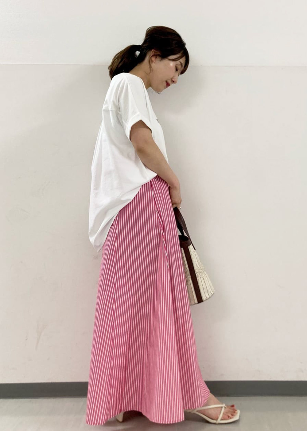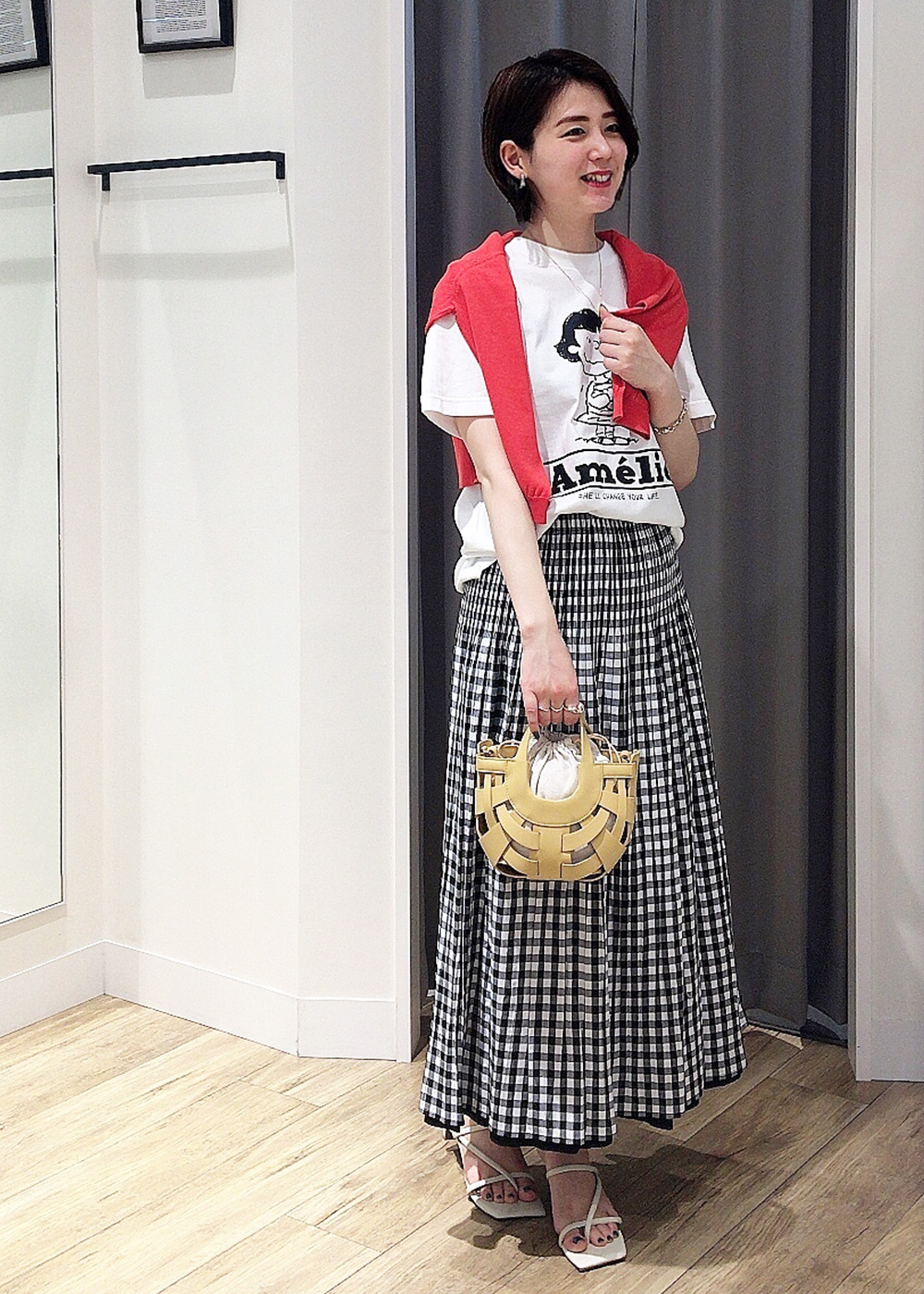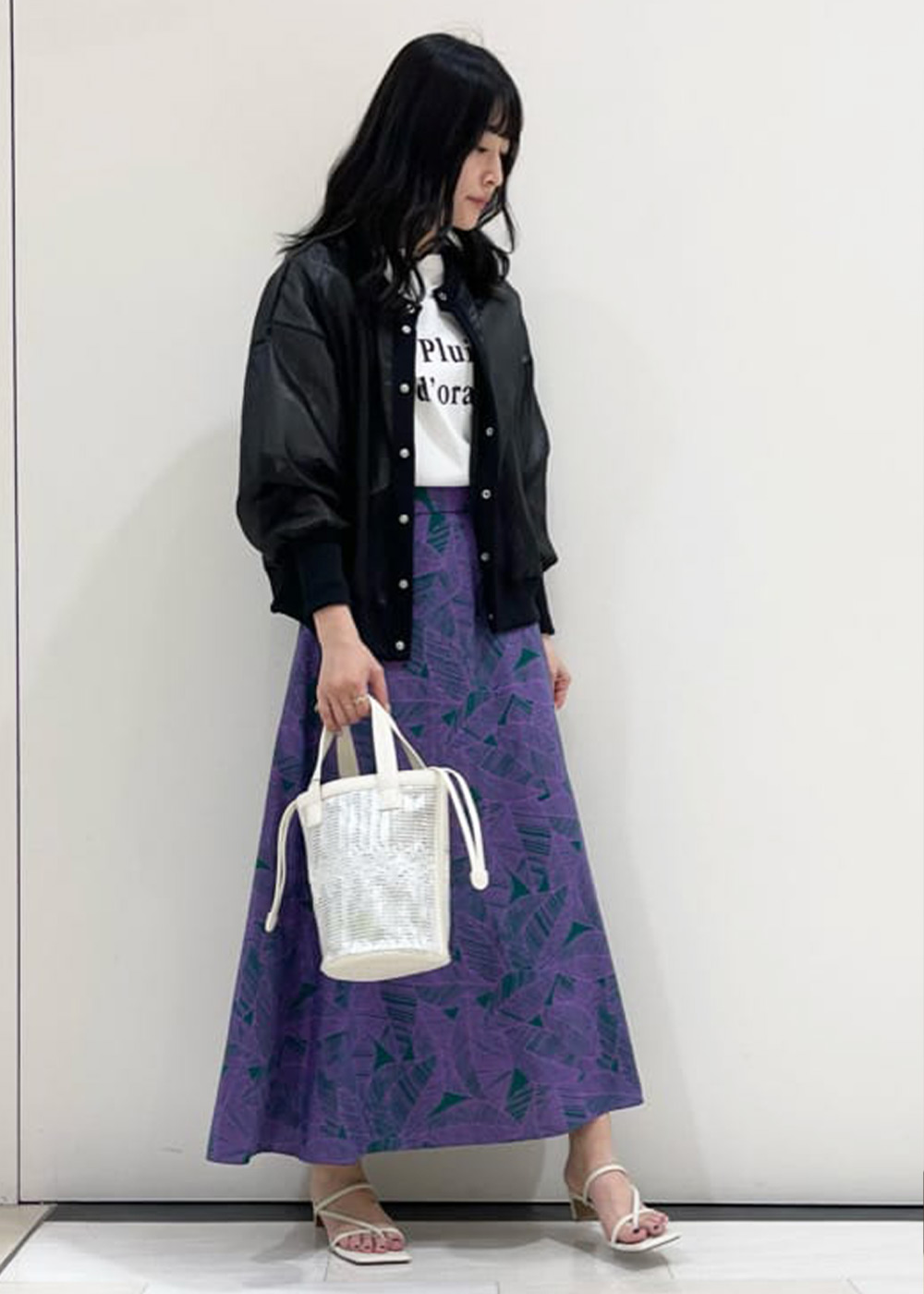 ベーシックカラーでまとめて柄スカートをコーデのアクセントに。スカートは落ち着いたカラーで、トップスがシンプルでもお洒落見え!これからの夏にぴったりです!