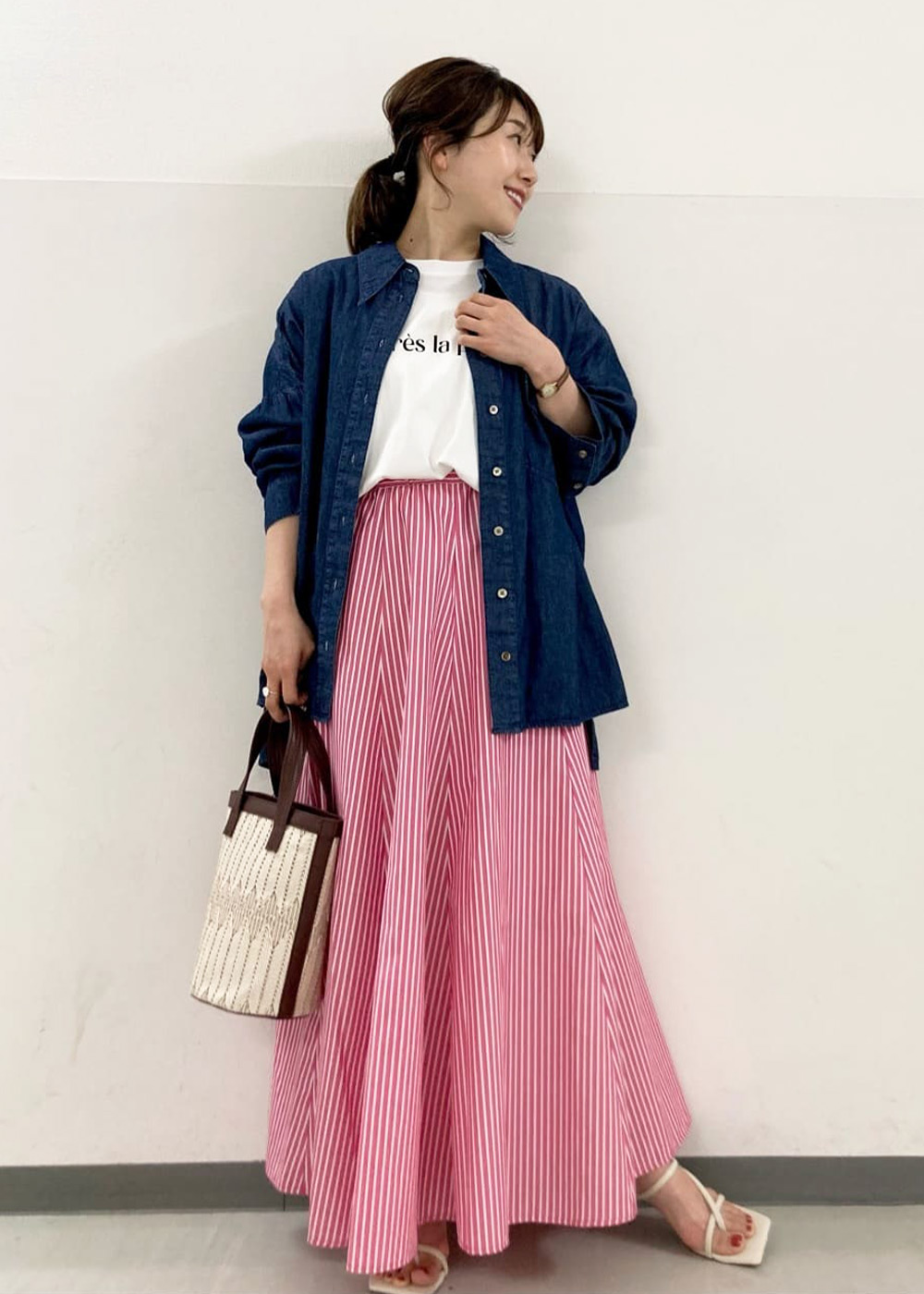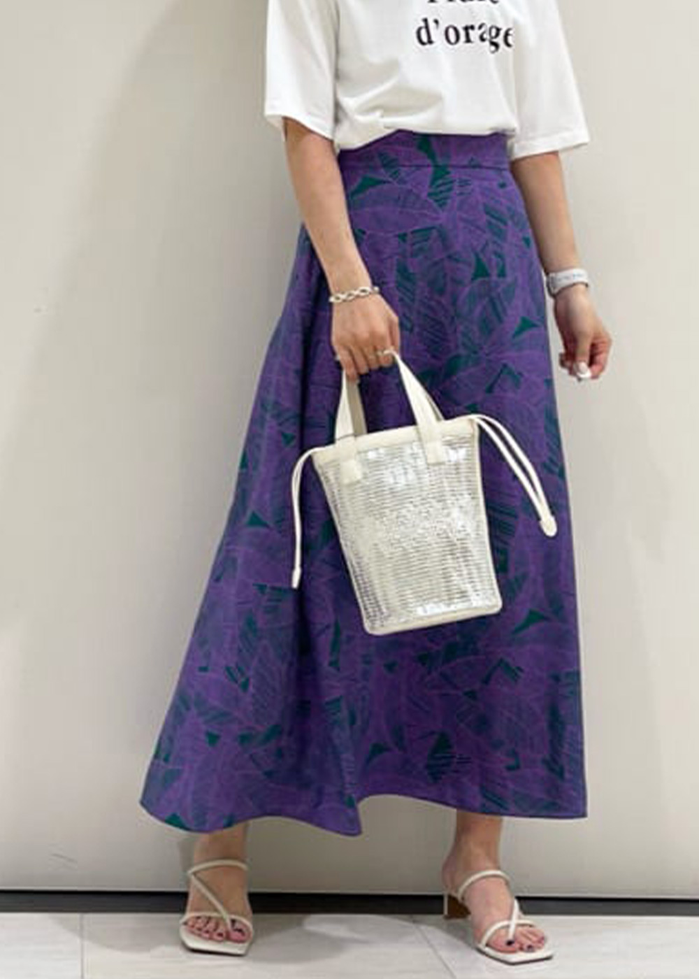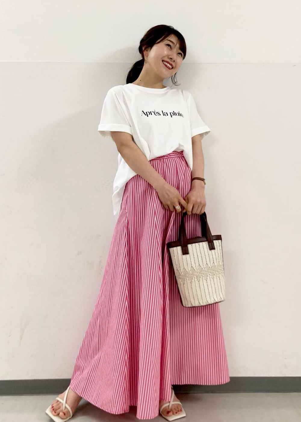 ベーシックカラーでまとめて柄スカートをコーデのアクセントに。スカートは落ち着いたカラーで、トップスがシンプルでもお洒落見え!これからの夏にぴったりです!