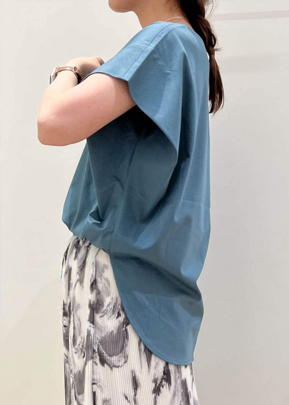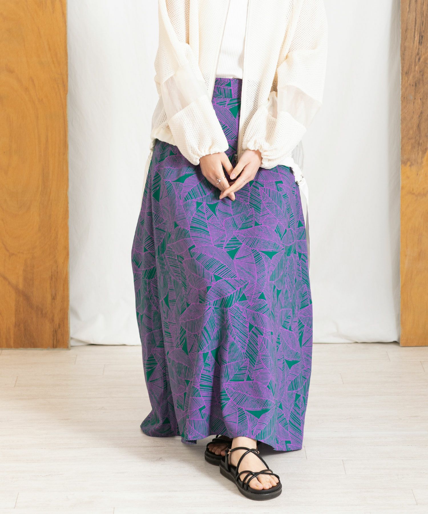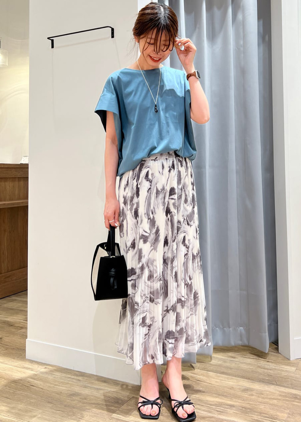 水彩画のような爽やかな柄スカートに、キレイ色カットソーを合わせました。脇部分は見えないようになっているので、手を上げた時の安心感も◎