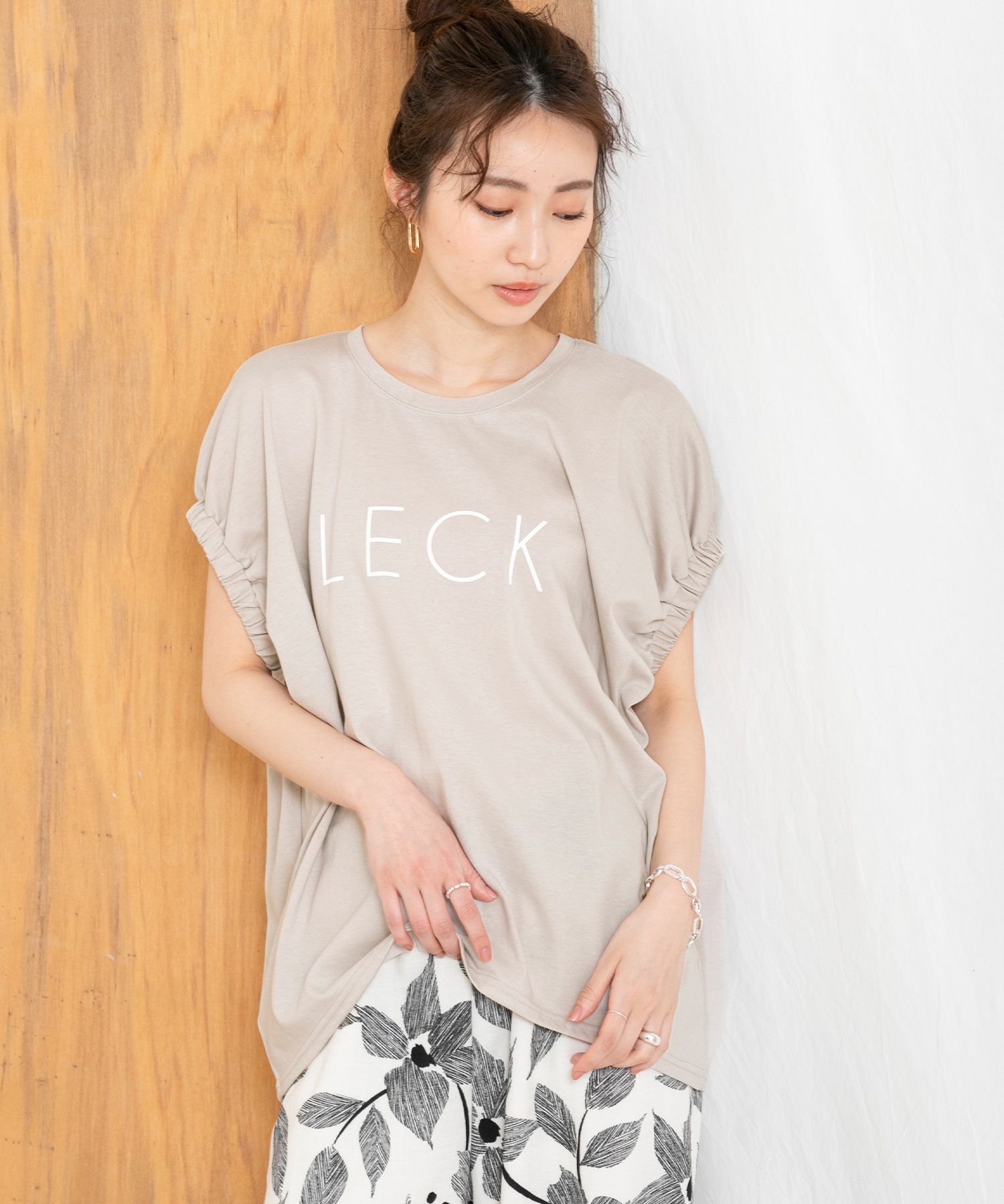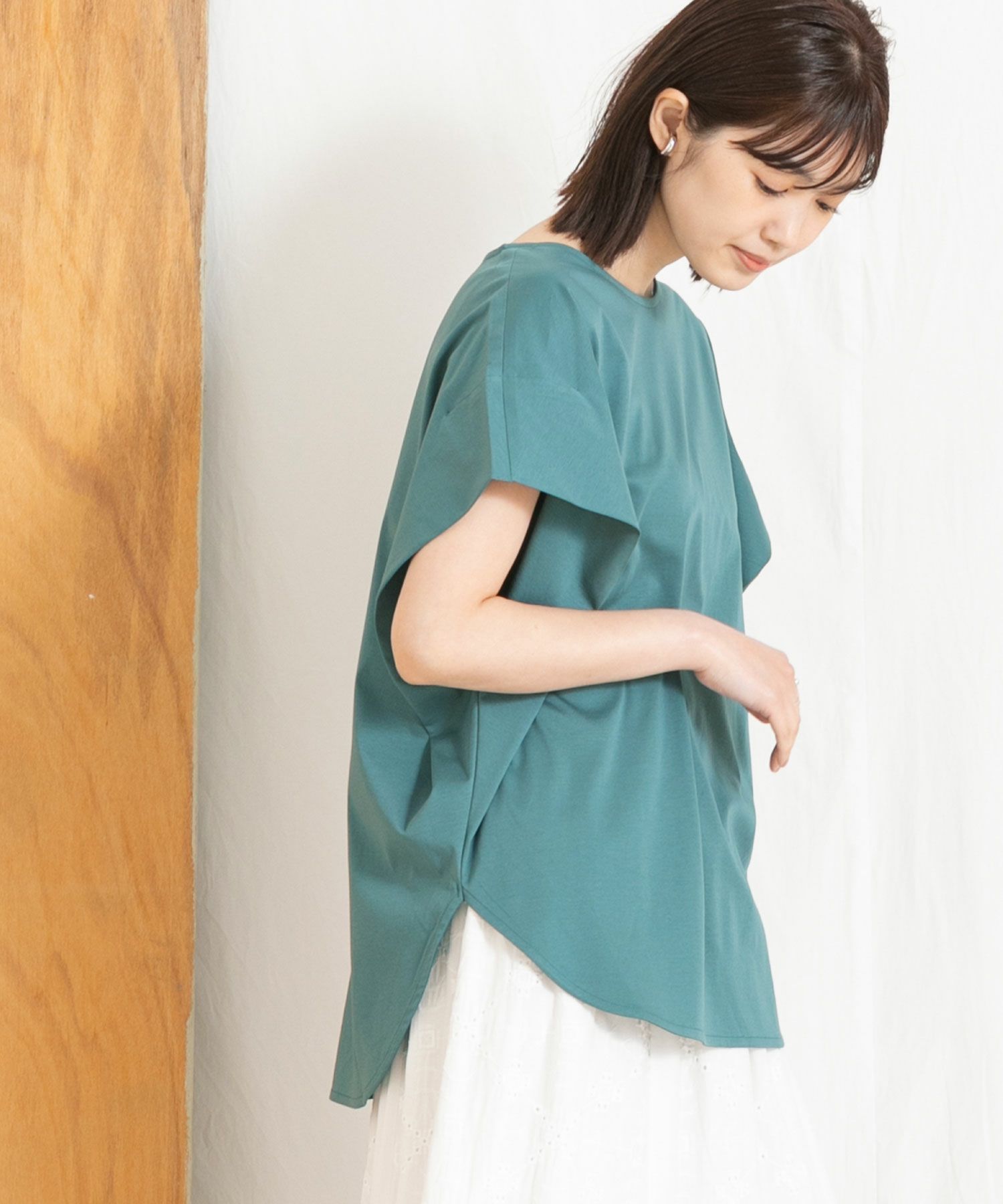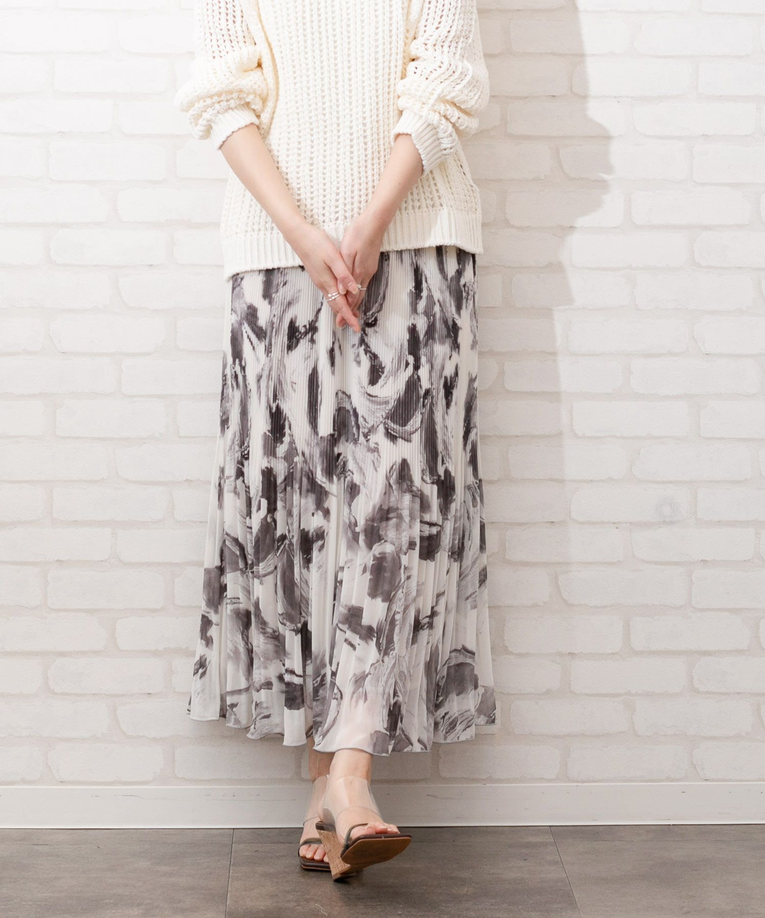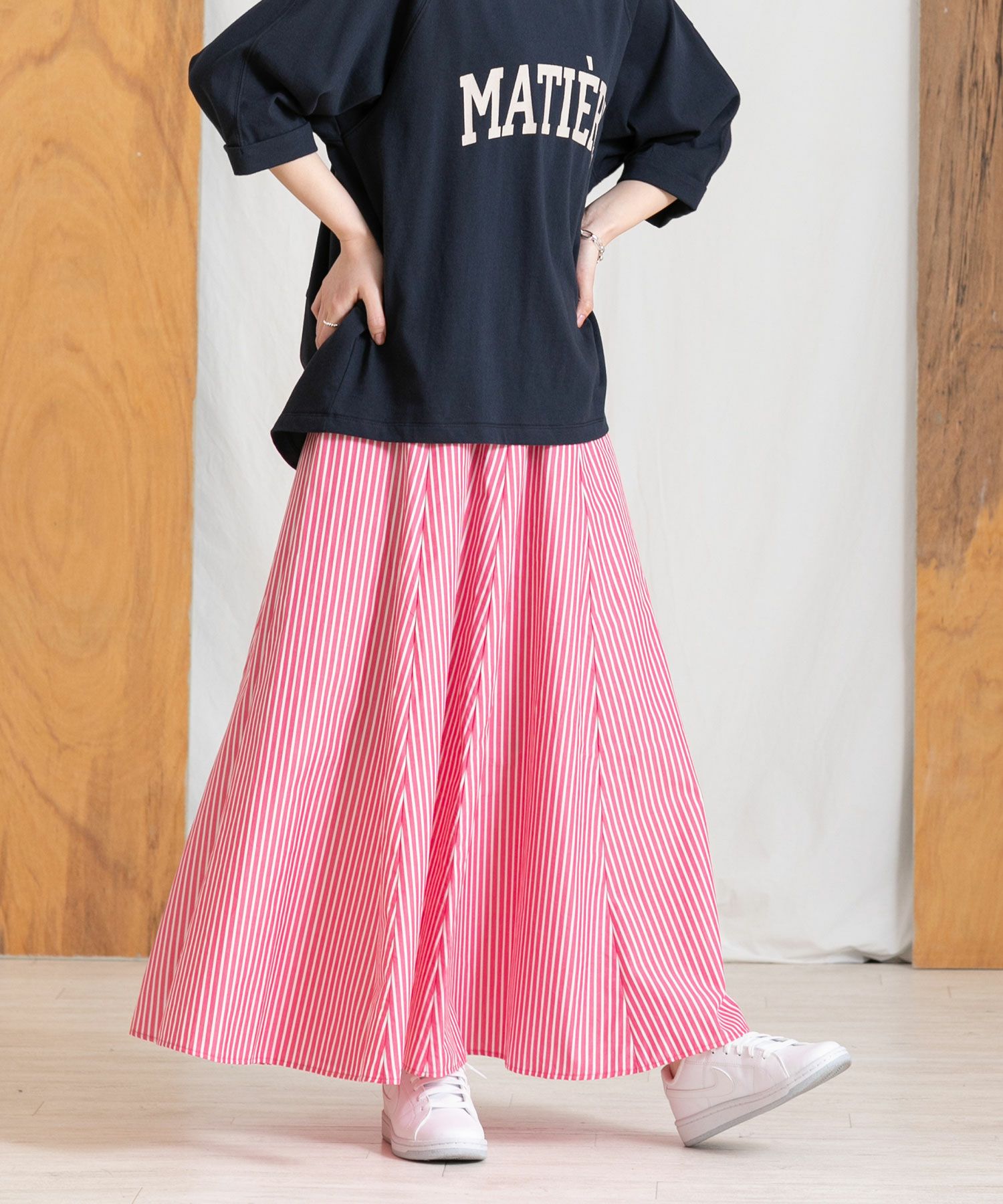 水彩画のような爽やかな柄スカートに、キレイ色カットソーを合わせました。脇部分は見えないようになっているので、手を上げた時の安心感も◎