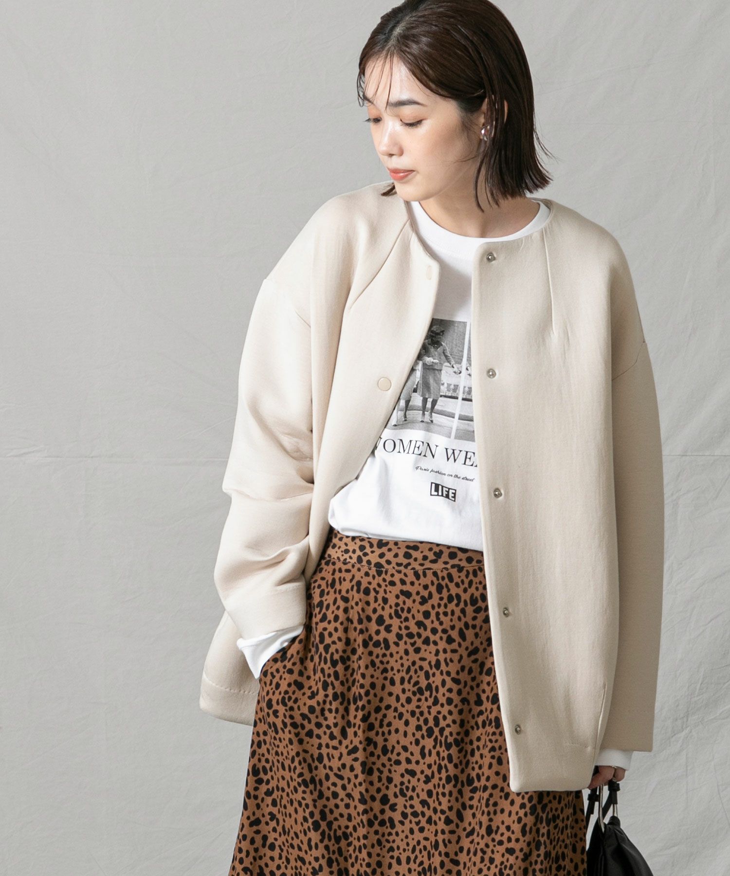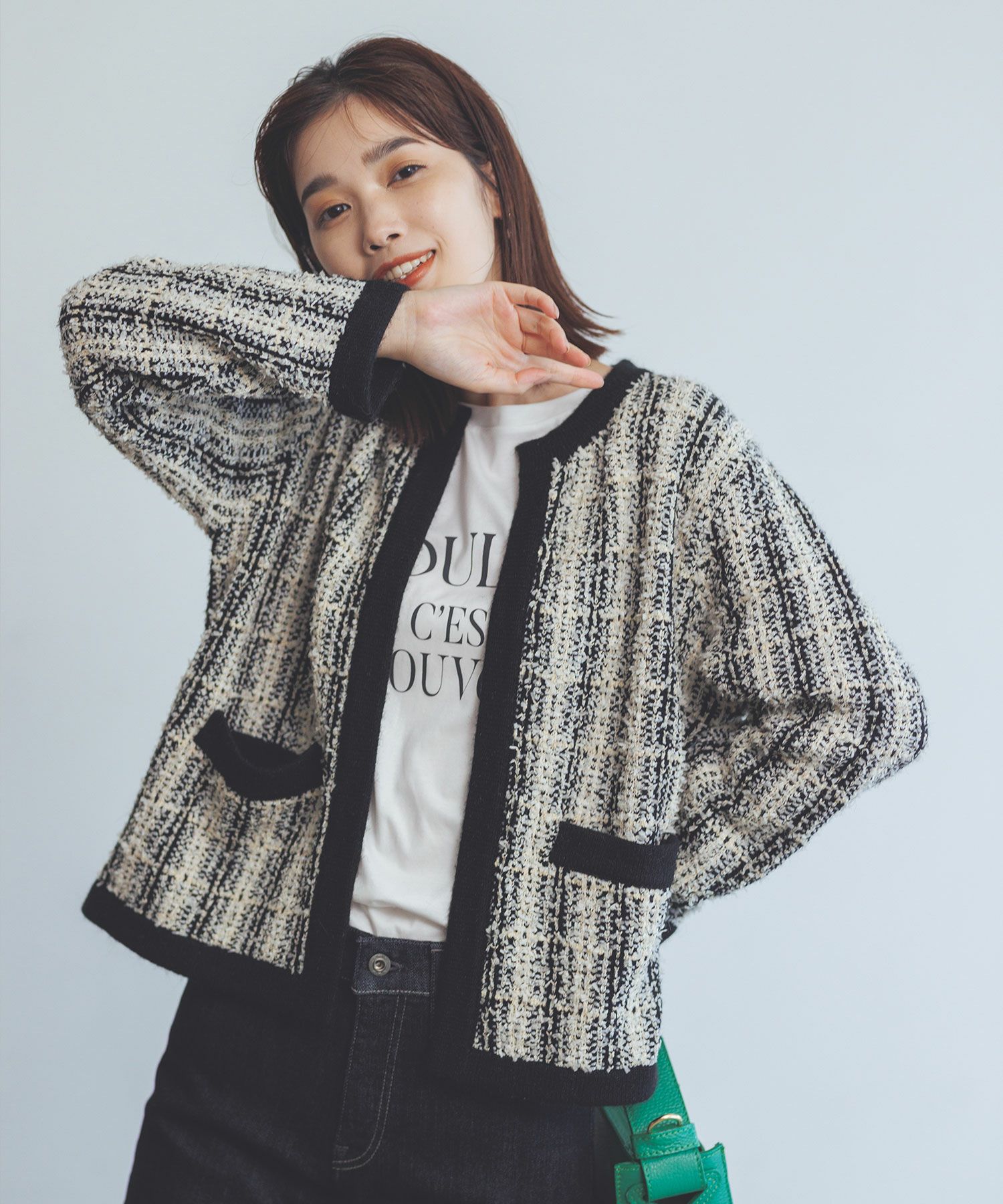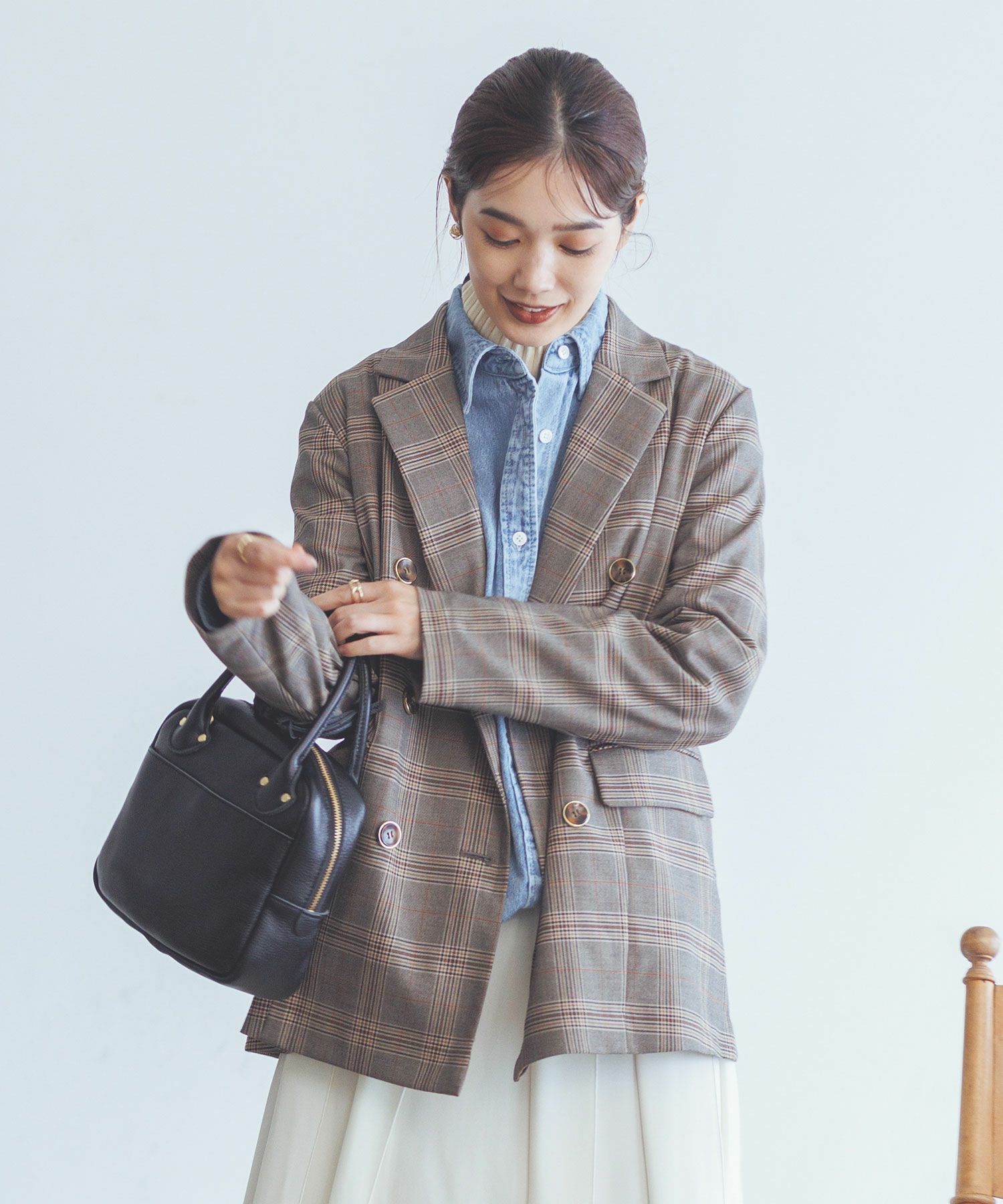 秋のクラシカルなムードにピッタリなジャケット。かっちりしたテーラードジャケットをフェミニンに着こなして。