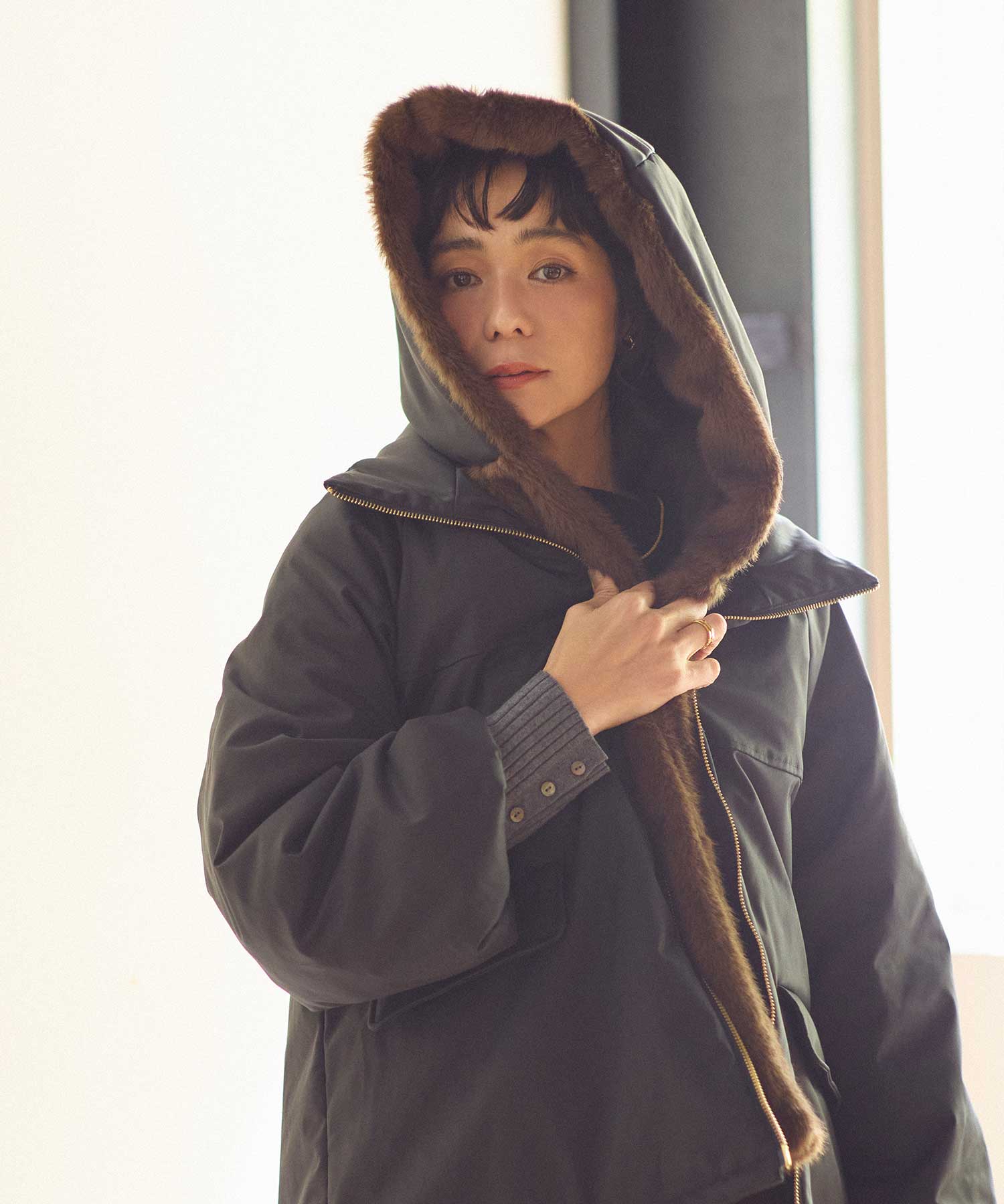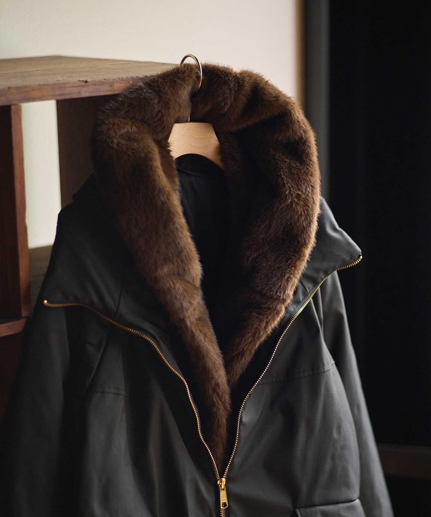 顔まわりのファーが上品&華やかな印象のアウター。ファーは取り外しが可能なので、1枚もっていると重宝すること間違いなし。ファーを外すと、シンプルなスタンドネックデザインの中綿コートとして着用頂けます。
