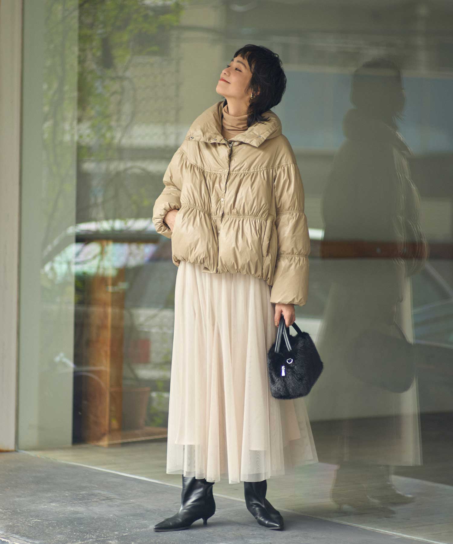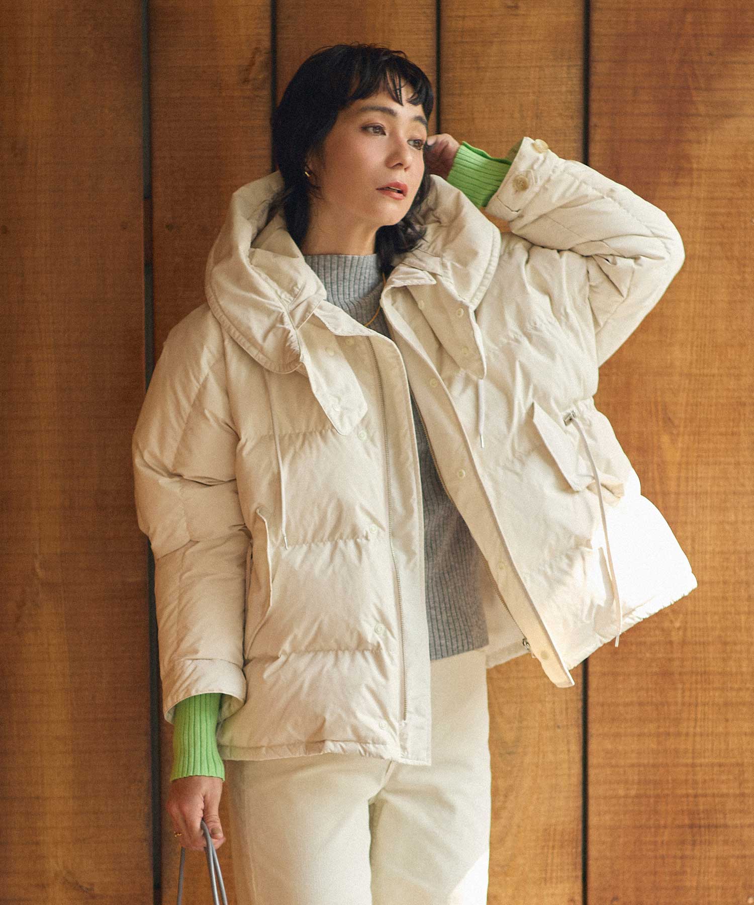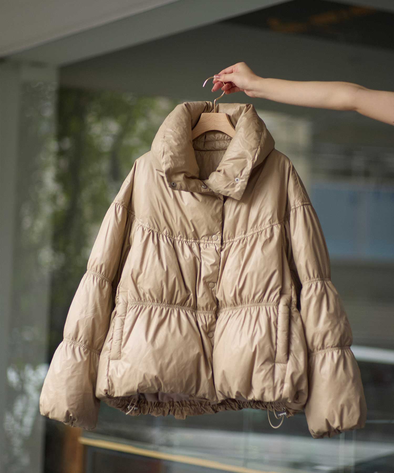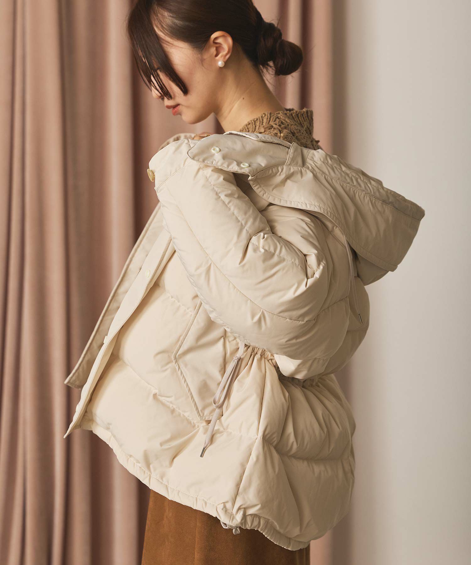 シャーリングステッチを入れることで、ふんわりとしたボリューム感を出した、フェミニンなデザイン。ダウンの分量を細かく調整し、着ぶくれしないシルエットにこだわりました。圧倒的な軽さと保温性を備えた、グレディらしいフェミニンなアウターです。