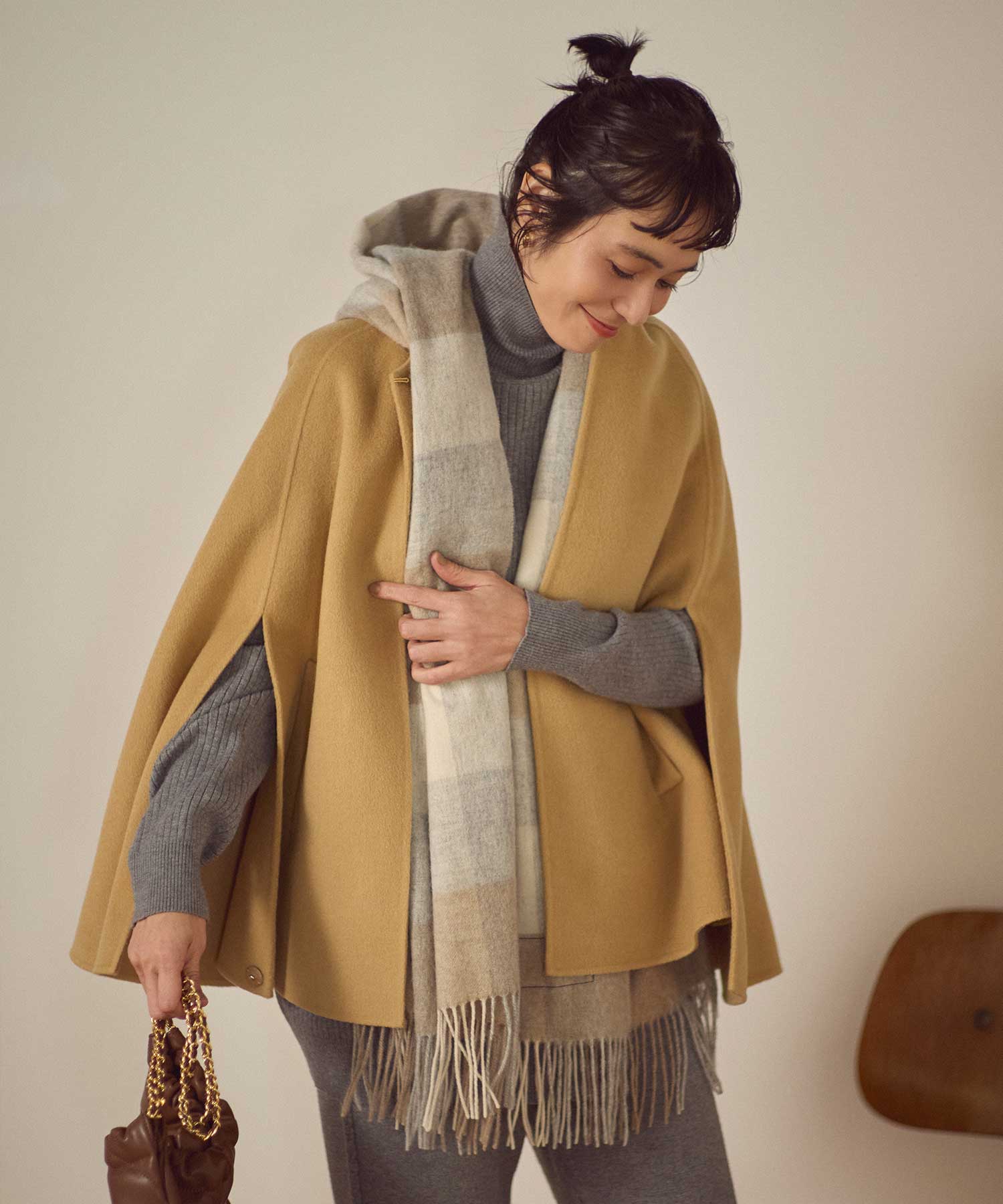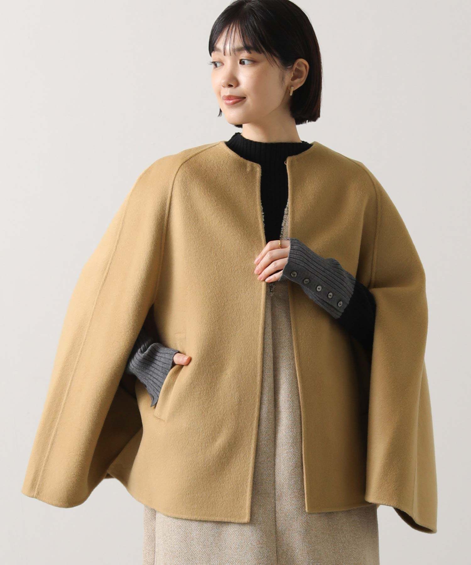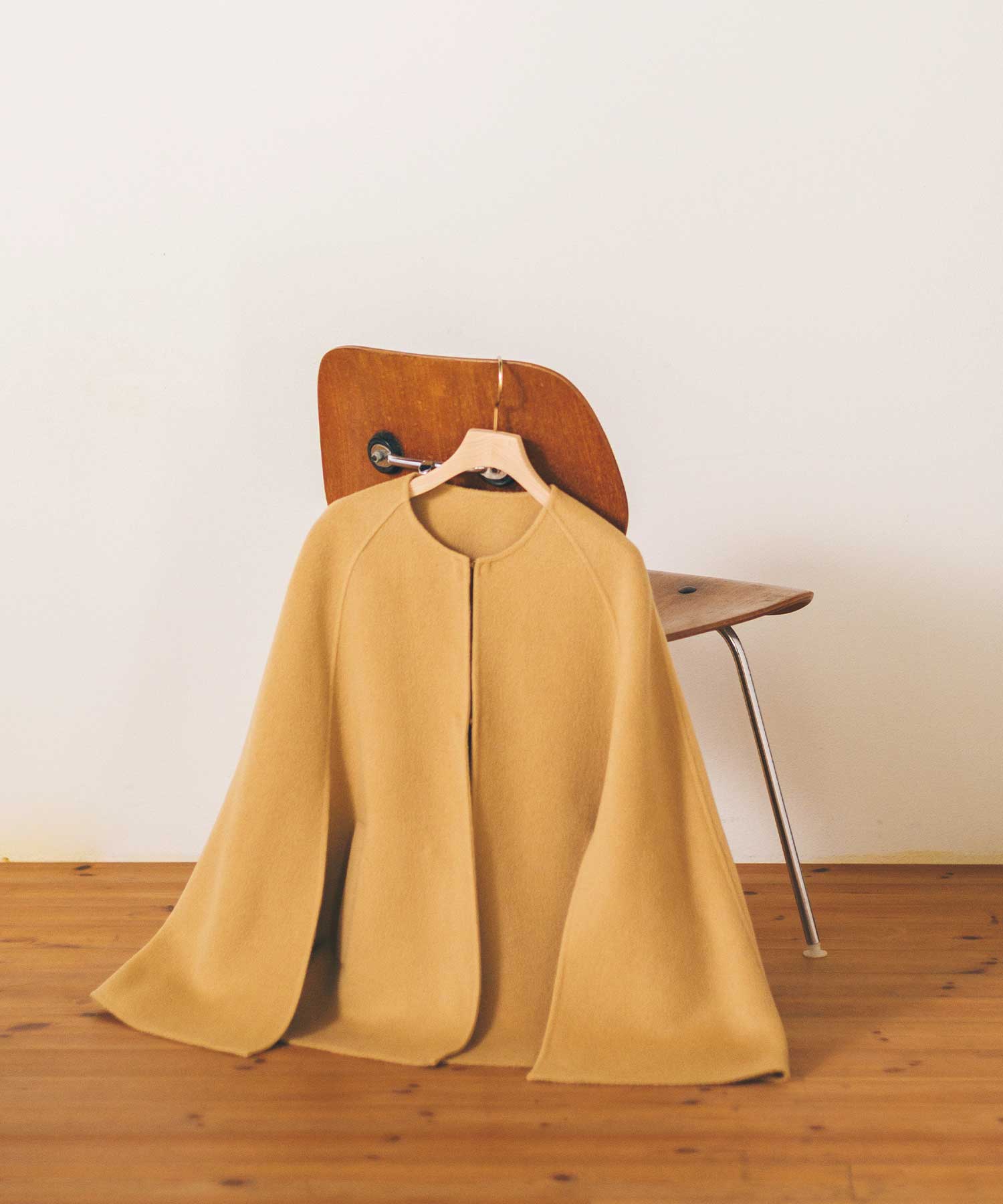 リバー仕立ての、軽くて滑らかなタッチのウール素材を使用したケープ型コート。裏地が無いため、軽量で柔らかく、着心地が良いのが特長です。生地が2枚重なっているため軽やかながらも保温性が高く、暖かく着用いただけます。