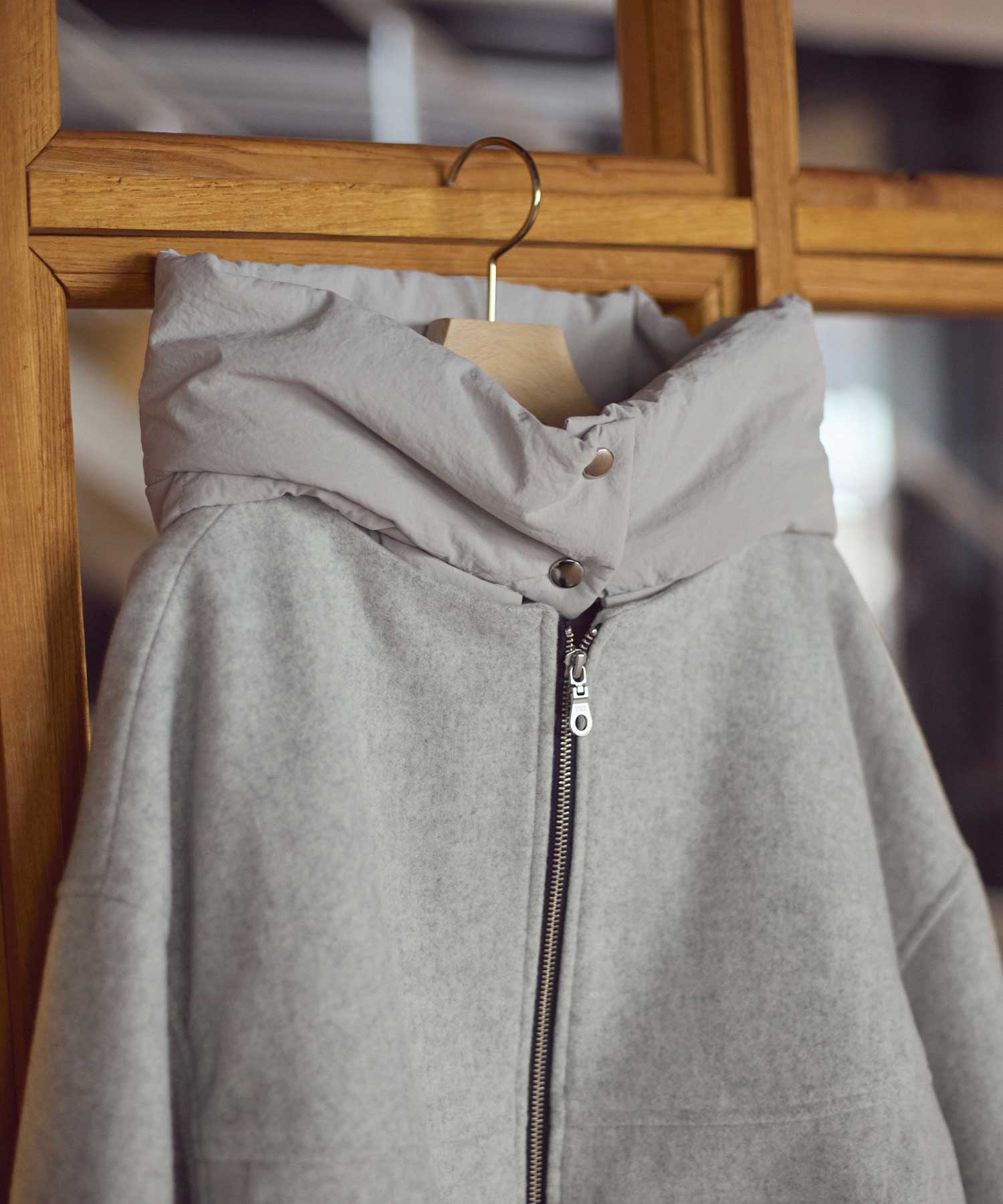 抜け感のあるフォルムがかわいいショートウールコート。ナイロンフードとのドッキングデザインで、程よくカジュアル感のあるデイリーユースしやすい一着です。表地はラムウールブレンドのウール100%の生地を使用して、軽量ながら暖かさも抜群です。