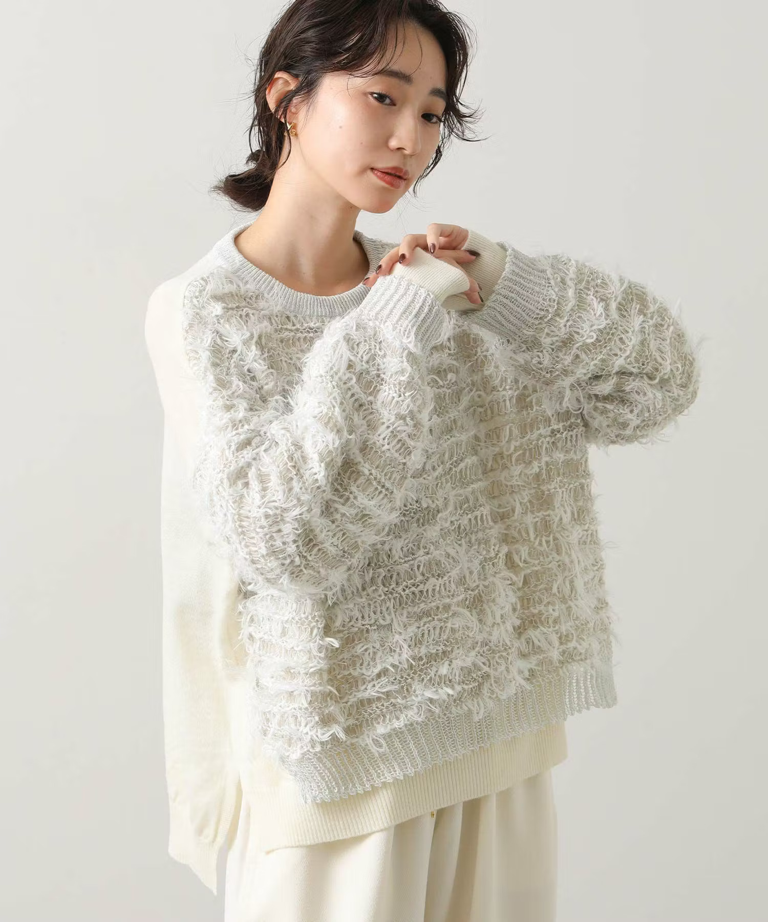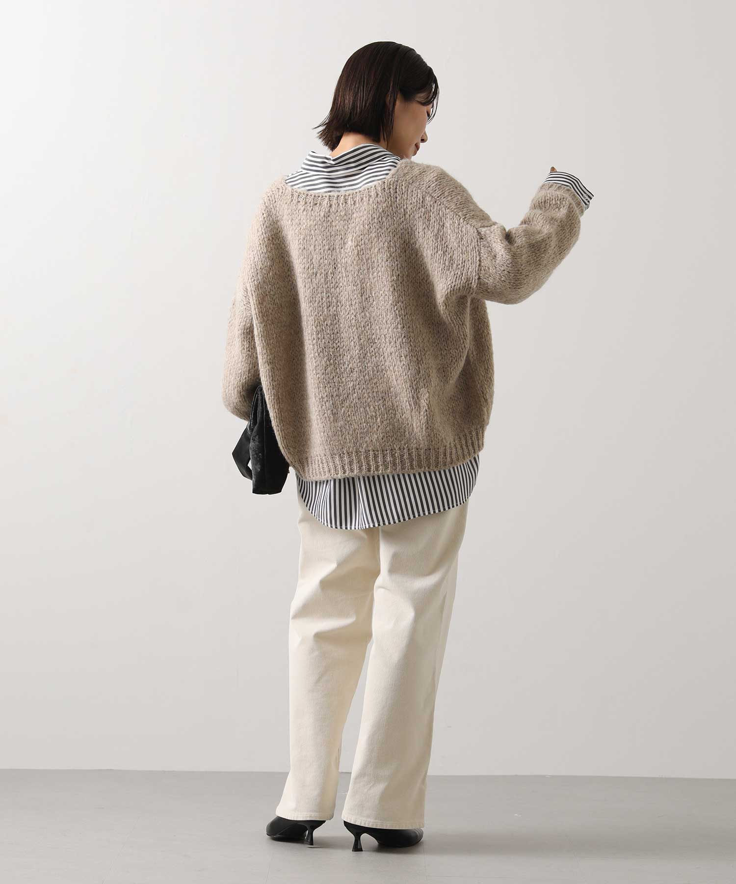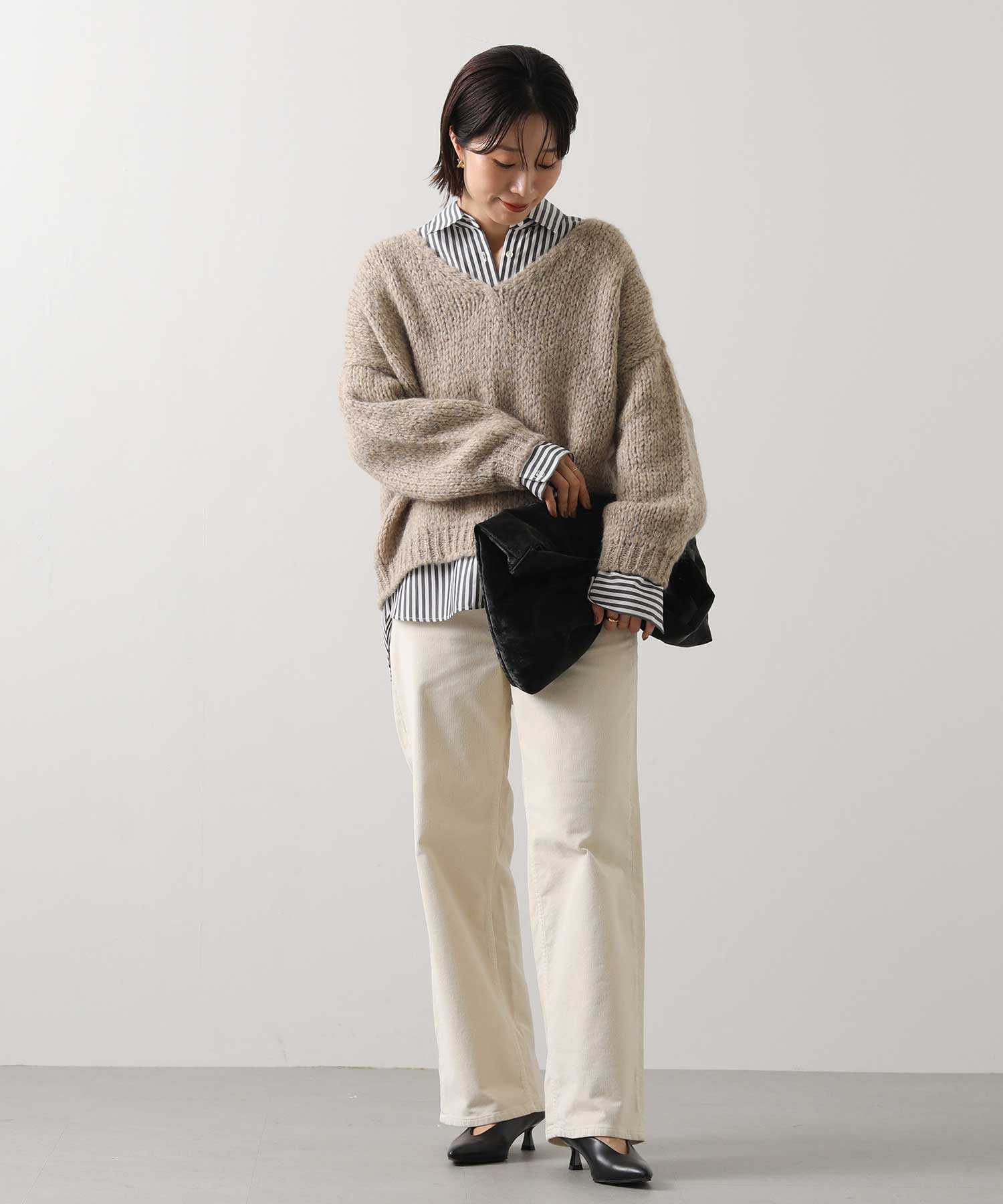 セールの終わりに買い足したいのは春をほんのり感じるアイテム。ふんわり柔らかな編地と柔らかいカラーでとても使いやすいニットは、春に向けて綿シャツをレイヤードするのもおすすめです。まだまだ寒いので防寒しつつ、色や素材感で春に向けて準備したいですね!