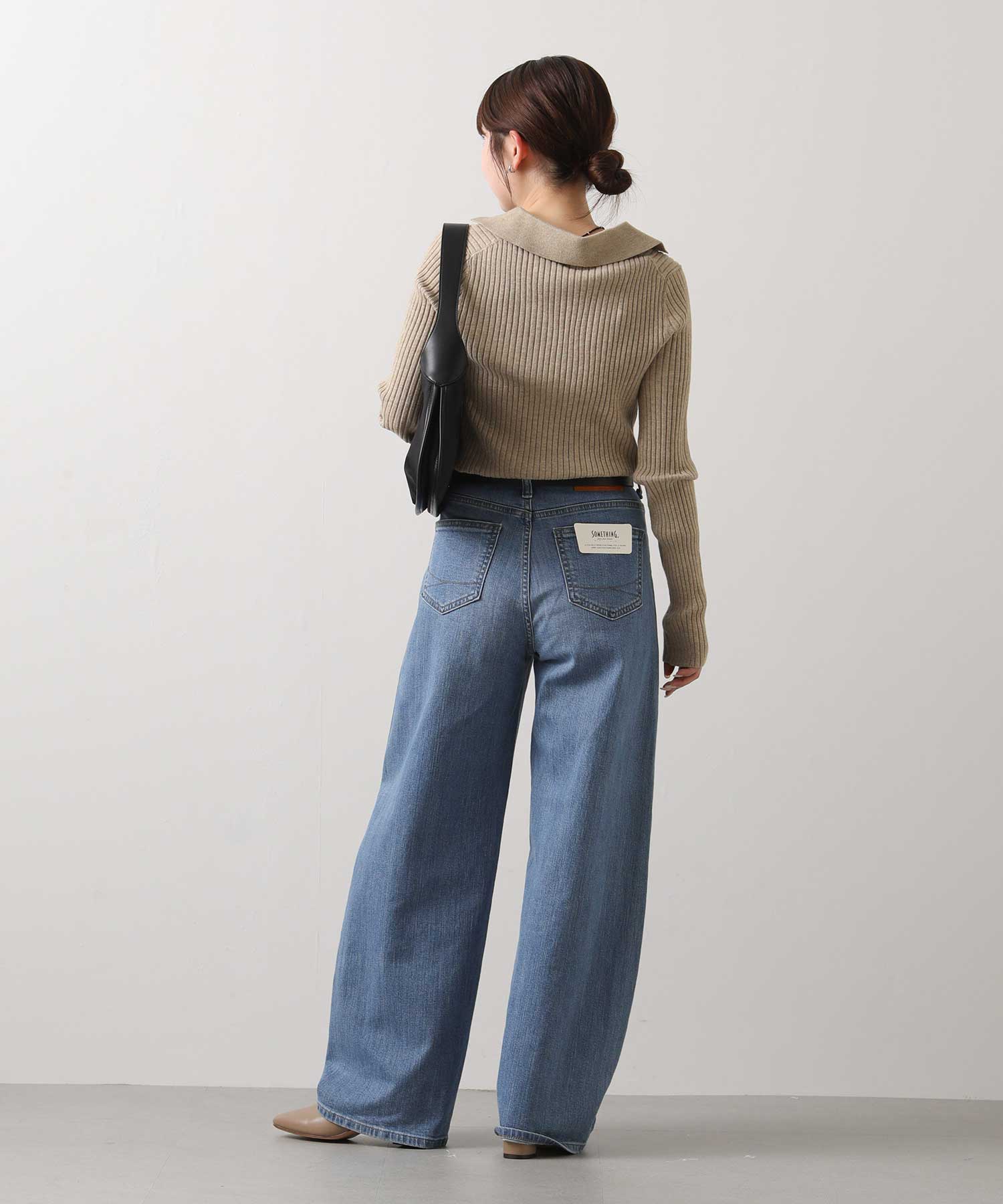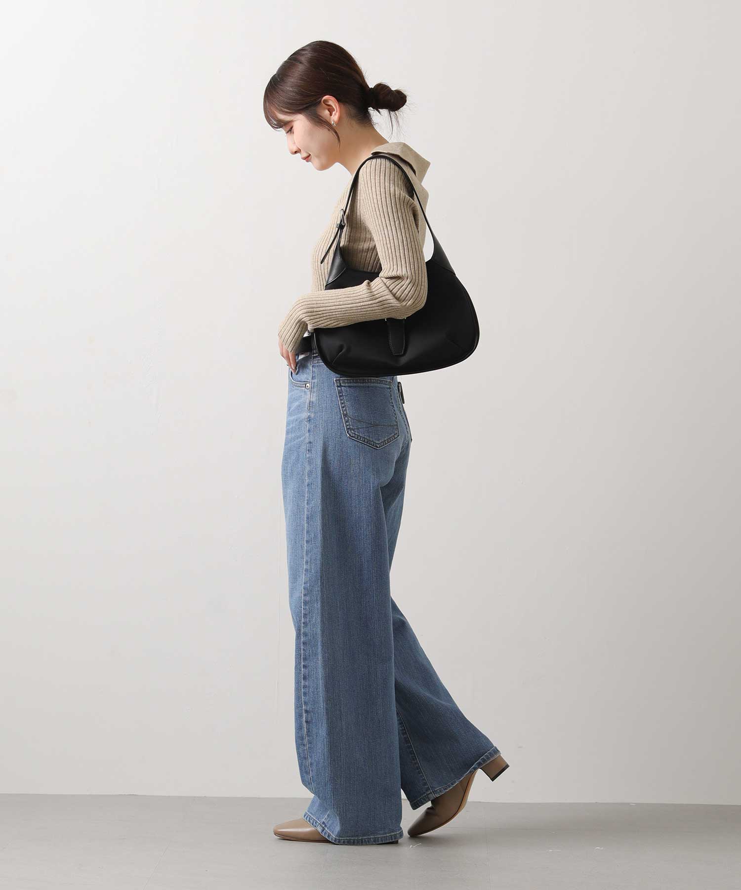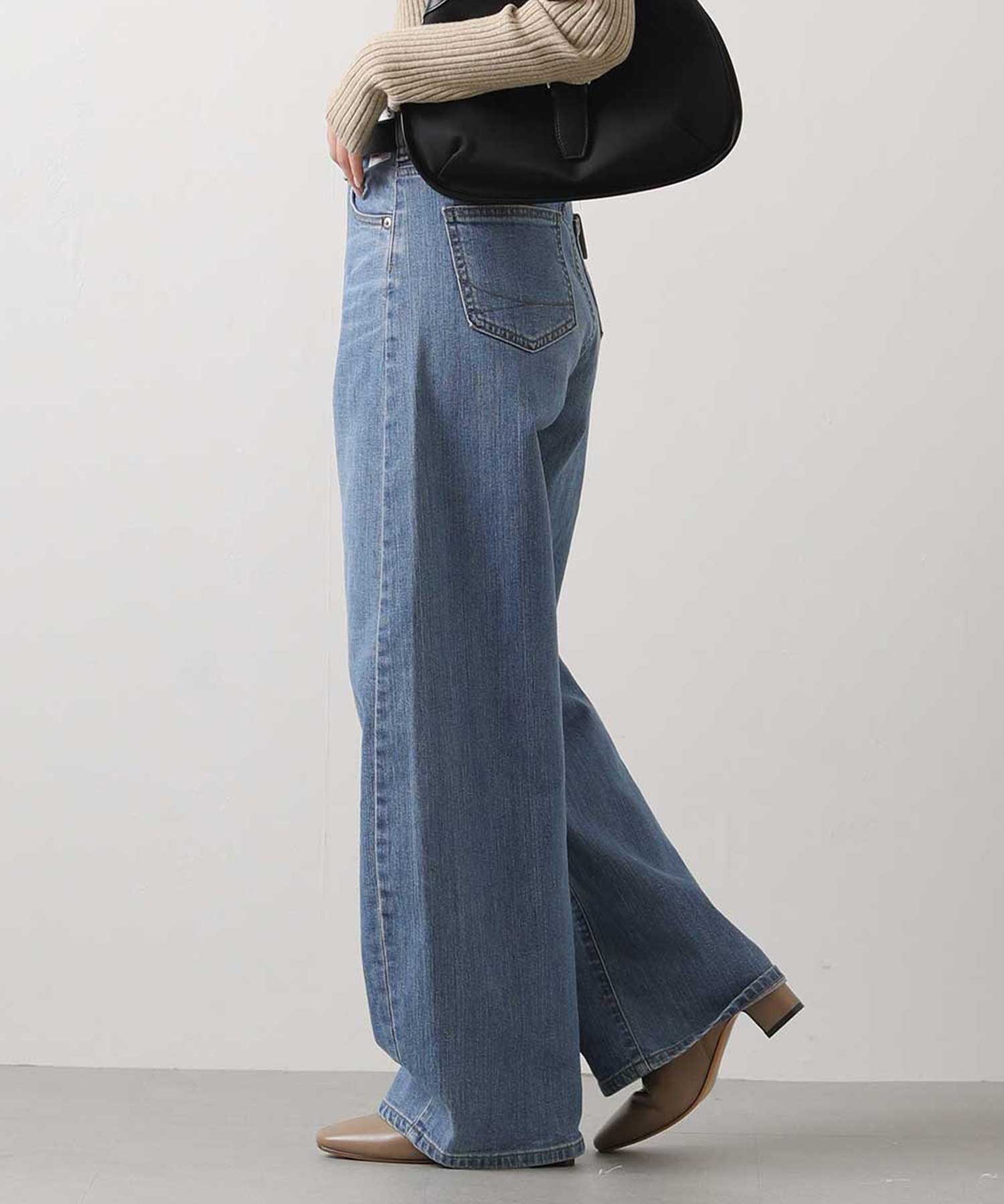 顔周りをスッキリと魅せてくれるテーラーカラーのリブニット。ブルーデニムを合わせると春らしい装いに仕上がります。カーブがオシャレなデニムは、柔らかく、伸びが良い素材で穿きやすいのも嬉しい。