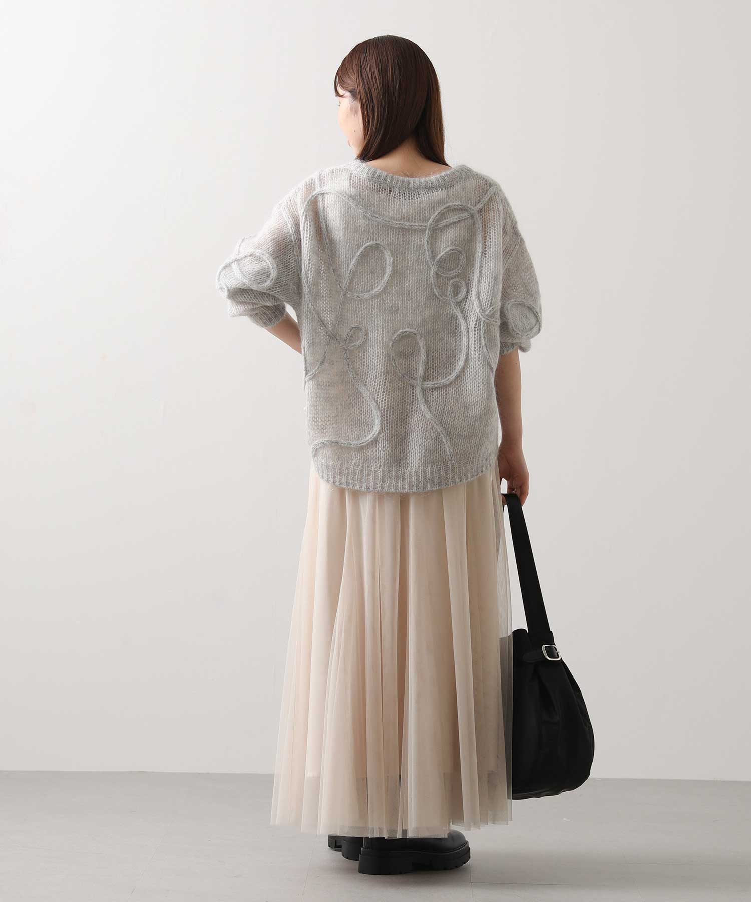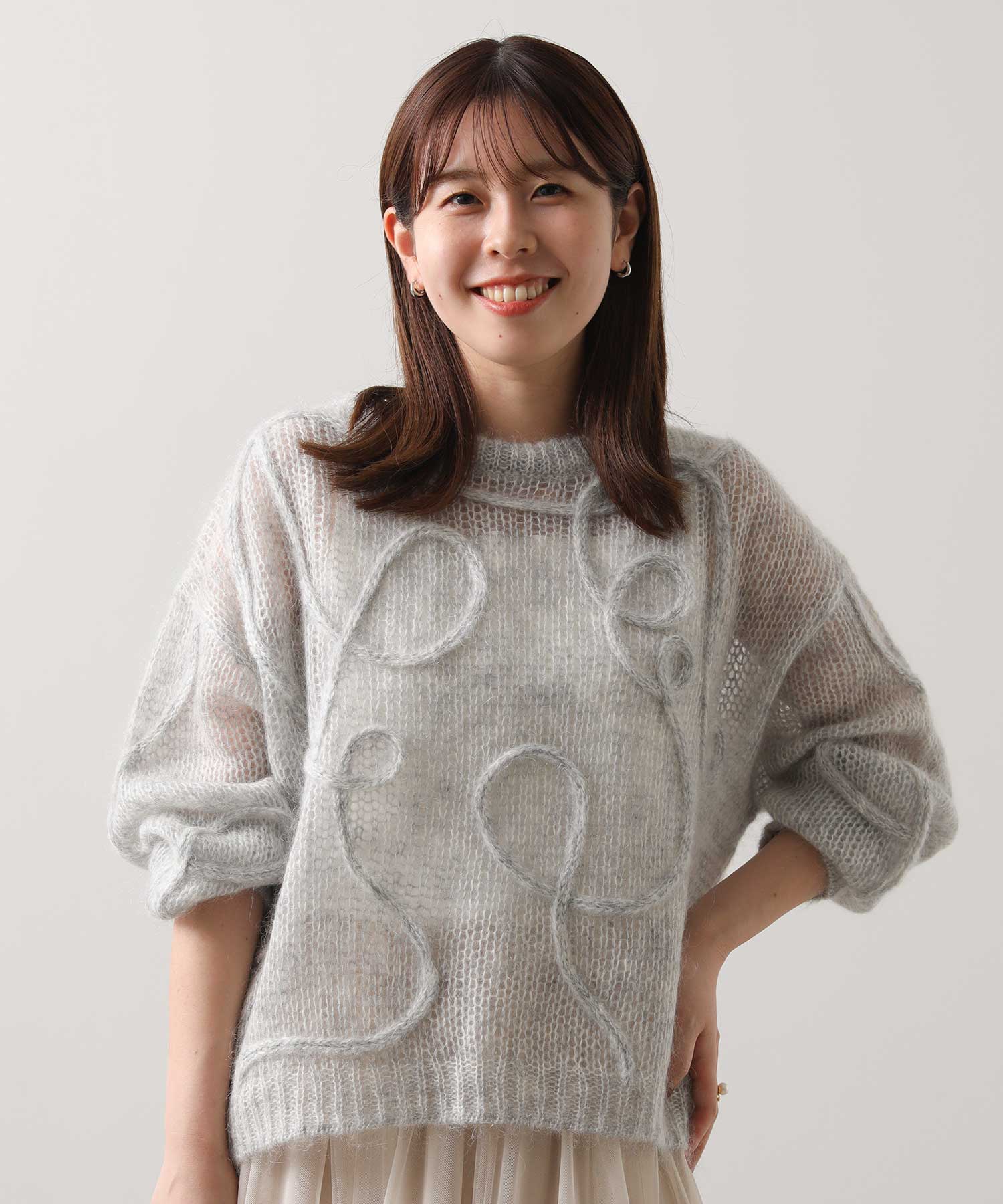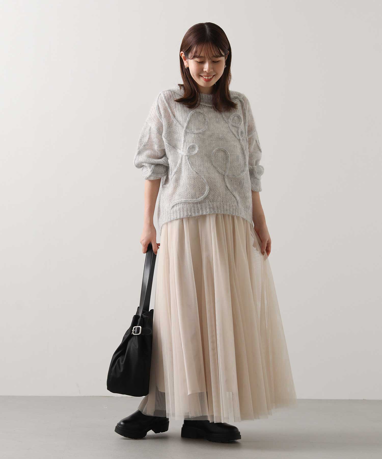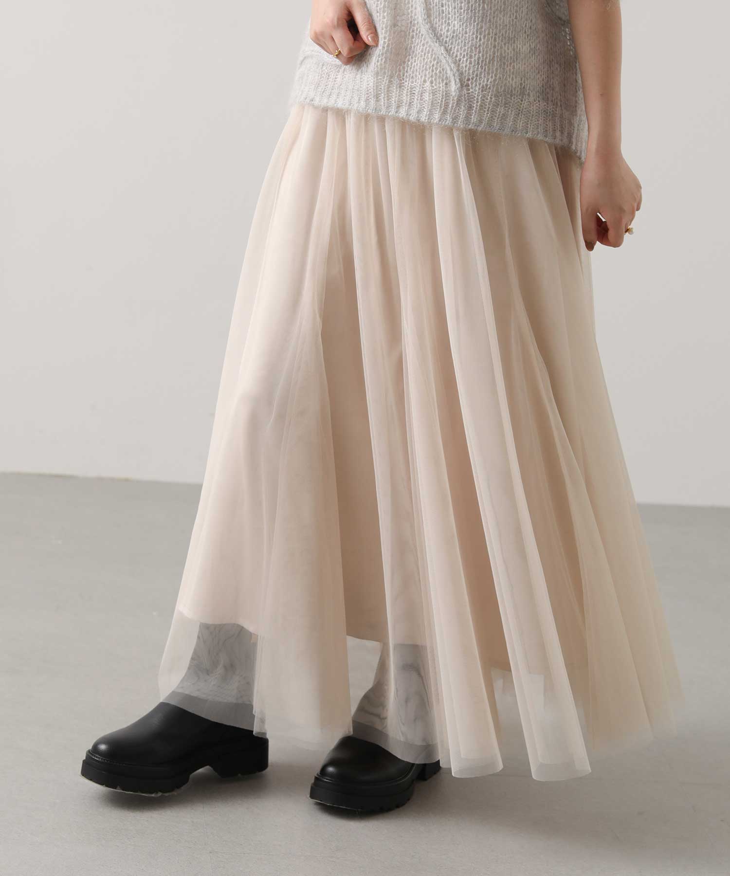 ニットとも相性の良いチュールスカートは、骨格ウェーブさんが得意なアイテム。足元に透け感がでて軽ろやかな印象を与えてくれますよ。155cmで足首が見えるくらいの丈感&総ゴムでとても穿きやすいです。淡いカラーもこれからの季節にピッタリ。