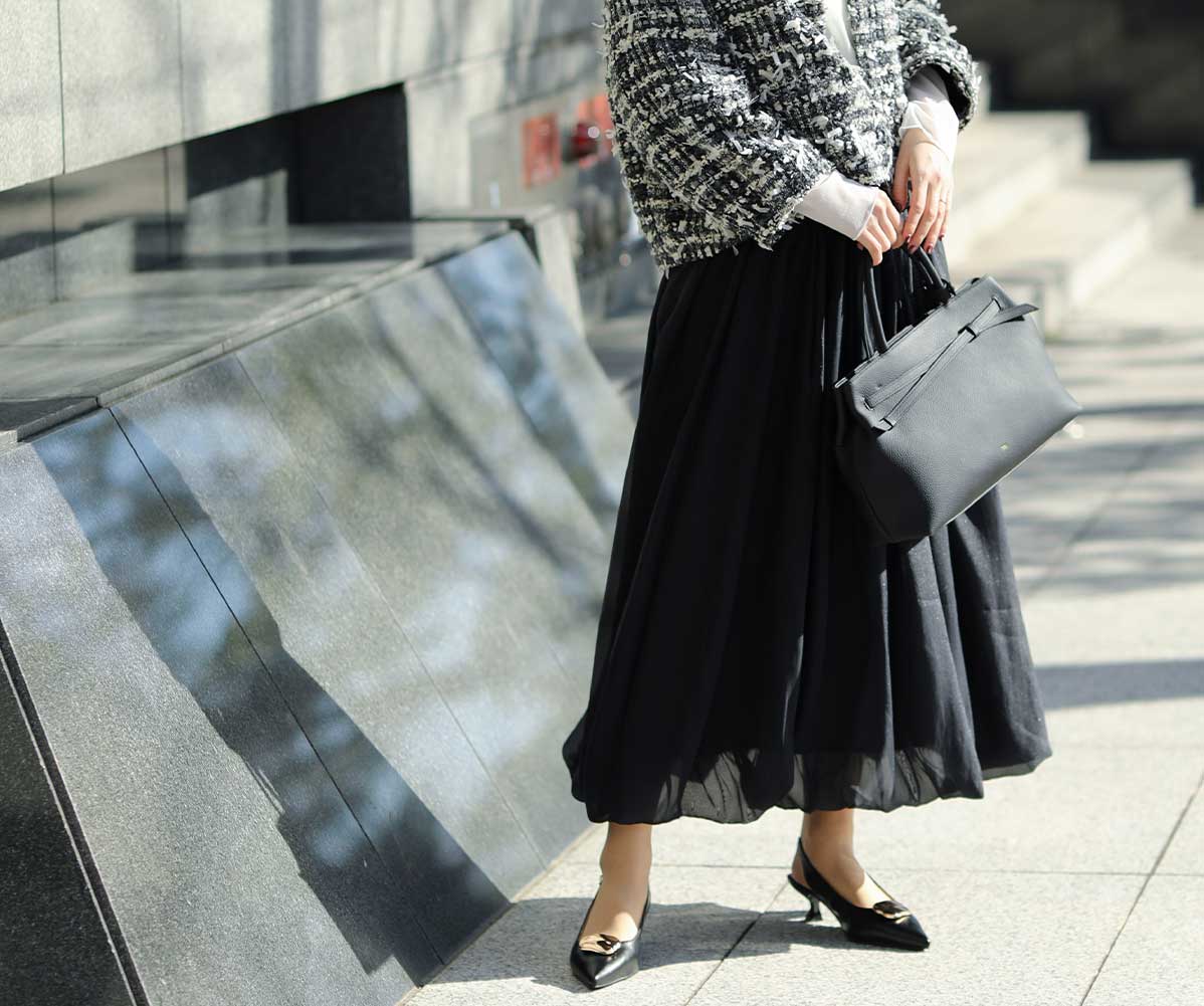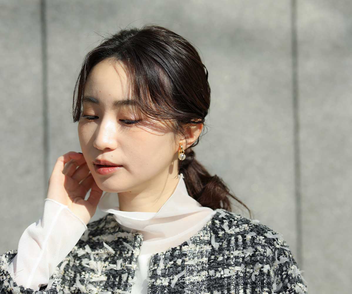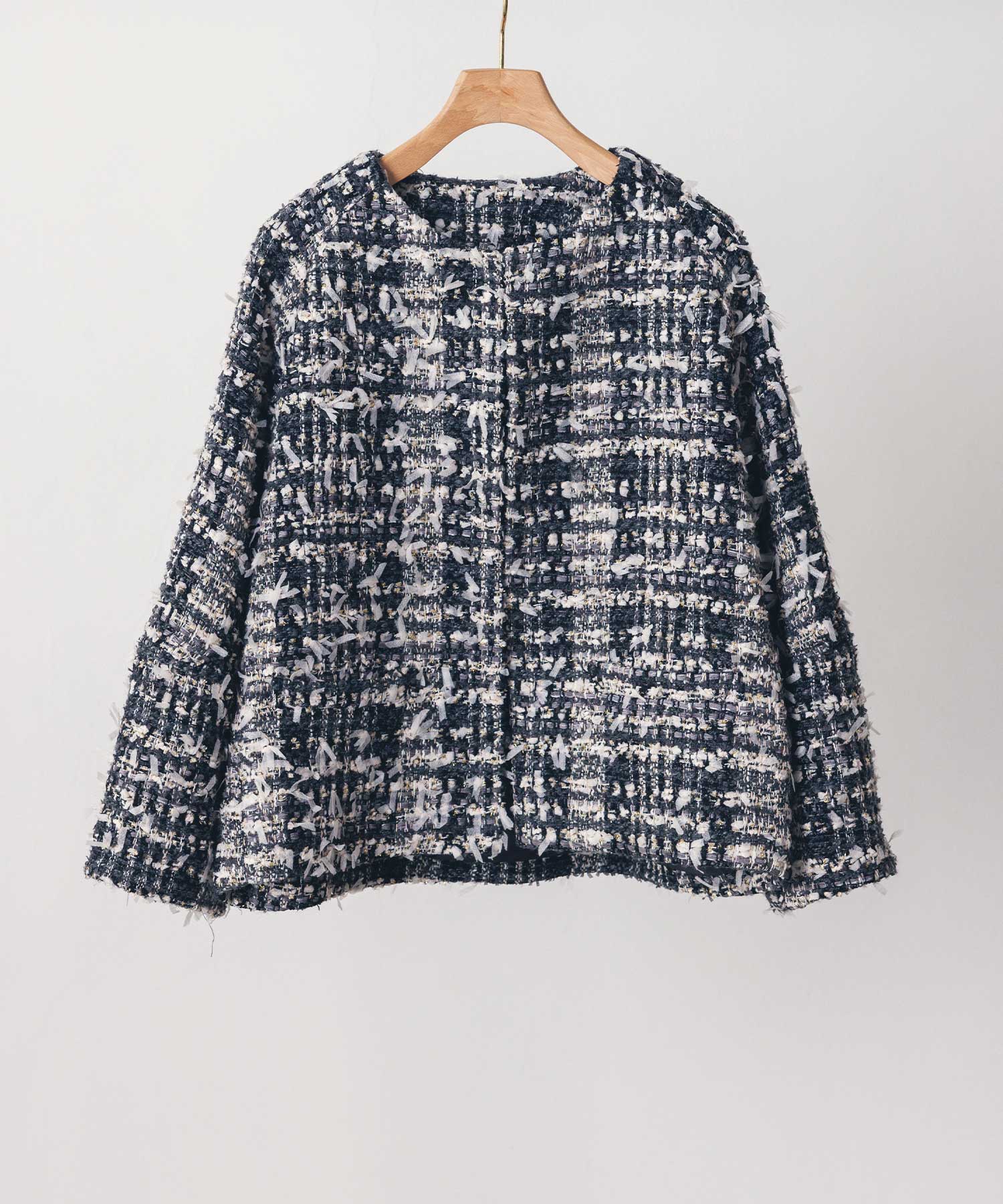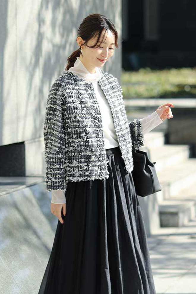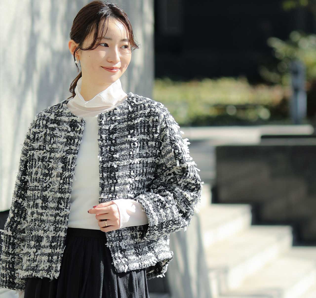 セレモニーからデイリーまで活躍する、リボンツイードジャケット。適度なハリ感と重厚感のある生地が、存在感と華やかさを演出してくれます。ふんわり広がるバルーンスカートを合わせて、定番の中にも鮮度のある仕上がりに。
