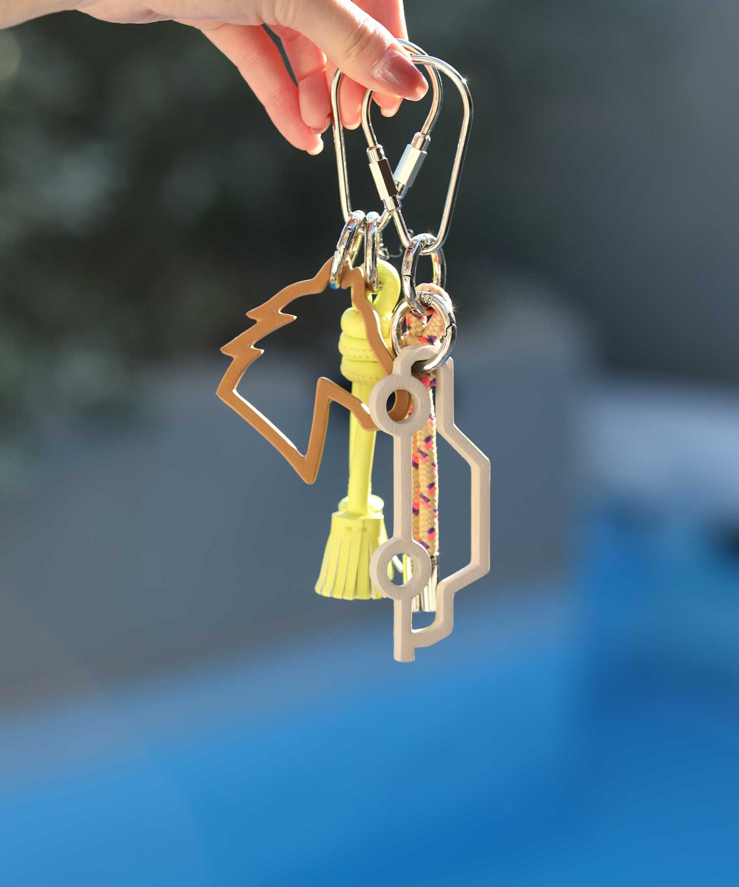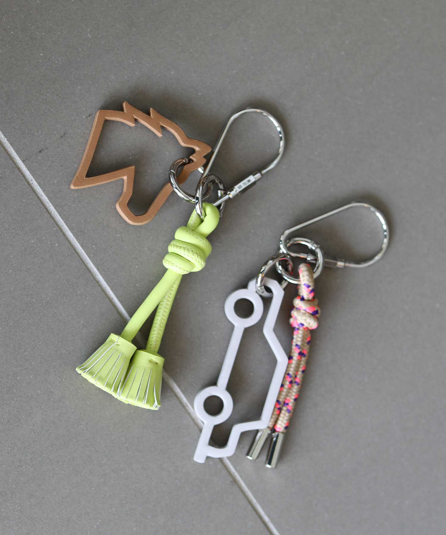 シンプルなバッグには、チャームやスカーフでアレンジするのが今の気分。ユニークなモチーフがアイキャッチに。