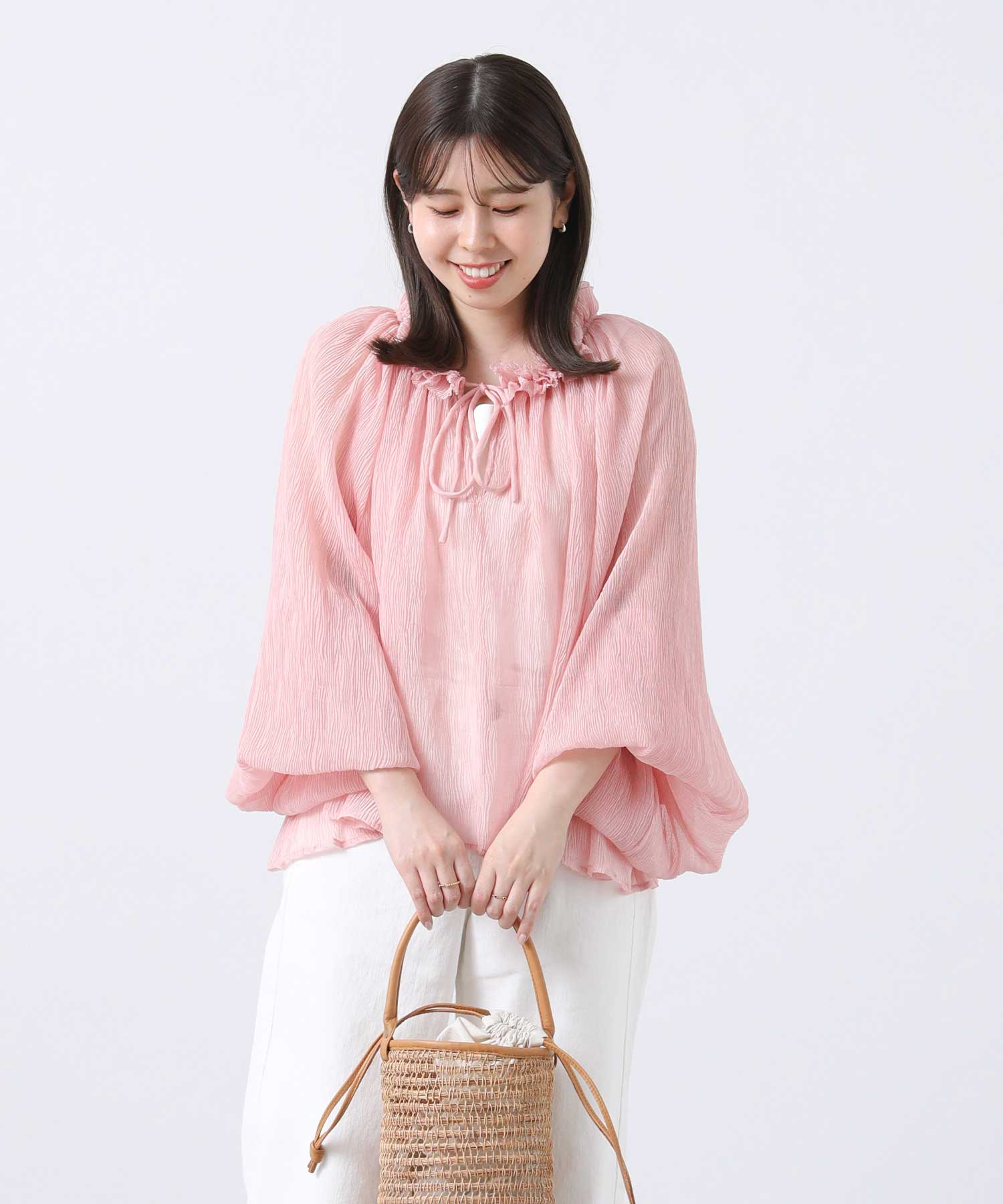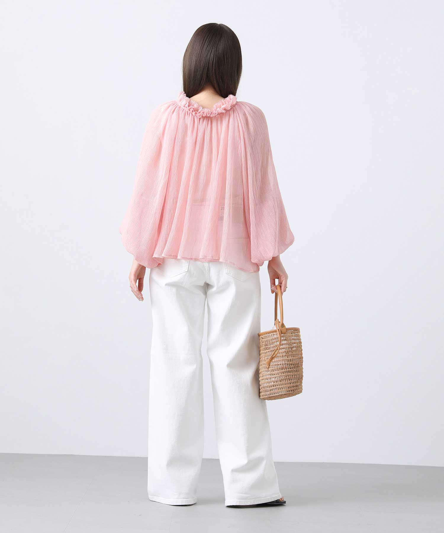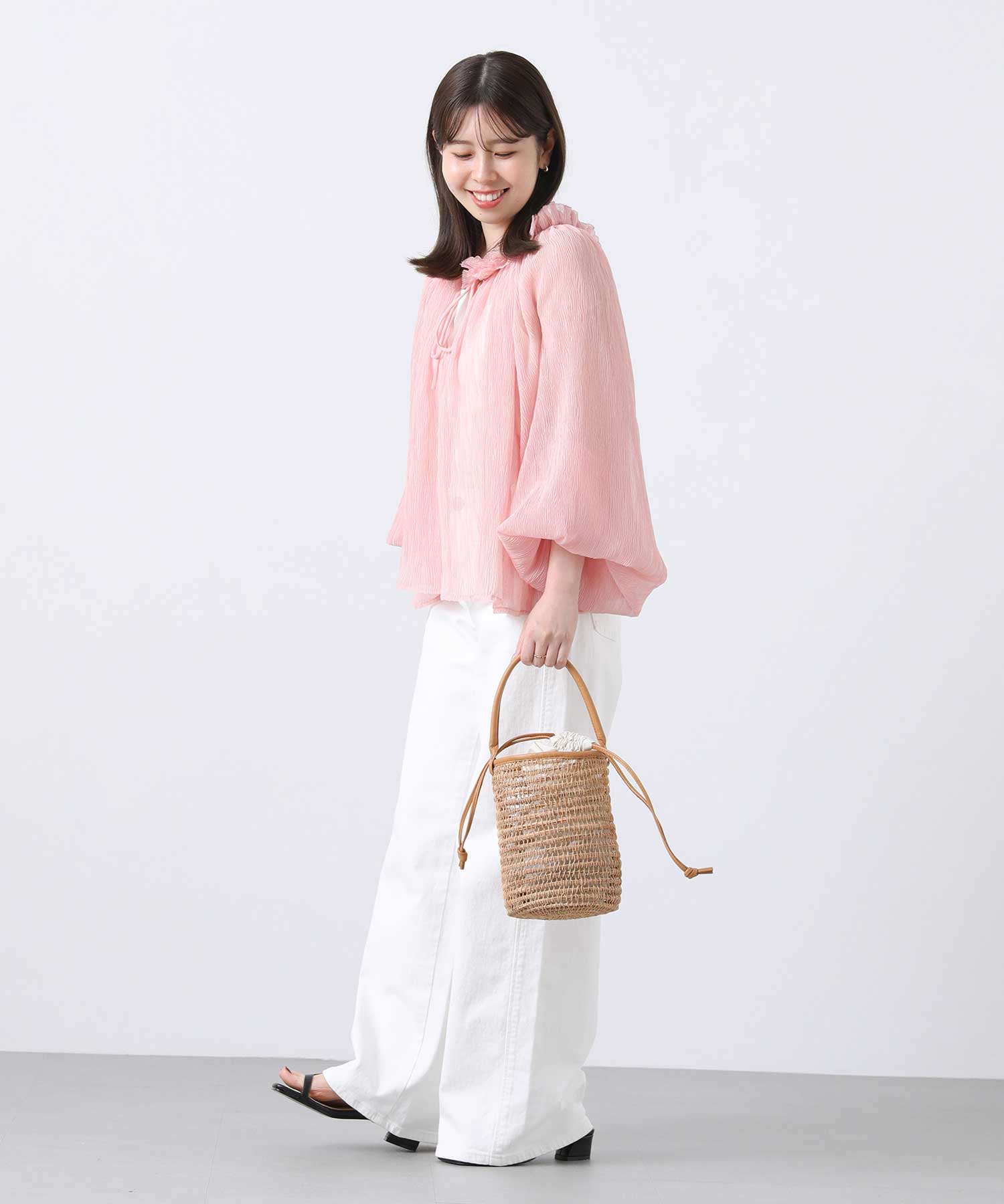 柔らかな素材感と、首元のギャザーデザインが華やかなブラウスは骨格ウェーブさんにピッタリ。春らしい色味のブラウスは春のお出かけシーズンにおすすめです。今年らしい白のデニムパンツはストレッチが効いていて穿きやすい!お休みの日はアウトレットモールでお買い物を楽しみたいです。